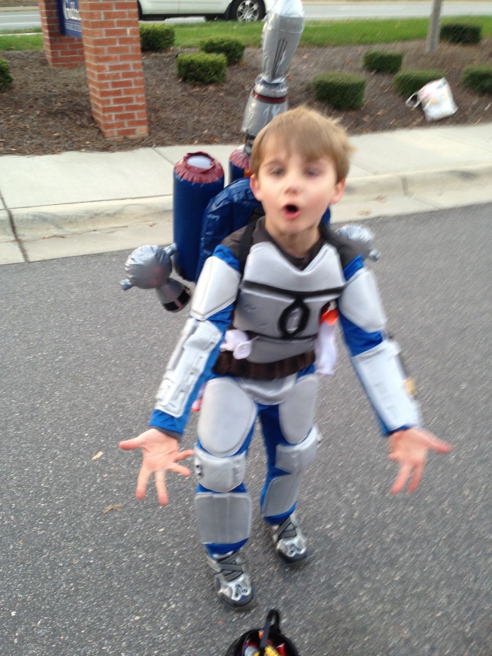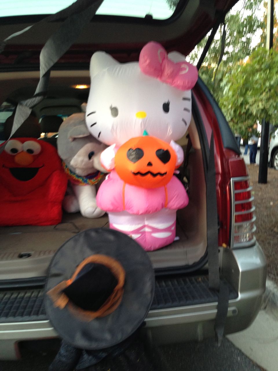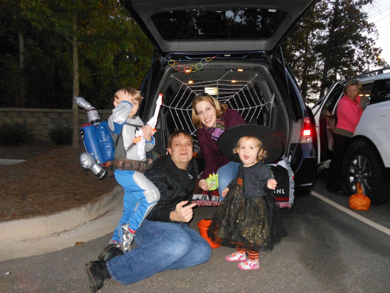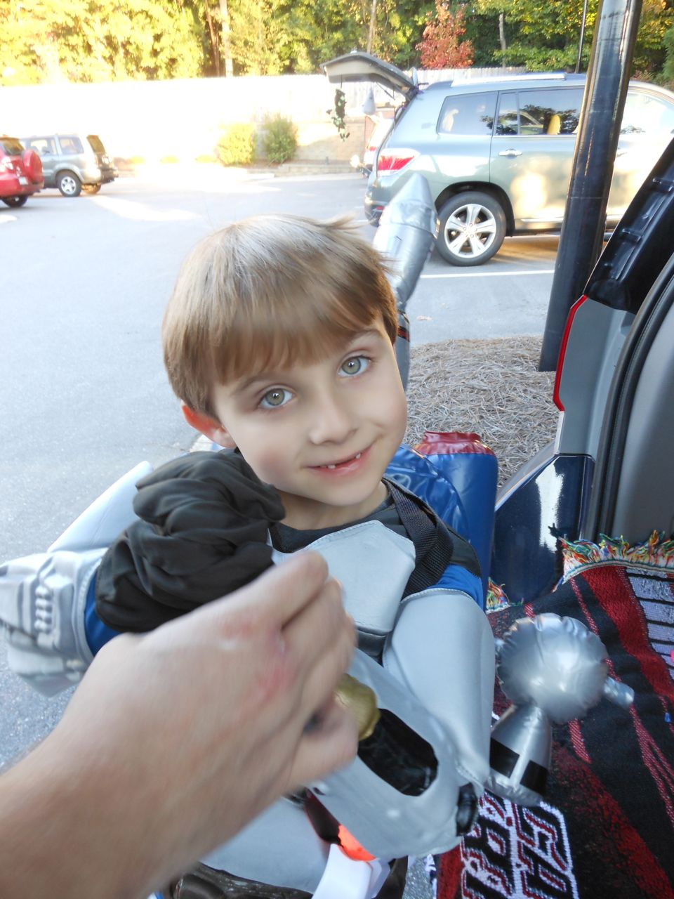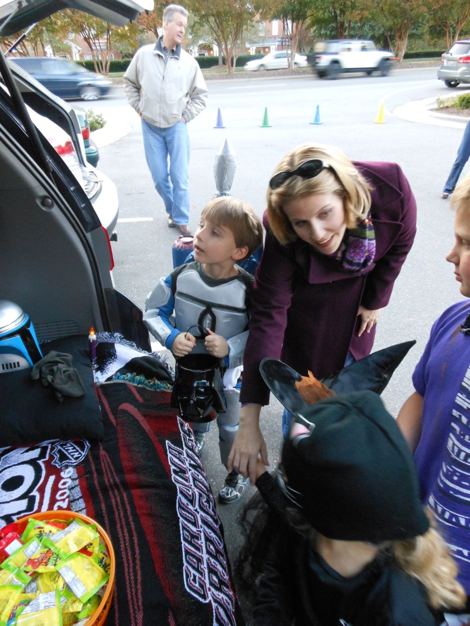 It’s another Trunk-or-Treat event at Goddard school! I’m really glad it’s not on Halloween itself this year–makes for less stress for everyone. 🙂 Brian was very excited to test out his Jango Fett costume, and Kendall was adorable in her sparkly witch outfit! She was power-walking all around the parking lot, pausing only to collect candy and to check out the Hello Kitty inflatable that someone had brought! Brian found Ty almost immediately and took off–they tore around the place, enjoying their status as big kids! Later, they wanted to hang out in the van and watch a movie. We were cool with that idea, at least we would know where they were! Much candy was given and collected, and we were (predictably!) the last family to leave the parking lot! Brian seems to love staying to the very end of Goddard events. 🙂