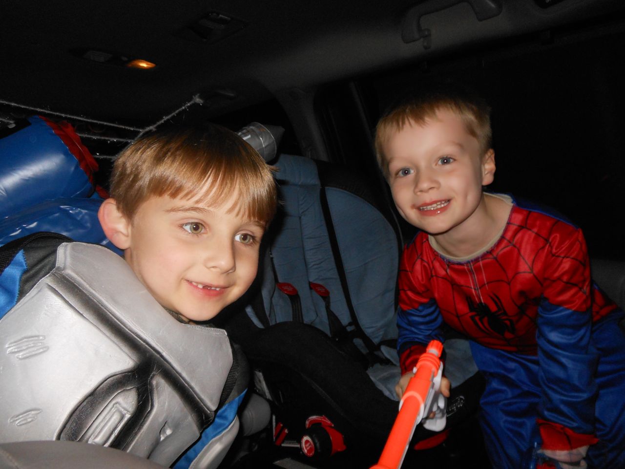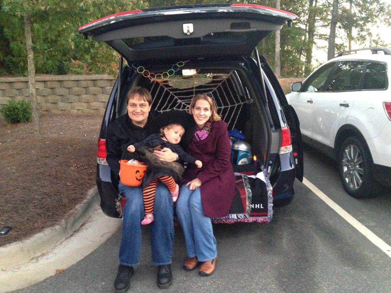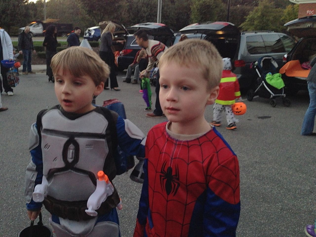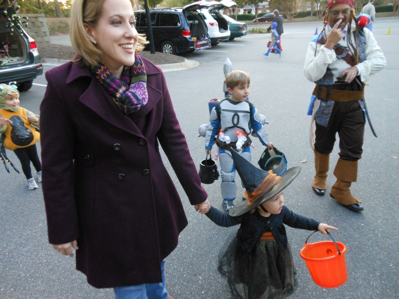 It’s another Trunk-or-Treat event at Goddard school! I’m really glad it’s not on Halloween itself this year–makes for less stress for everyone. 🙂 Brian was very excited to test out his Jango Fett costume, and Kendall was adorable in her sparkly witch outfit! She was power-walking all around the parking lot, pausing only to collect candy and to check out the Hello Kitty inflatable that someone had brought! Brian found Ty almost immediately and took off–they tore around the place, enjoying their status as big kids! Later, they wanted to hang out in the van and watch a movie. We were cool with that idea, at least we would know where they were! Much candy was given and collected, and we were (predictably!) the last family to leave the parking lot! Brian seems to love staying to the very end of Goddard events. 🙂