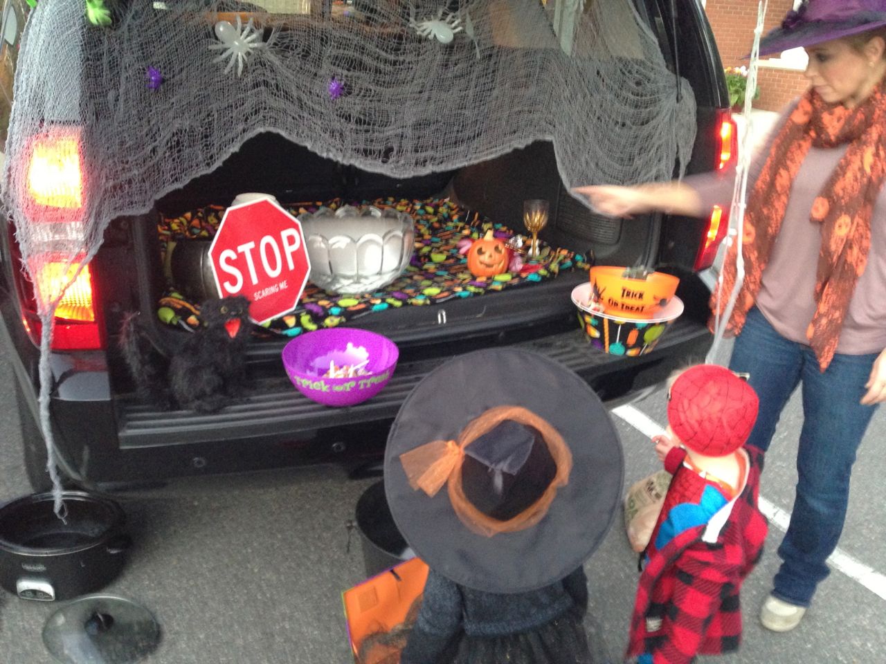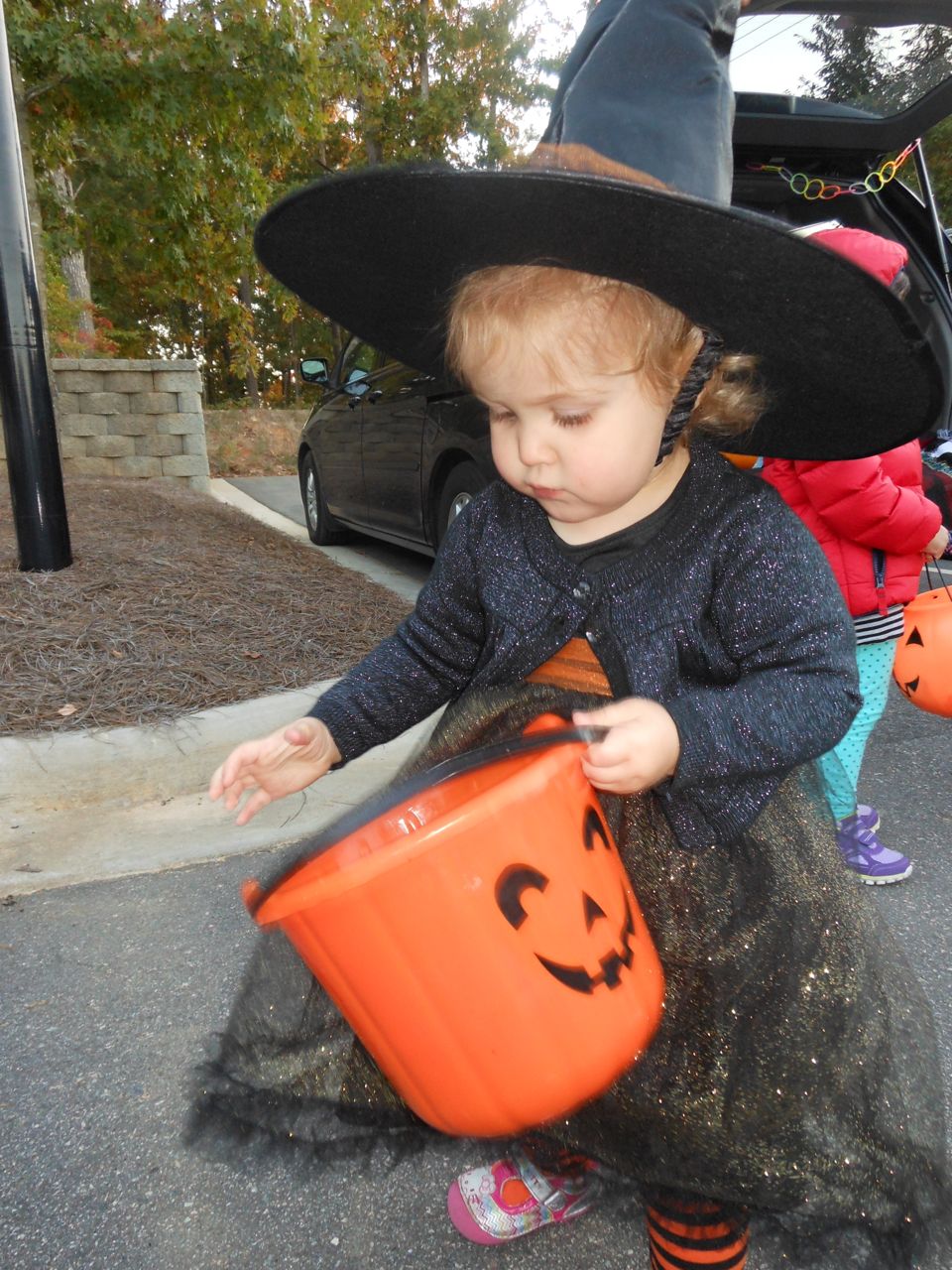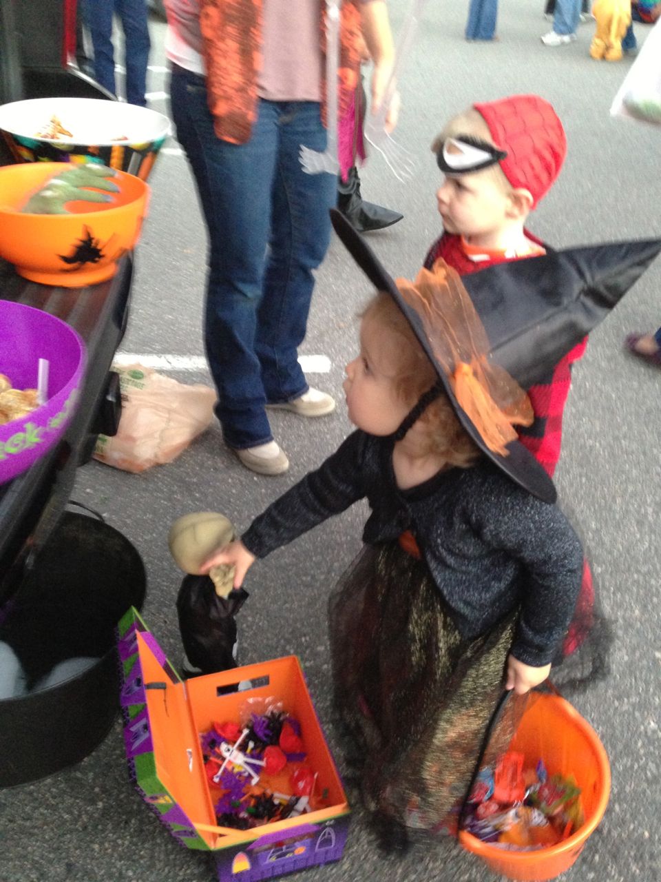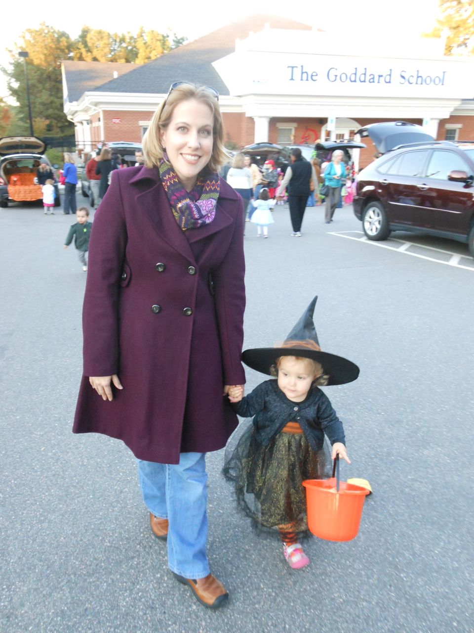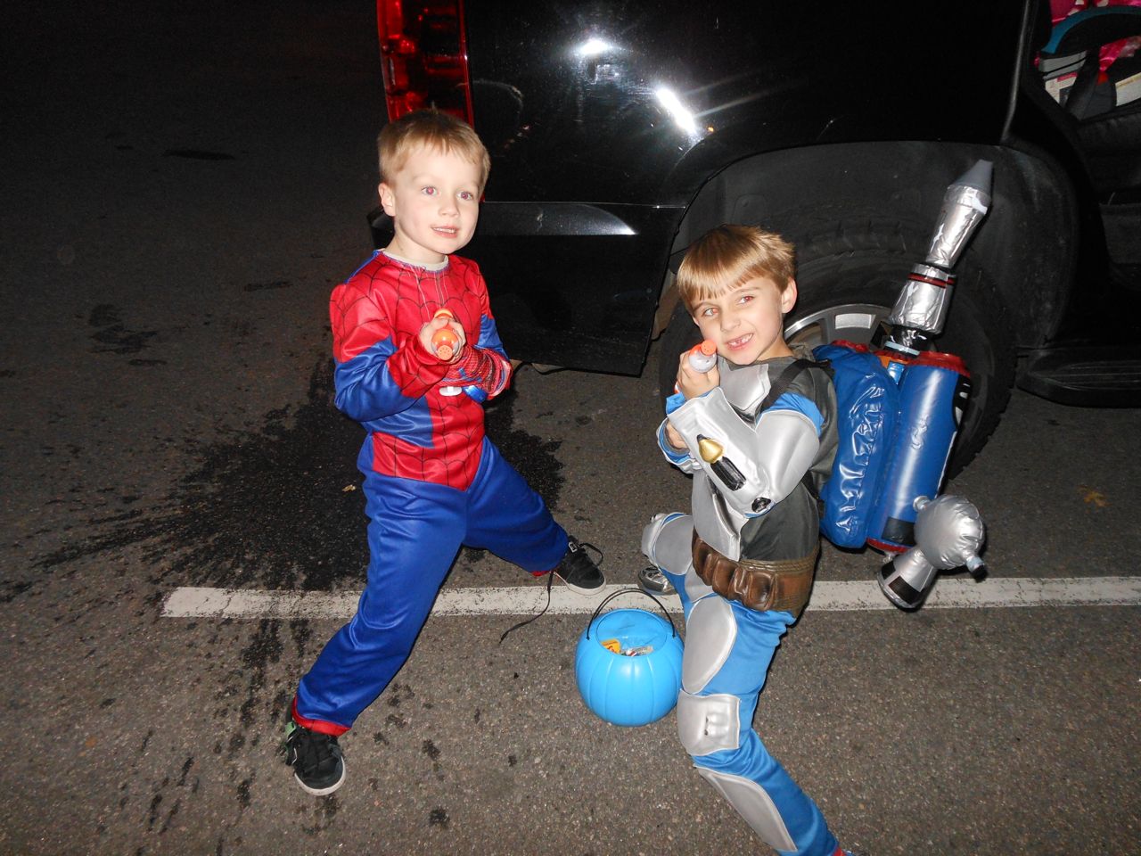 It’s another Trunk-or-Treat event at Goddard school! I’m really glad it’s not on Halloween itself this year–makes for less stress for everyone. 🙂 Brian was very excited to test out his Jango Fett costume, and Kendall was adorable in her sparkly witch outfit! She was power-walking all around the parking lot, pausing only to collect candy and to check out the Hello Kitty inflatable that someone had brought! Brian found Ty almost immediately and took off–they tore around the place, enjoying their status as big kids! Later, they wanted to hang out in the van and watch a movie. We were cool with that idea, at least we would know where they were! Much candy was given and collected, and we were (predictably!) the last family to leave the parking lot! Brian seems to love staying to the very end of Goddard events. 🙂