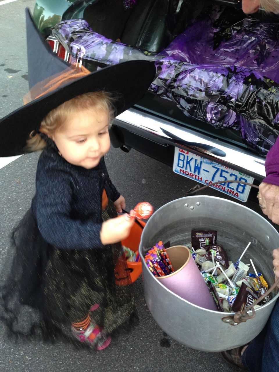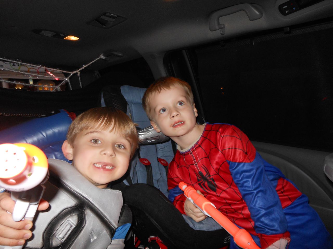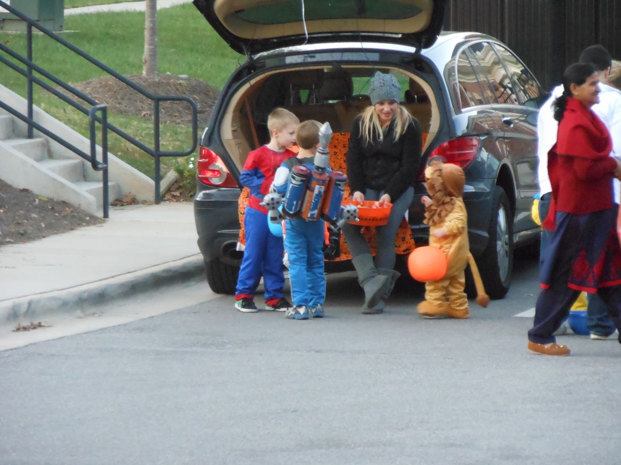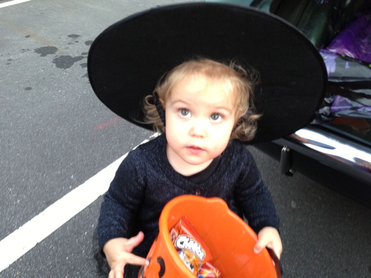 It’s another Trunk-or-Treat event at Goddard school! I’m really glad it’s not on Halloween itself this year–makes for less stress for everyone. 🙂 Brian was very excited to test out his Jango Fett costume, and Kendall was adorable in her sparkly witch outfit! She was power-walking all around the parking lot, pausing only to collect candy and to check out the Hello Kitty inflatable that someone had brought! Brian found Ty almost immediately and took off–they tore around the place, enjoying their status as big kids! Later, they wanted to hang out in the van and watch a movie. We were cool with that idea, at least we would know where they were! Much candy was given and collected, and we were (predictably!) the last family to leave the parking lot! Brian seems to love staying to the very end of Goddard events. 🙂