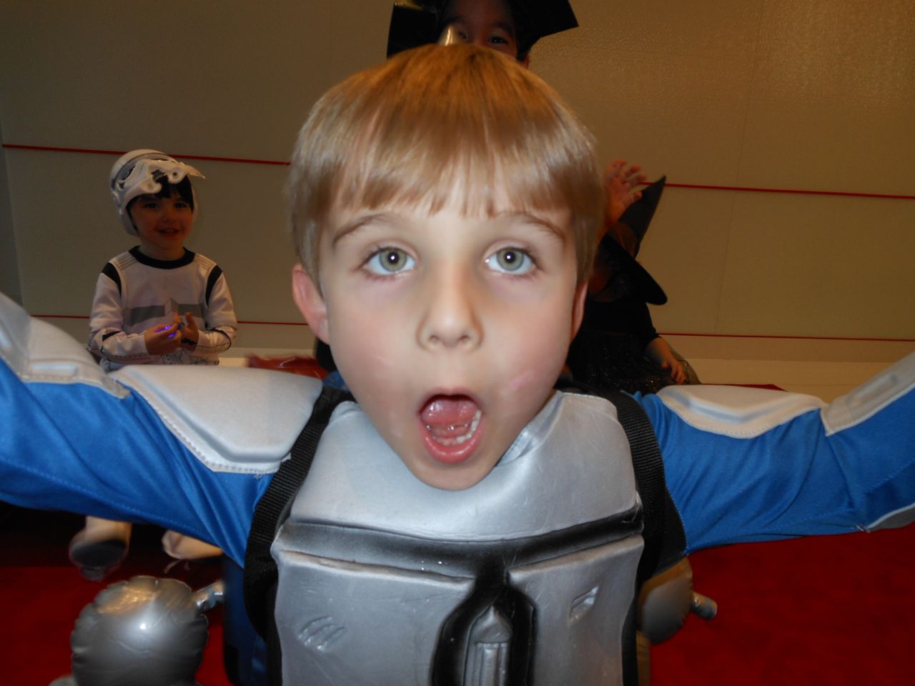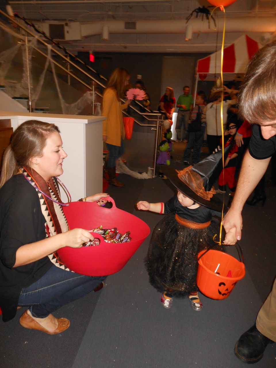 Tonight was the big Halloween party at Red Hat! It was a little different this year, being at our new HQ, and with some restrictions on the number of folks allowed to attend. We nearly didn’t get our wristbands, but thanks to some hardcore near-tears begging on my part (“They’ve never missed a Red Hat Halloween, every year since they were born!”), we secured a spot for the kids. 😉 It took some wrangling to get everyone where they needed to be in time for the party, and I surprised Kendall by picking her up earlier than she expected. I received a pretty epic welcome from Kendall.. She yelled “Mommeeeeeee!” and ran toward me with her arms out for a hug–only to quickly dodge and run away laughing at the last second! Silly girl. She was so proud bringing me her daily sheet–what a sweet smile. Then, we were off to the tower, quickly dressed the kids and hustled inside to the party, where the real chaos began! I’ve got to say, for limited attendance, the place sure was packed. 😉 There were games, snacks, candy, balloons, face painting, cake pops, a haunted house, glitter tattoos, even more carnival games, just a ton of things to do. We were pretty excited to see Nico and Logan dressed up as Darth Vader and a Stormtrooper (and I loved seeing twin babies Luke and Leia!) Brian got an orange pumpkin glitter tattoo on his hand. Both kids got cotton candy, and we all had a big laugh at how enthusiastically Kendall ate hers up! We did just about everything, and the kids ended up with a huge pile of candy and prizes. All too soon, it was time to head home. We had a bit of drama in the lobby, where Brian lost his balloon and it floated up out of reach. The front desk staff, Brandon, and some of his engineering buddies worked out a solution, and used the umbrella bag holder to snag it! Then, Kendall had a full-on meltdown, as she realized she didn’t have a balloon, collapsing face-first onto the carpet into a fluffy pile of glitter and tulle (we couldn’t even see her under that hat!) A kind mom and older kid offered up their balloon to her, and that made everything better. Once we got home, Kendall was off to bed fairly quickly, and Brian and I tried making a Hurricanes-themed pumpkin. It turned out pretty good, I think! Also: a picture of Brian’s splint–he was a trooper (ha! get it?) about wearing it under his costume! It actually worked with the armored outfit pretty well. Kendall in her crib this morning.. Brandon working on the Lego haunted house.. Kendall checking out the Hello Kitty pumpkin we made. Plus, a scan of one of Brian’s many cards that cracked me up. I just loved the fun pumpkin with glasses and all the exclamation points. October! Fall! 😀