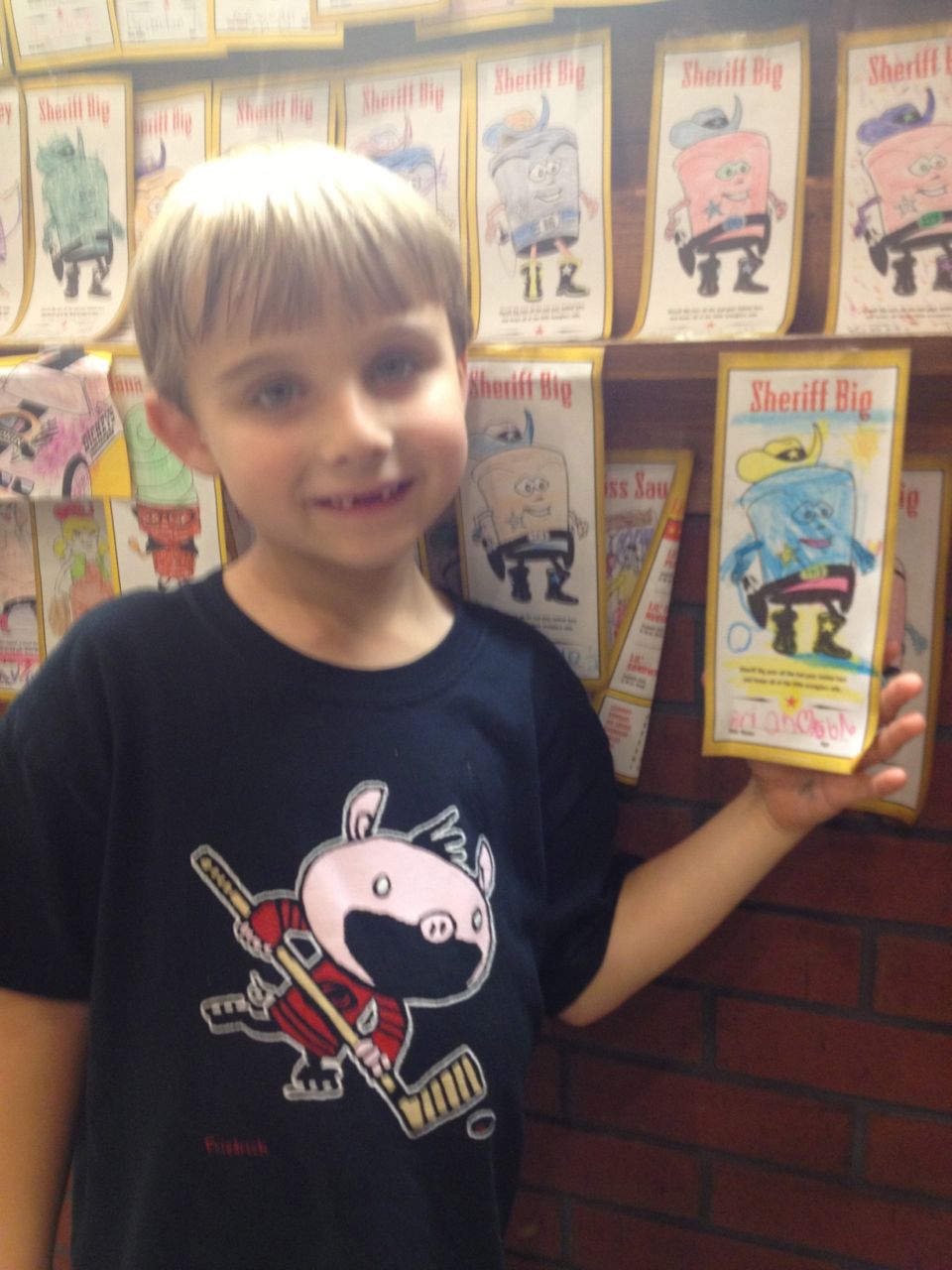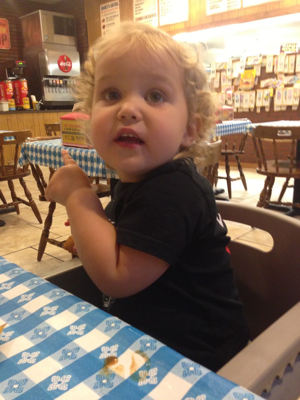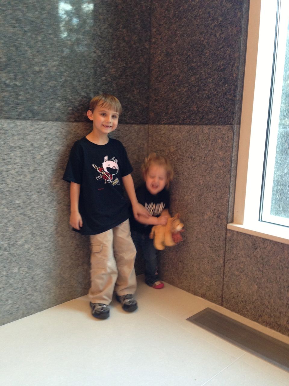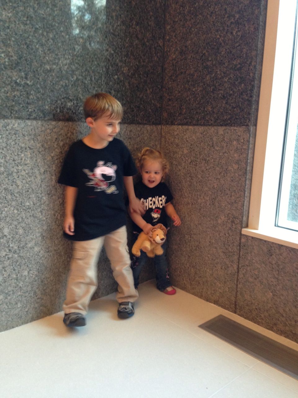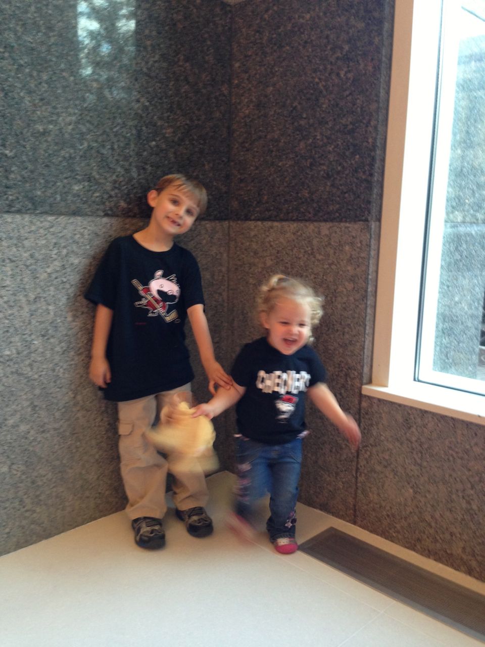 Tonight was a pretty special Friday night for everyone!  We started off with Brandon picking up the kids and bringing them to meet me at Red Hat Tower.  They were so cute when I found them playing in the lobby, both in their hockey t-shirts!  Best sight in the world, after a tough day at the office.  We got dinner together at Dickey’s BBQ, and ate way too much–but still managed to find a little room for the free vanilla soft-serve. 😉  Brian was both intrigued and a little skeptical of the dinosaur-shaped chicken nuggets, but Kendall just wolfed them down, along with fried okra and hush puppies.  We’re not going to win any parent-of-the-year awards for the deep-fried madness of it all, but hey, we usually don’t eat like that.  She also liked the green beans and barbecue beans (she’s so adorable when she yells out “bean!” with such excitement.  She also does that for black beans, green peas, baked beans, cannellini, and edamame–that’s my girl!  So glad she has a diverse palate.)  Brian liked the coloring sheets they had, and created one of his own–he wanted to hang it up in the store with the others, and was so proud when the staff gave him some tape and said he could put it wherever he wanted. 🙂