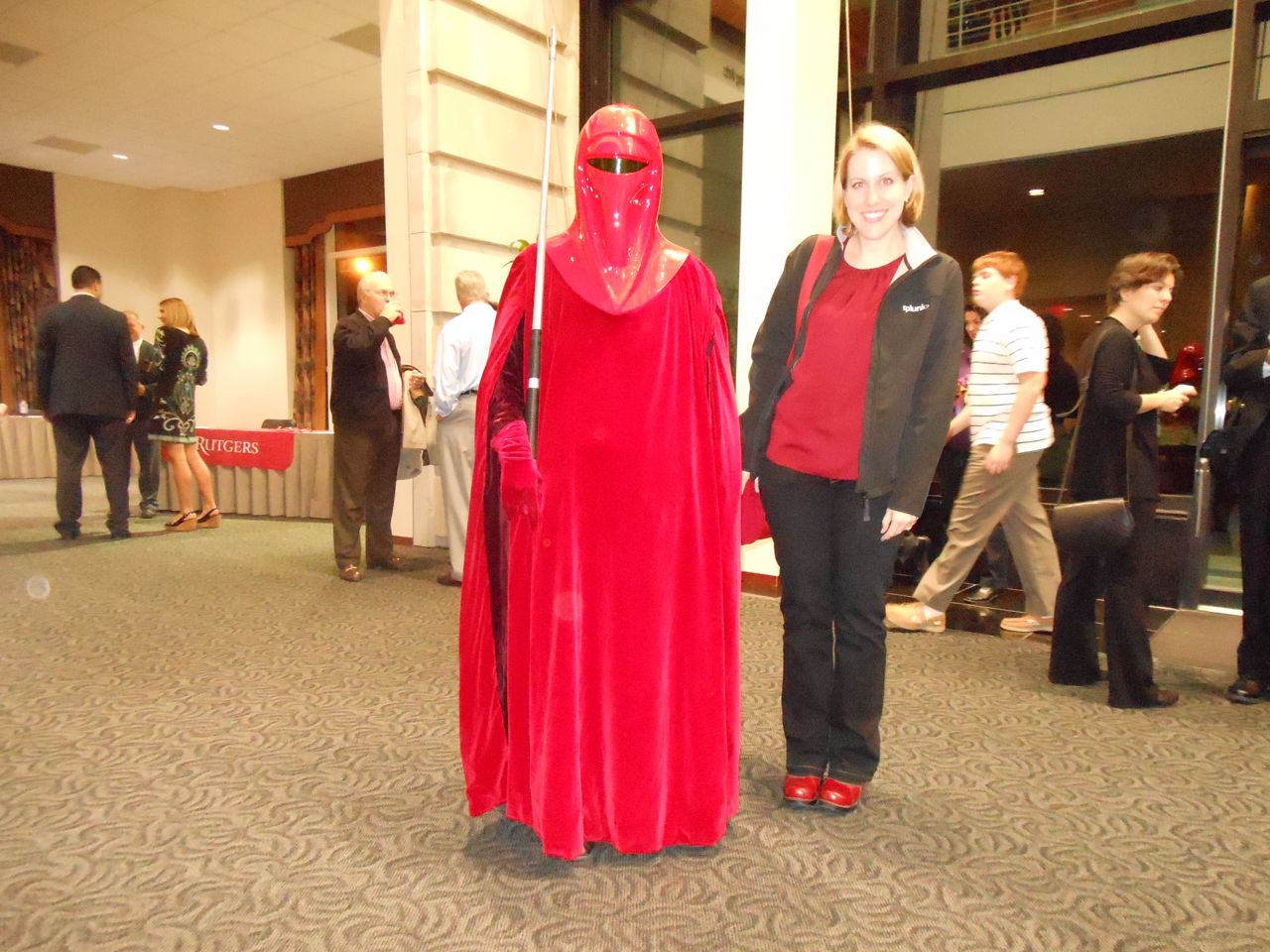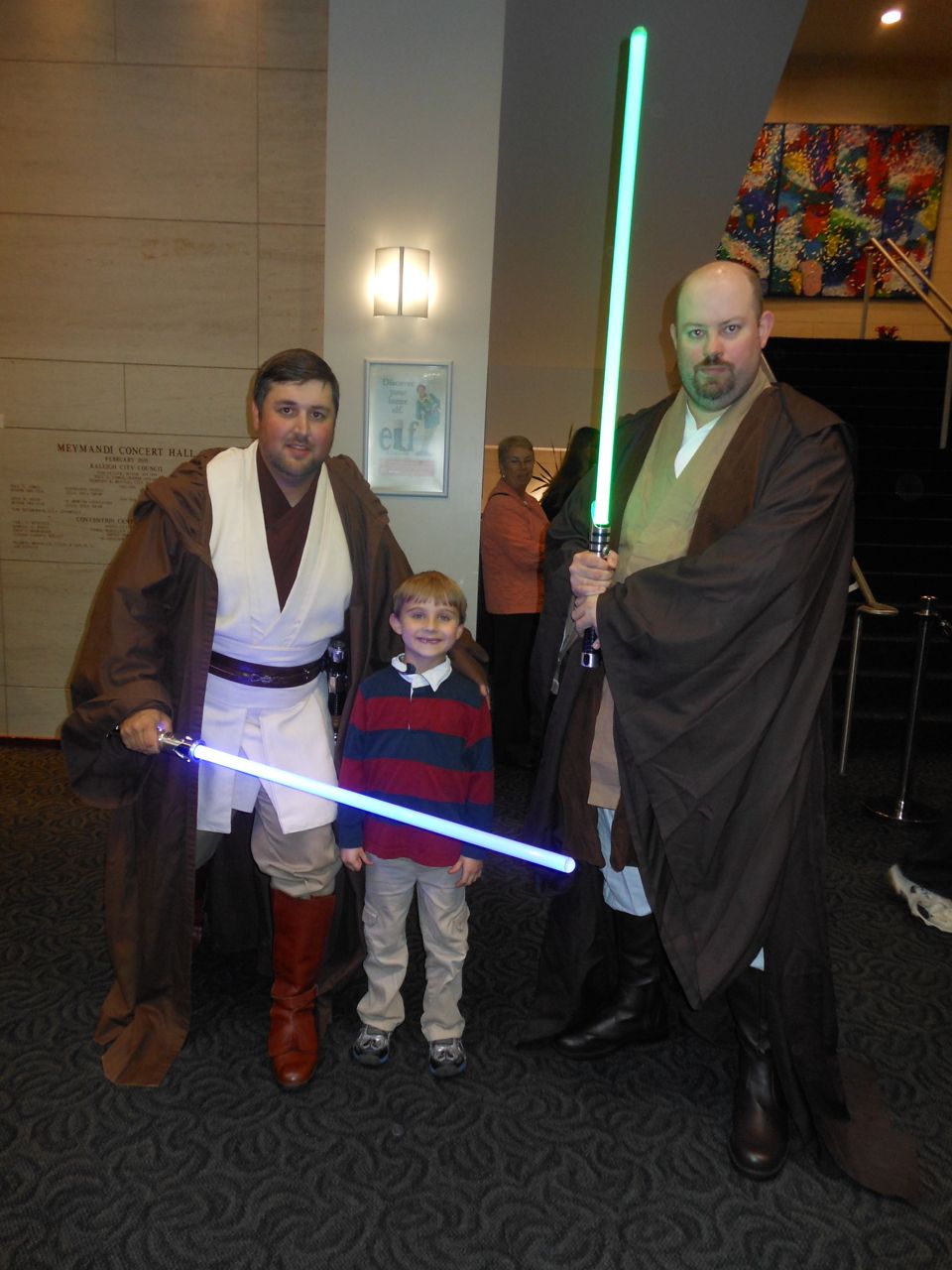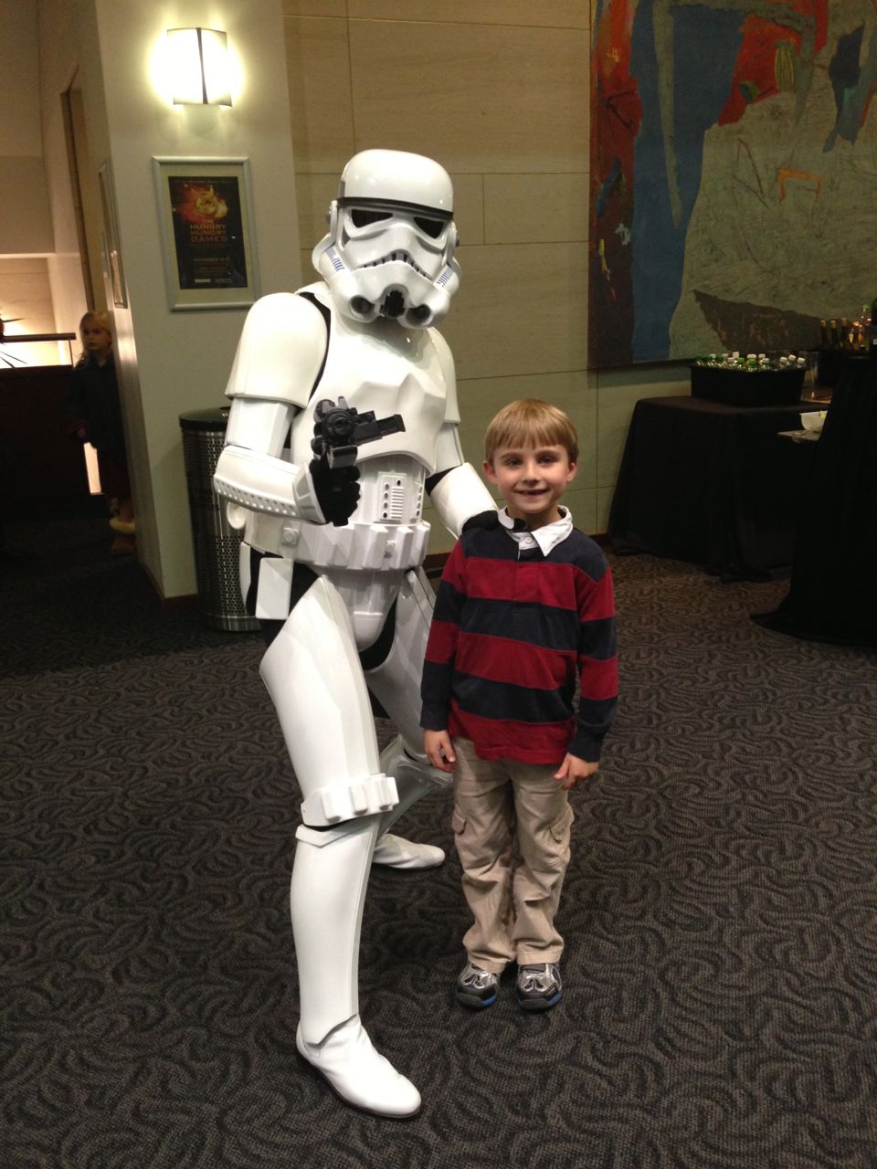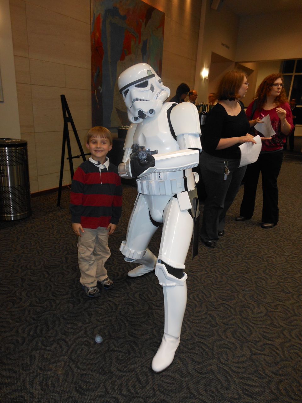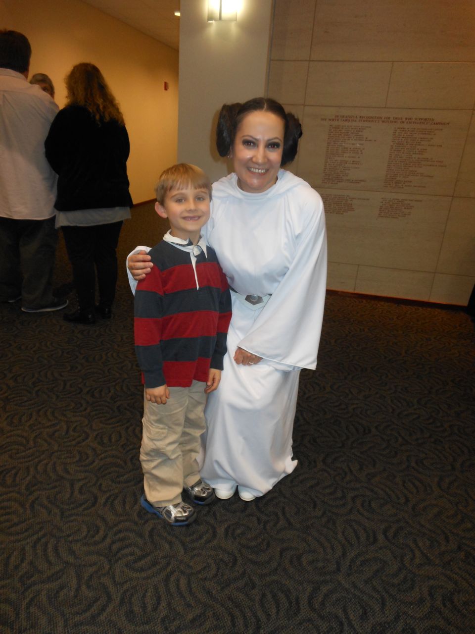 Our dinner adventure was just the beginning, and afterward, we paired off for the rest of the evening’s activities.  Brian and I headed over to Meymandi to see the NC Symphony perform a selection of John Williams’s movie classics (including, you guessed it, a number of pieces from Star Wars!)  After going to the Sci-Fi Spectacular, Brandon and I felt bad that Brian missed out on seeing his favorite movie music performed live, and especially that he missed out on the costumes of the 501st Legion.  So, when we saw that they’d be doing a John Williams show on a Friday night and the 501st would be in attendance, we knew we had to take him!  We arrived early enough to have a couple photo-ops, which was really exciting for Brian!  We saw a good number of characters, including some Jedi masters, Princess Leia, a Stormtrooper..  He was a little nervous about Lord Vader at first, but he eventually came around, walking right up to him and saying he needed to ask him some questions. 🙂  Unfortunately for Darth, Brian was talking about a funny moment from a Lego Star Wars special, and I think he might not have understood!  But he listened intently, and told Brian that the Force was strong with him, he could feel it!  Brian seemed to like that. 🙂  Even though he got past his hesitation about Darth Vader, Brian refused to go anywhere near the Imperial Guard, but he did offer to take my picture beside him (or her)!