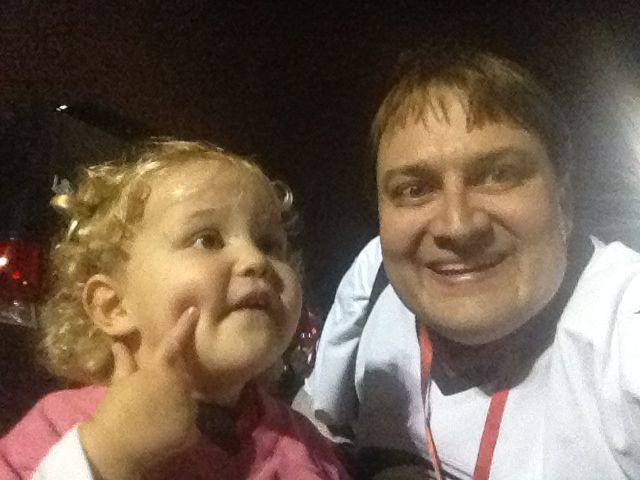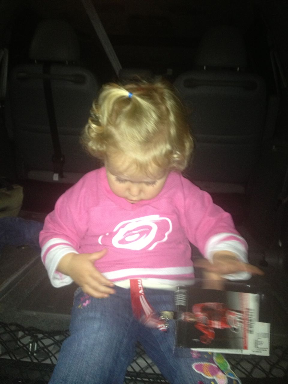 Brian and I thought that Brandon and Kendall would head on home after dinner, but after we texted them a photo of ourselves in the theatre, they replied with a shot of themselves in PNC Arena!  Brandon said he’d considered just not using our hockey tickets tonight, but then decided to go ahead and take Kendall to the game.  She had a lot of energy for it being so late, and she actually made it through the whole game, even into OT!  Brandon said that she very quickly learned to keep track of the puck, and based on the way she paid attention and pointed, he was pretty sure that she was understanding the game.  Brian was a little surprised that Kendall was at the game instead of him (it’s been a Daddy/Brian activity, for the most part!)  But he was okay with it, since he got to see the concert with me.  On the way out of the theater, it was dark and a little chilly, so Brian and I caught a bicycle rickshaw back to Red Hat Tower.  This was a pretty amazing experience for Brian, riding in a cart behind a bike on the street, after dark!  Brian whooped and cheered so much, the driver hammed it up for him, going extra fast, weaving through obstacles, even doing a couple donuts at a red light (he did check that no cars were oncoming!)  I didn’t get any pics since I was hanging on for dear life. 😉  But, we made it back safely and ended our night out on a super high note.  Even though we weren’t all together for part of it, we all had a really successful night on the town!