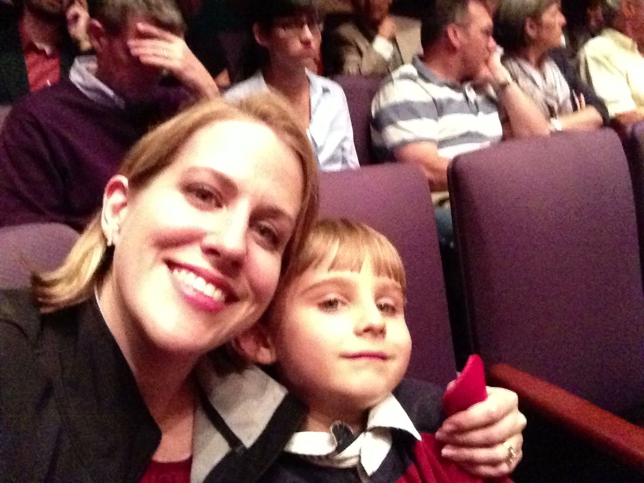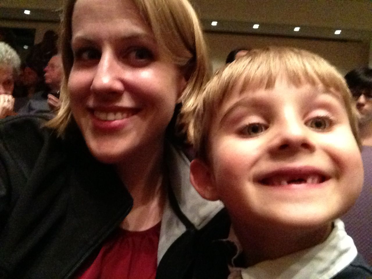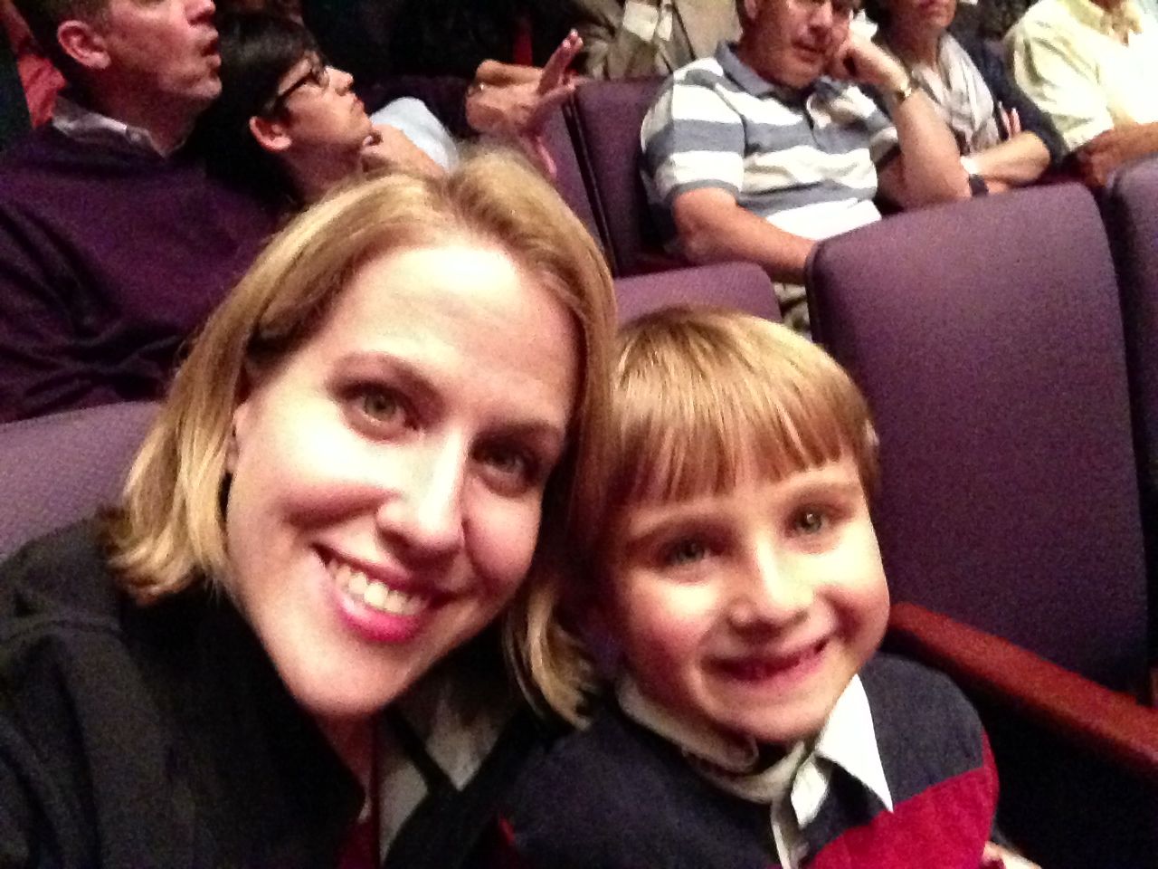 Once the show got underway, I realized that the Star Wars music would be at the end, and started to worry that Brian might lose interest before then..!  But, he did really well, being a good sport and enjoying the themes from movies he hasn’t seen yet, like Indiana Jones, Harry Potter, ET, Close Encounters, etc.  There were a few wiggles and questions about when the Star Wars stuff was coming up, but overall, he did great.  During intermission we enjoyed an overpriced cookie and bottle of water, and then it was time for….!  Fiddler on the Roof.  But after that… We finally got to Star Wars, and I think it was everything that Brian hoped for.  They played five pieces from the different Star Wars movies, and Brian watched and listened intently.  Sometimes, he couldn’t help but pop out of his seat, and he even quietly acted out some scenes at the right points in the music.  He played multiple parts, turning this way and that, to be the different characters.  I worried that he might be bothering the folks around us, but they didn’t seem to mind.  Some of the memorable moments he recreated were the medal ceremony, the time Luke shouts “No!” as Obi-Wan is defeated and the Millenium Falcon escapes, and to the delight of myself and the other folks around us, the unforgettable exchange between Han and Leia:  “I love you!”  “I know.”  Brian delivered the lines with such gravity for a little guy, I had to suppress a chuckle!  It really was adorable.  He wasn’t trying to be disruptive and really was fairly quiet about it, so I let him enjoy the show fully, in his own way.  After the house lights came up, our neighbors on his far side approached me to say what an excellent concert-goer he was, and how impressed they were with his manners, especially so late at night!  (The show started at his bedtime, and ended over 2 hours later!)  They also said that his dramatic performances were so fun, it just made their night.  That was so nice of those complete strangers, reassuring this mom that her decision to bring a wiggly Kindergartener to the symphony was a good one. 🙂  Brian said the only things he wished were different was that he wanted to see someone in an Emperor costume (wow, he must be feeling very brave after meeting Darth Vader!) and he wanted to hear the theme from the “Into the Death Star” scene.  In one of the pics he’s making his “scary Emperor” face. 😉