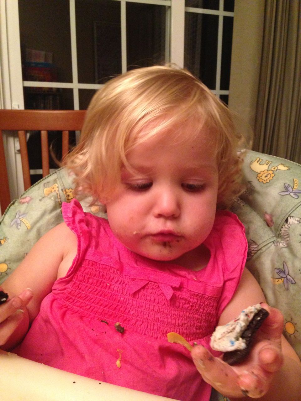 Today was warm enough that Kendall got to wear one of her summer outfits one more time.. I think the white cat embroidery is so cute! Tonight after dinner, Brian was asking for a treat, and we discovered that we still had some of the birthday cake Oreos left in the closet! (Yes, it might seem like we buy a lot of treats, but at least we don’t usually finish them all in one go! Or even in a month.) Kendall had missed out on these previously, so we let her try one tonight. She was skeptical at first, taking the cookie apart, but then she noticed the fun sprinkles, and then a taste, and–wow!!! Party time!! So funny to watch that progression. Yeah, probably not the best to give her Oreos before bedtime, but hey, sometimes you just gotta live a little. 🙂 So, the verdict is in, Birthday Cake Oreos are a win with all of us. I’m still not going to buy the Candy Corn ones, that just seems too weird–and I do really like candy corn! 😉