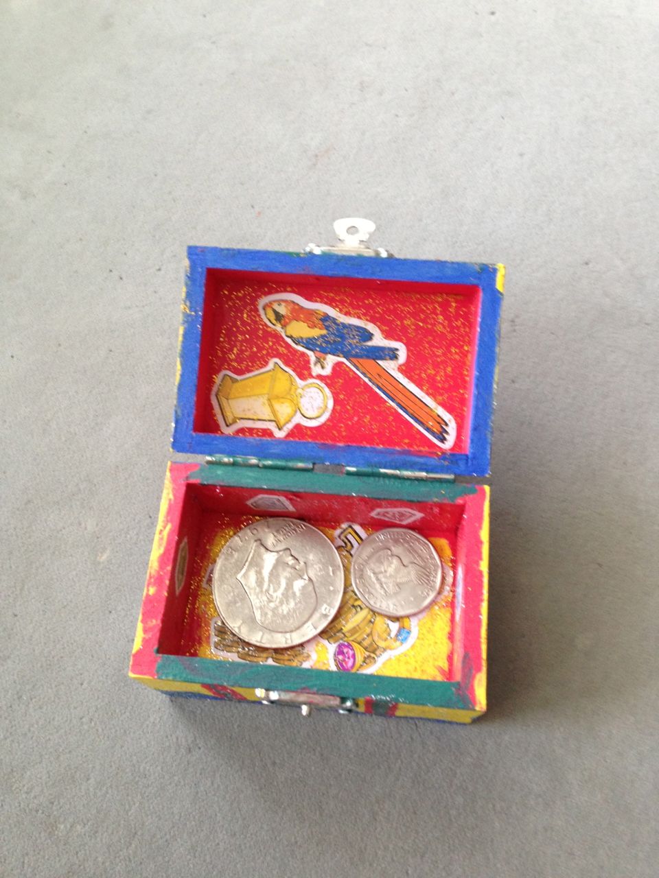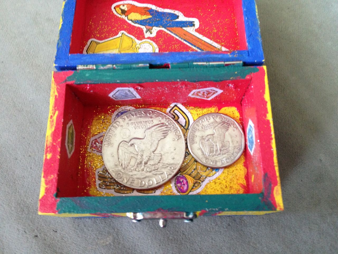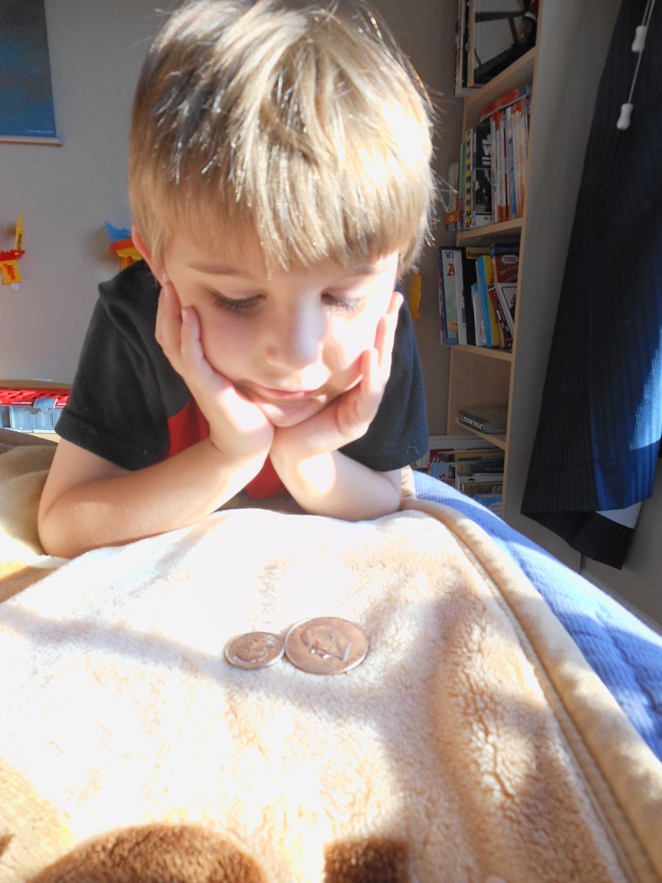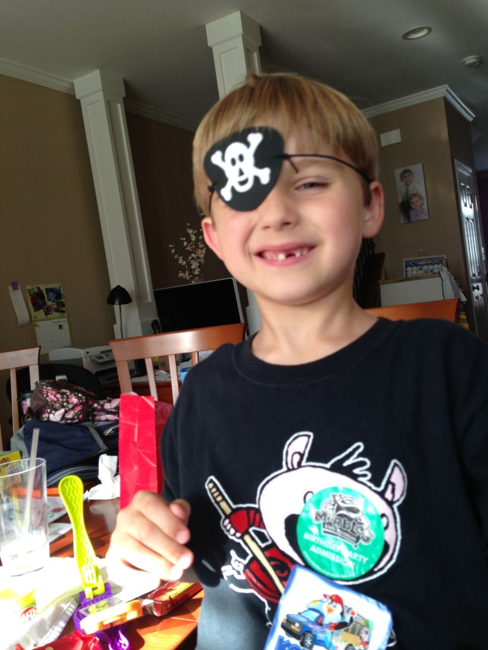Brian was so happy this morning–the Tooth Fairy had brought him some cool coins! He got an Eisenhower dollar and a Susan B. Anthony–we think it’s because the eagle is landing on the moon on the tails side, and the Tooth Fairy must know he’s into space, what with the rocket ship tooth pillow. 😉 He spent a lot of time just looking at his “treasure” in the morning sunlight. He decided to keep his coins in his new treasure box that he’d painted earlier. After breakfast, we were off to get Brian’s 6-year-old portraits, and after that, Brian was off to Isadora’s birthday party at Marbles! It was right during Kendall’s naptime, so I stayed home with her. Brian came home with a cool disguise–he really loved the glasses/mustache combo, and Kendall was not to be outdone–she’s still playing with that Lego mask!