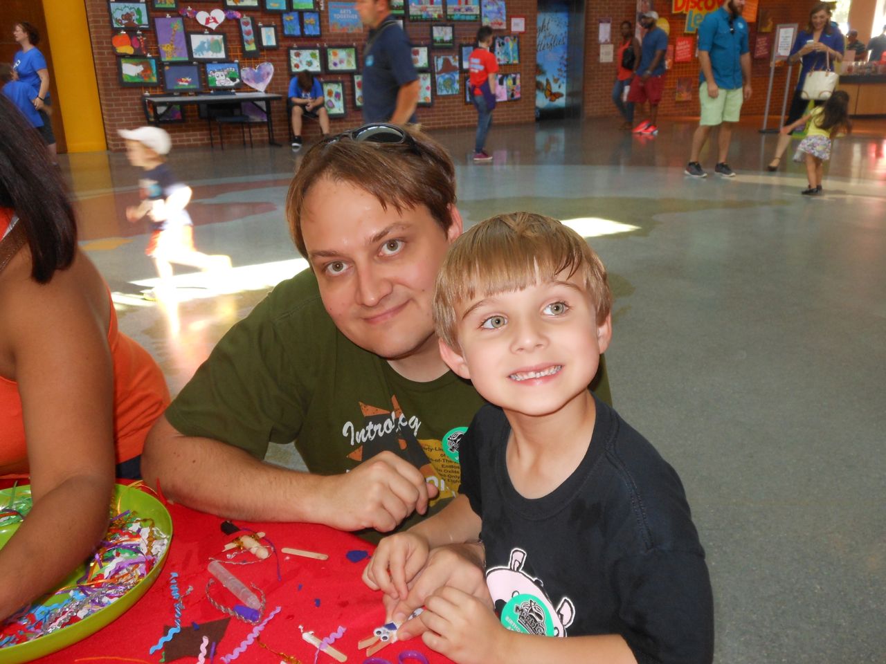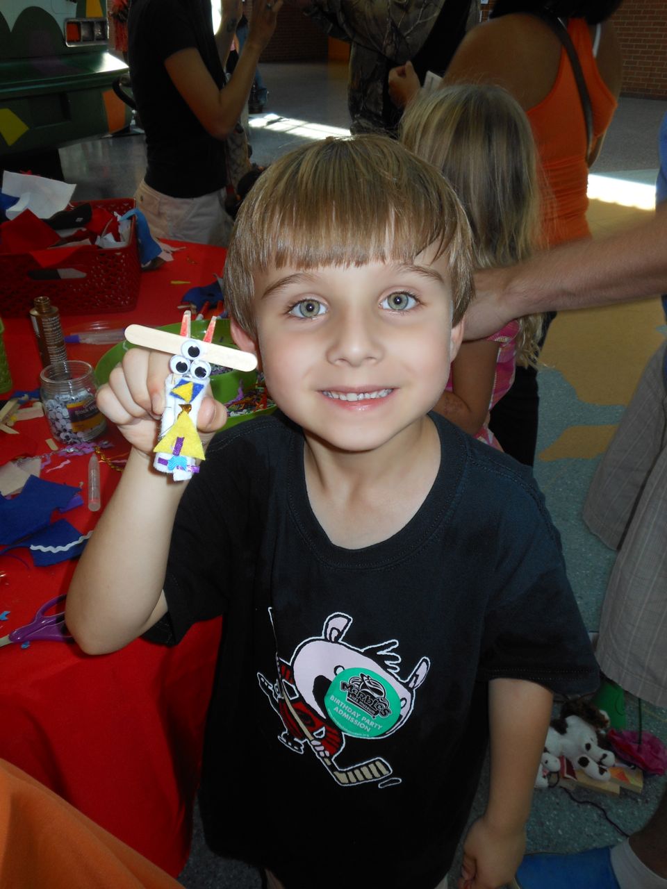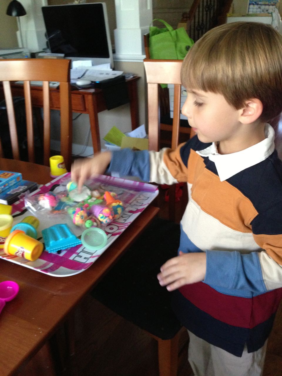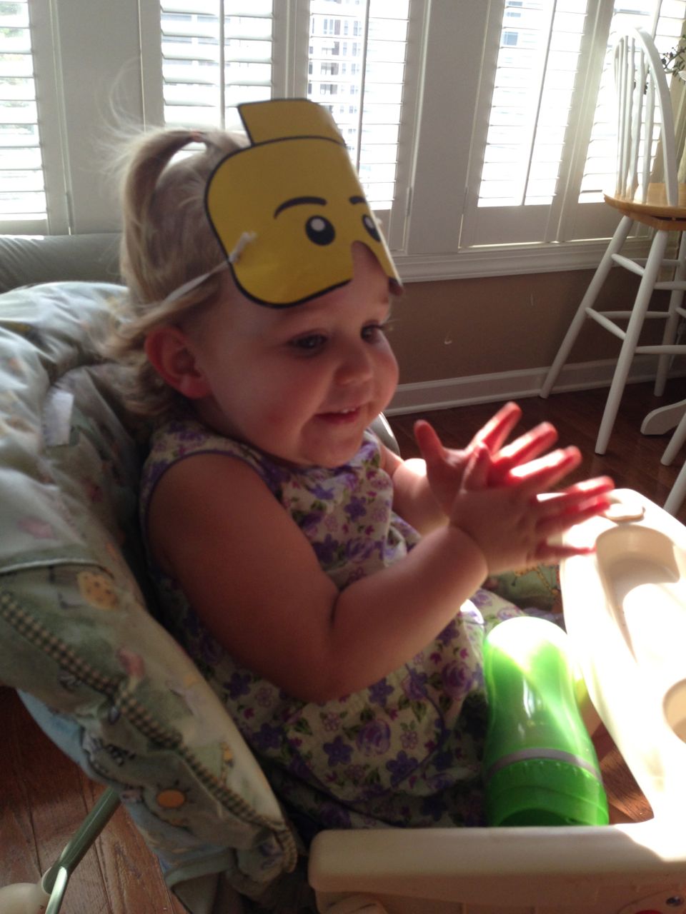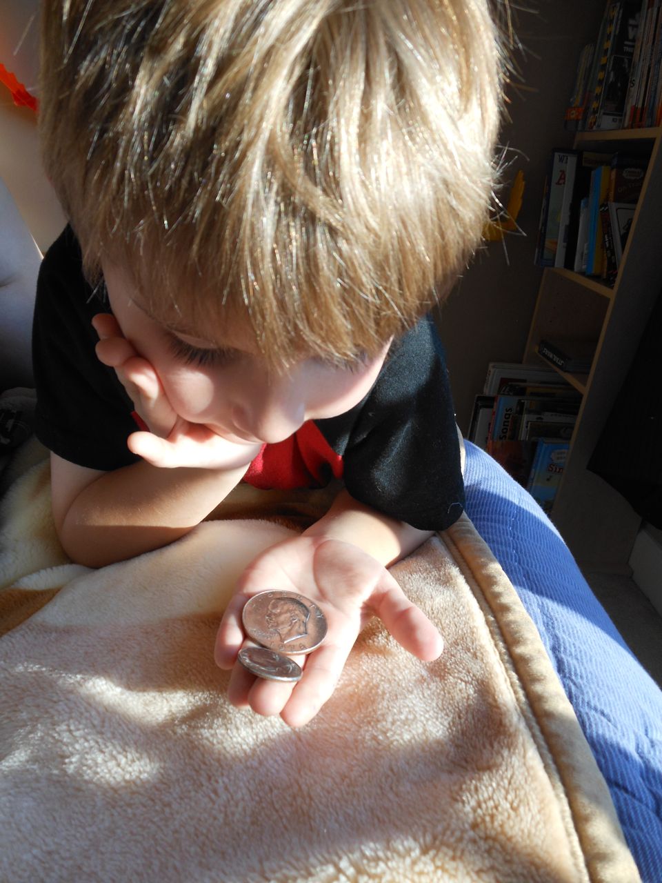 Brian was so happy this morning–the Tooth Fairy had brought him some cool coins! He got an Eisenhower dollar and a Susan B. Anthony–we think it’s because the eagle is landing on the moon on the tails side, and the Tooth Fairy must know he’s into space, what with the rocket ship tooth pillow. 😉 He spent a lot of time just looking at his “treasure” in the morning sunlight. He decided to keep his coins in his new treasure box that he’d painted earlier. After breakfast, we were off to get Brian’s 6-year-old portraits, and after that, Brian was off to Isadora’s birthday party at Marbles! It was right during Kendall’s naptime, so I stayed home with her. Brian came home with a cool disguise–he really loved the glasses/mustache combo, and Kendall was not to be outdone–she’s still playing with that Lego mask!
