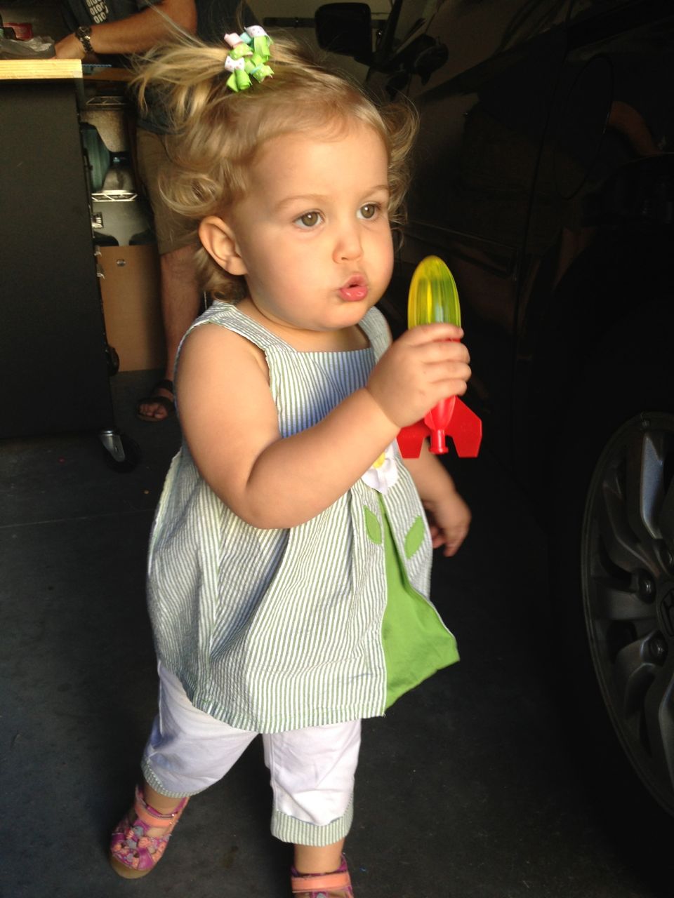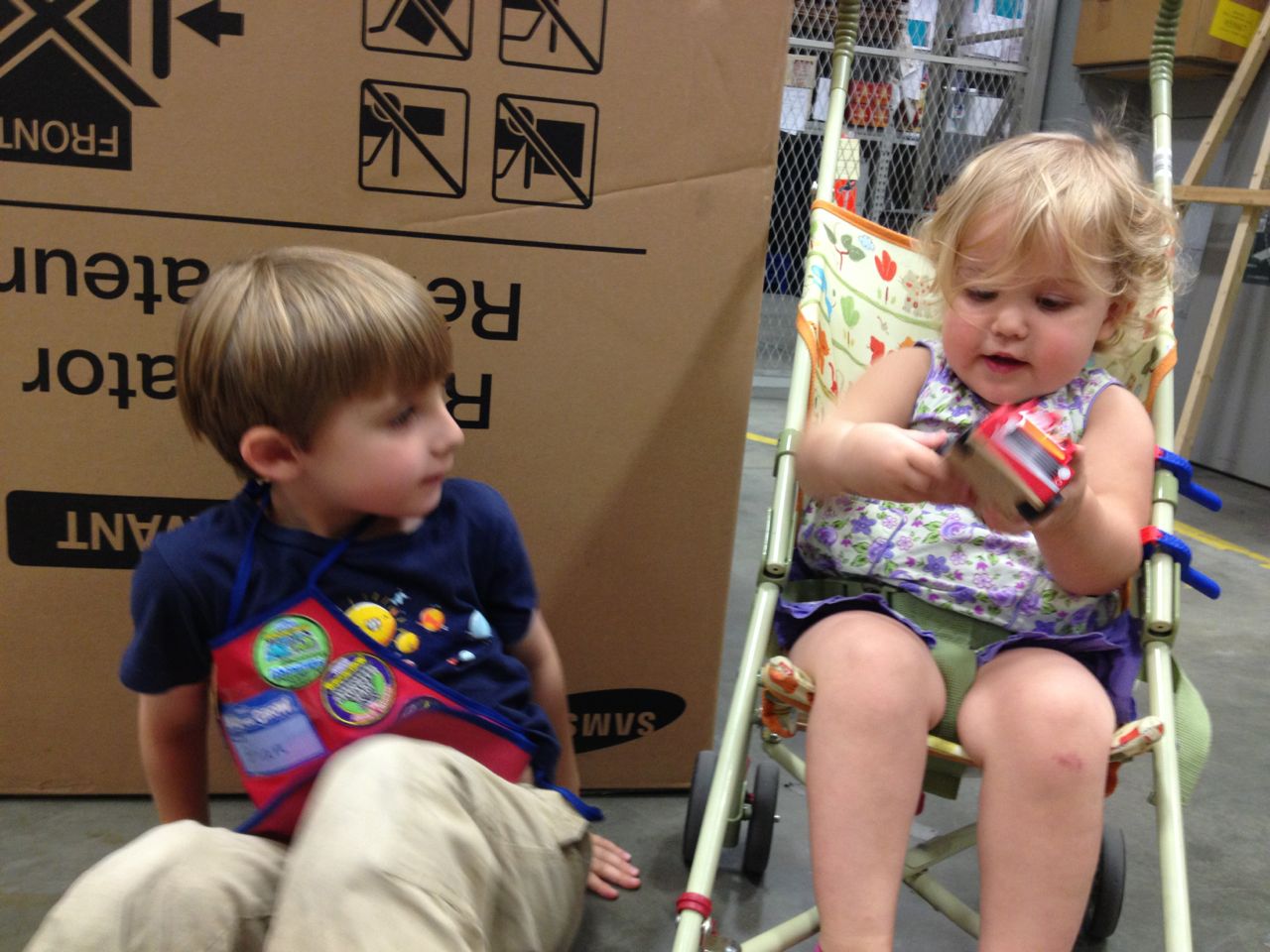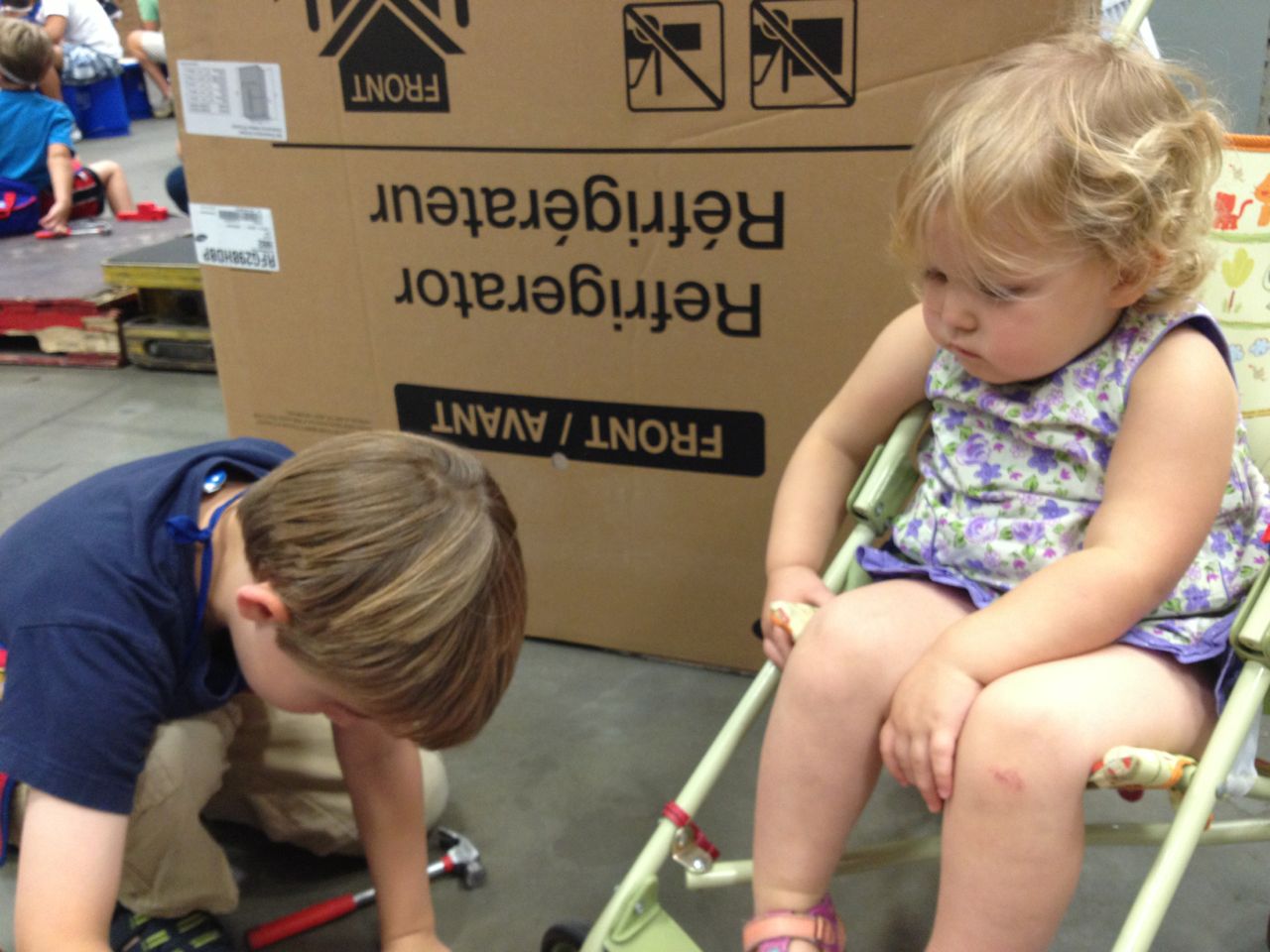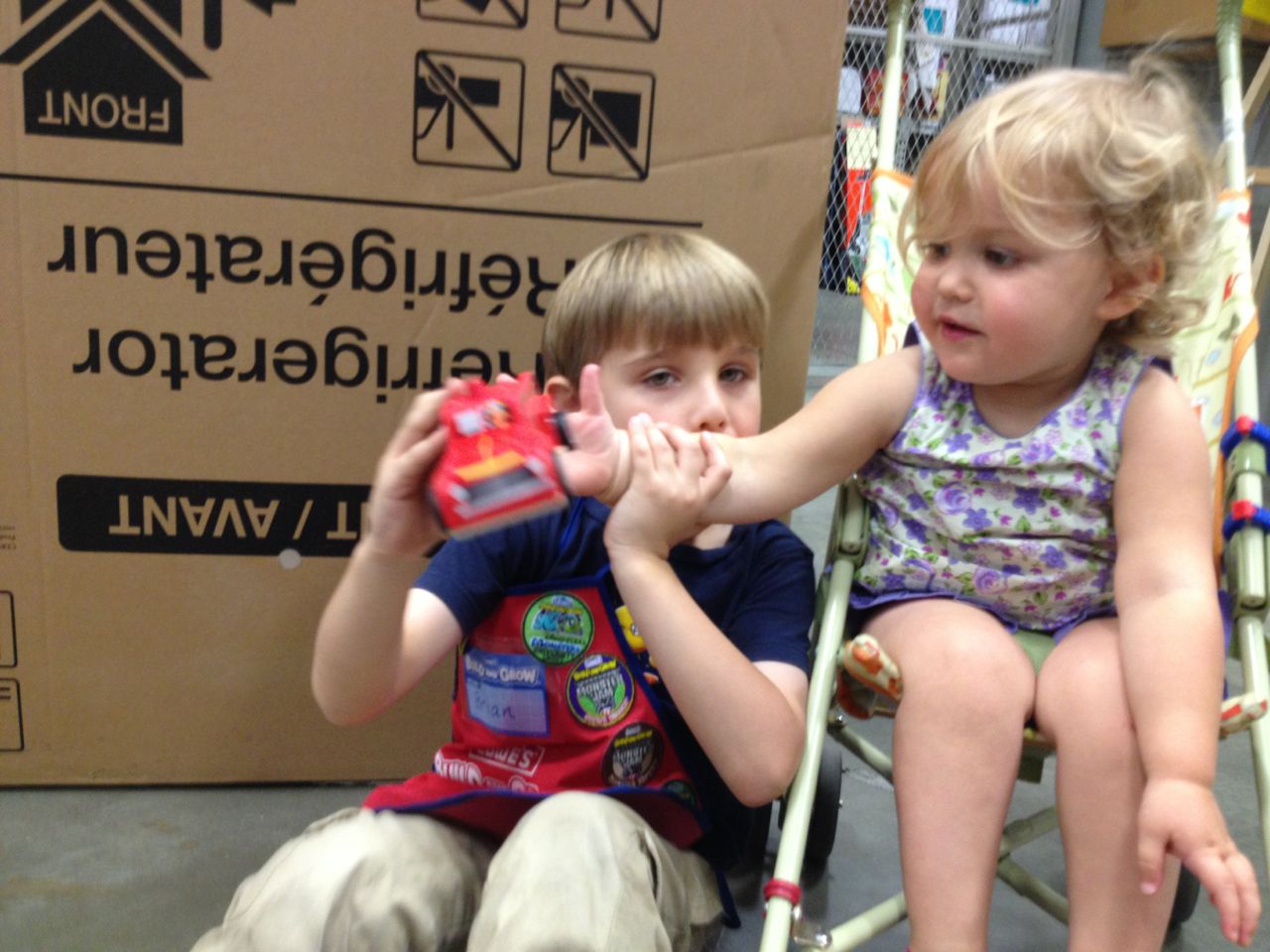 Today, Kendall got to come along to Lowe’s Build and Grow–I think she was a little jealous that she doesn’t get to build her own things yet! Also, the kids felt like launching rockets–Kendall wanted to do the water rockets (but we weren’t up for it today, plus, they don’t work all that well..) So, the venerable stomp rocket it was! They do love that toy.