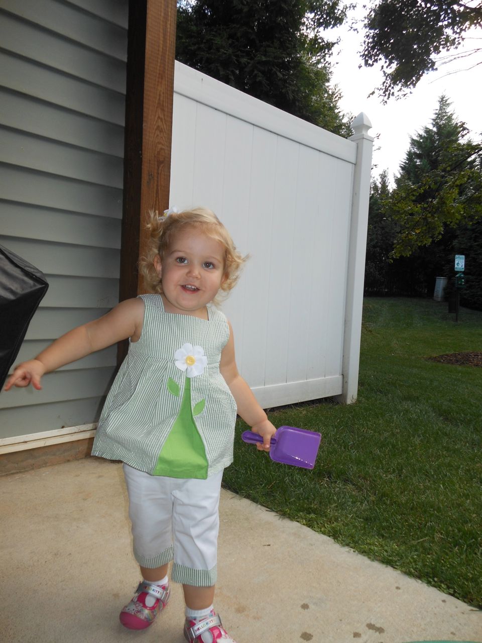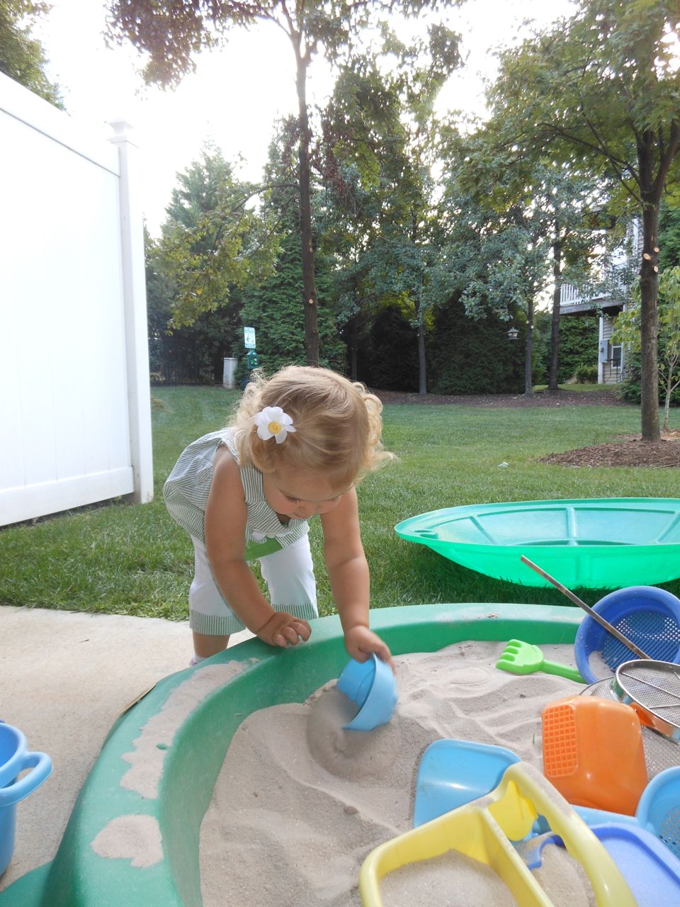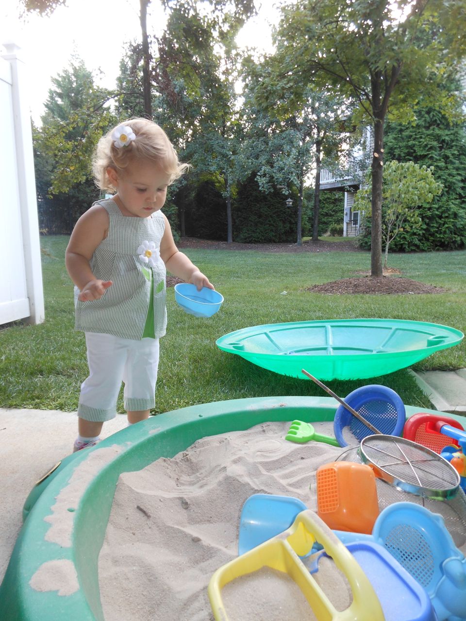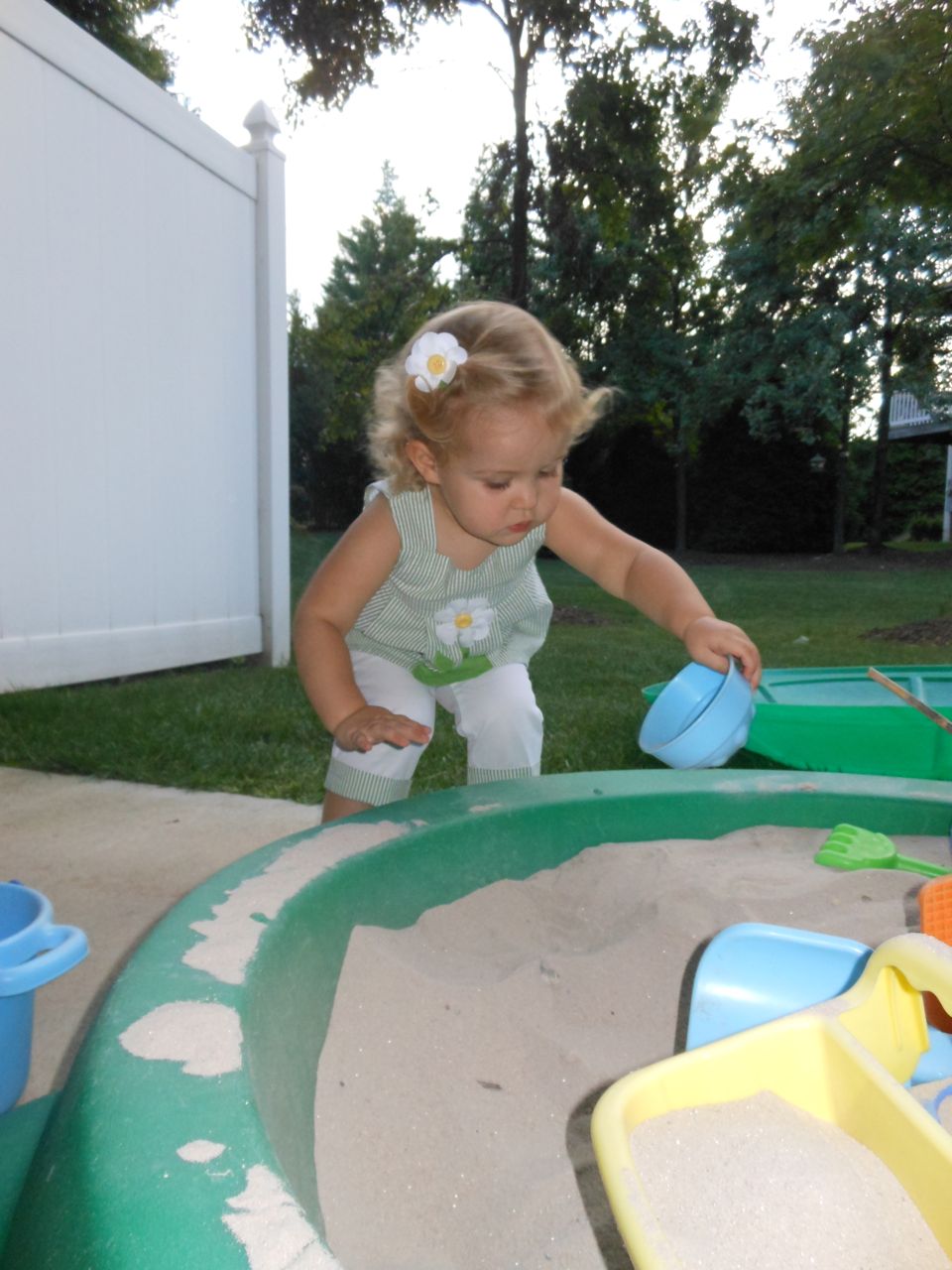Now that we’re past Labor Day, I guess technically Kendall shouldn’t wear this outfit.. (Is that rule only about white shoes, or do white pants count, too? I can’t remember these things!) But it’s just too cute, and you can’t really see it in her portraits. So, since we had a little time after school today, I let Kendall play in the sandbox while I snapped a bunch of photos. Let’s enjoy the last of summer however we can! Even if that means flinging sand on Mommy’s camera. 😉