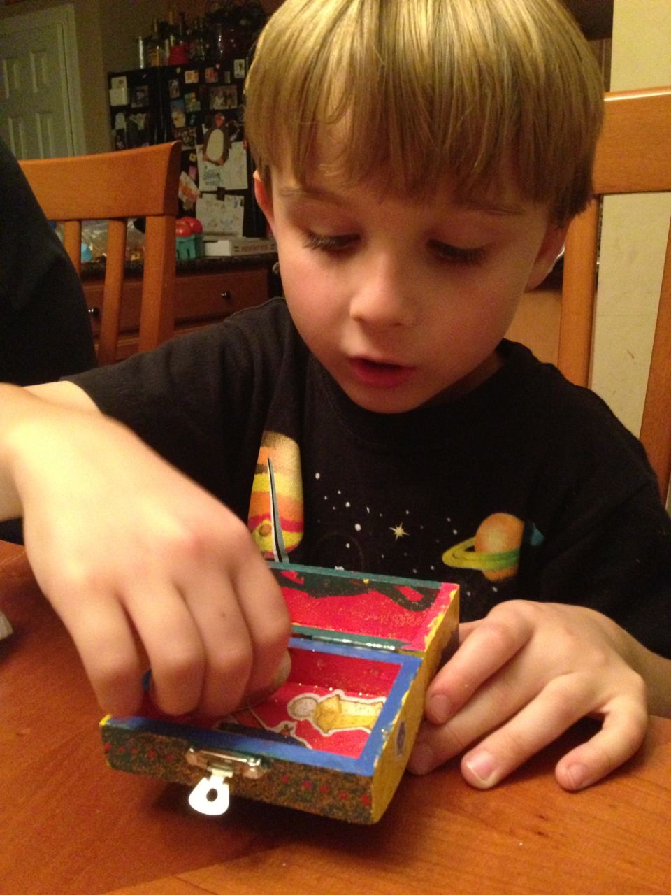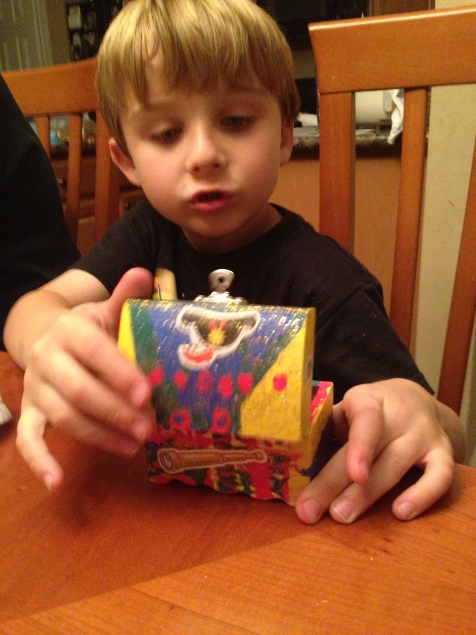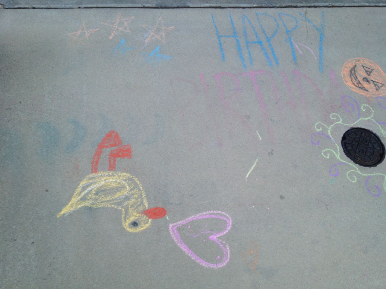 Brian was super happy this morning to discover more treasure! This time he received a Kennedy 50-cent piece and a golden Sacajawea dollar. He was pretty impressed! He’s been talking about “golden” this and that, so the Sacajawea was a big hit. I have it on good authority that the Tooth Fairy will be going international next time. 😉 Our chalk birthday decorations are fading, but now it’s time to get ready for Halloween! And also a random duck–because Kendall loves The Duck Song so much. 🙂