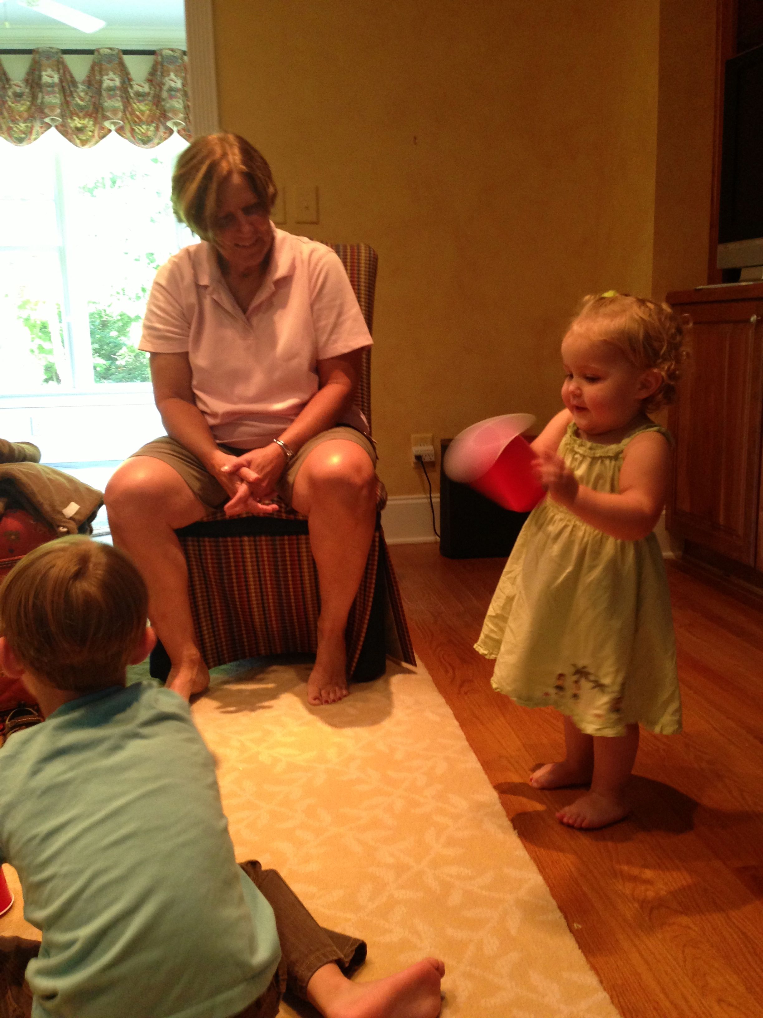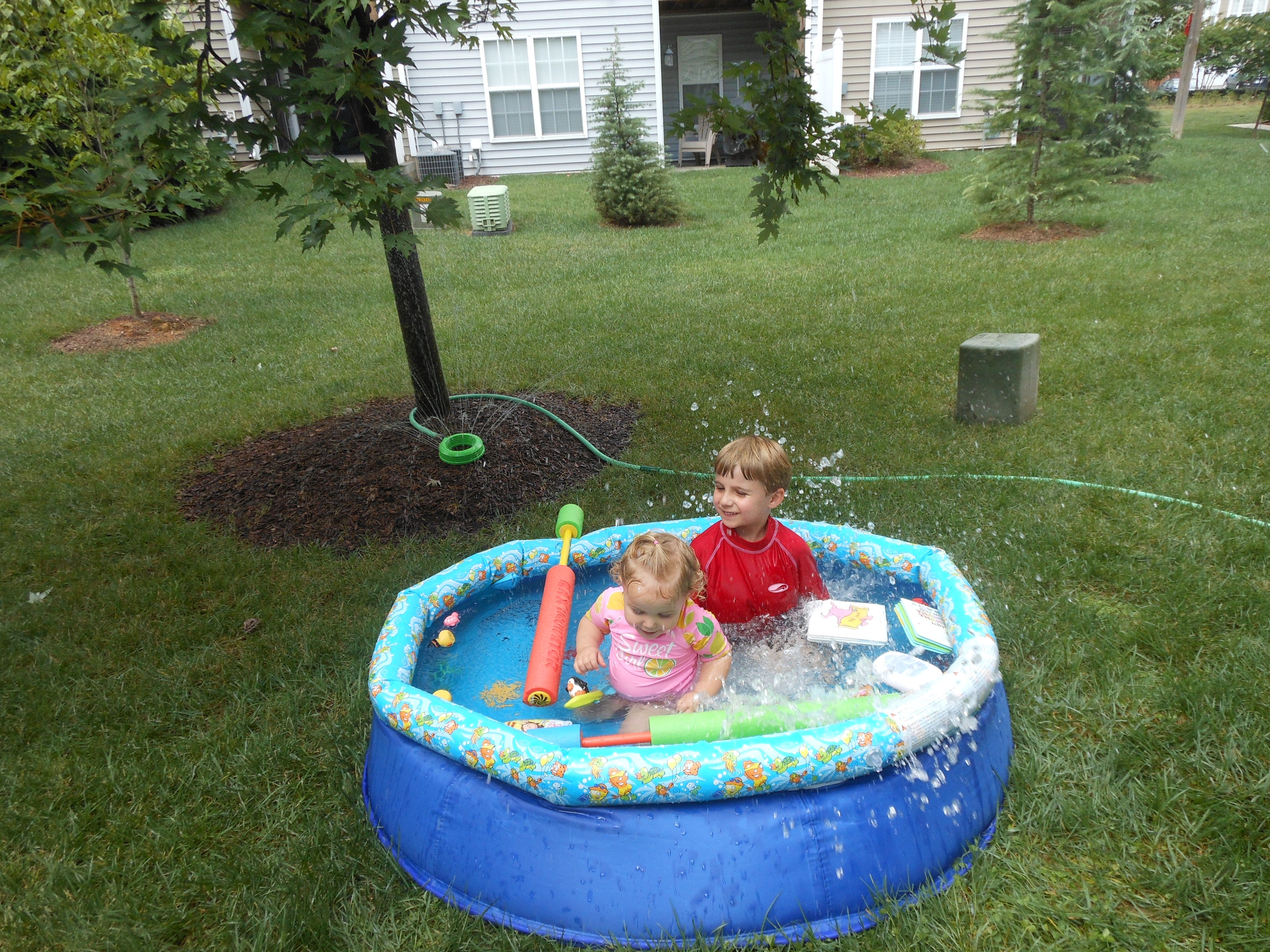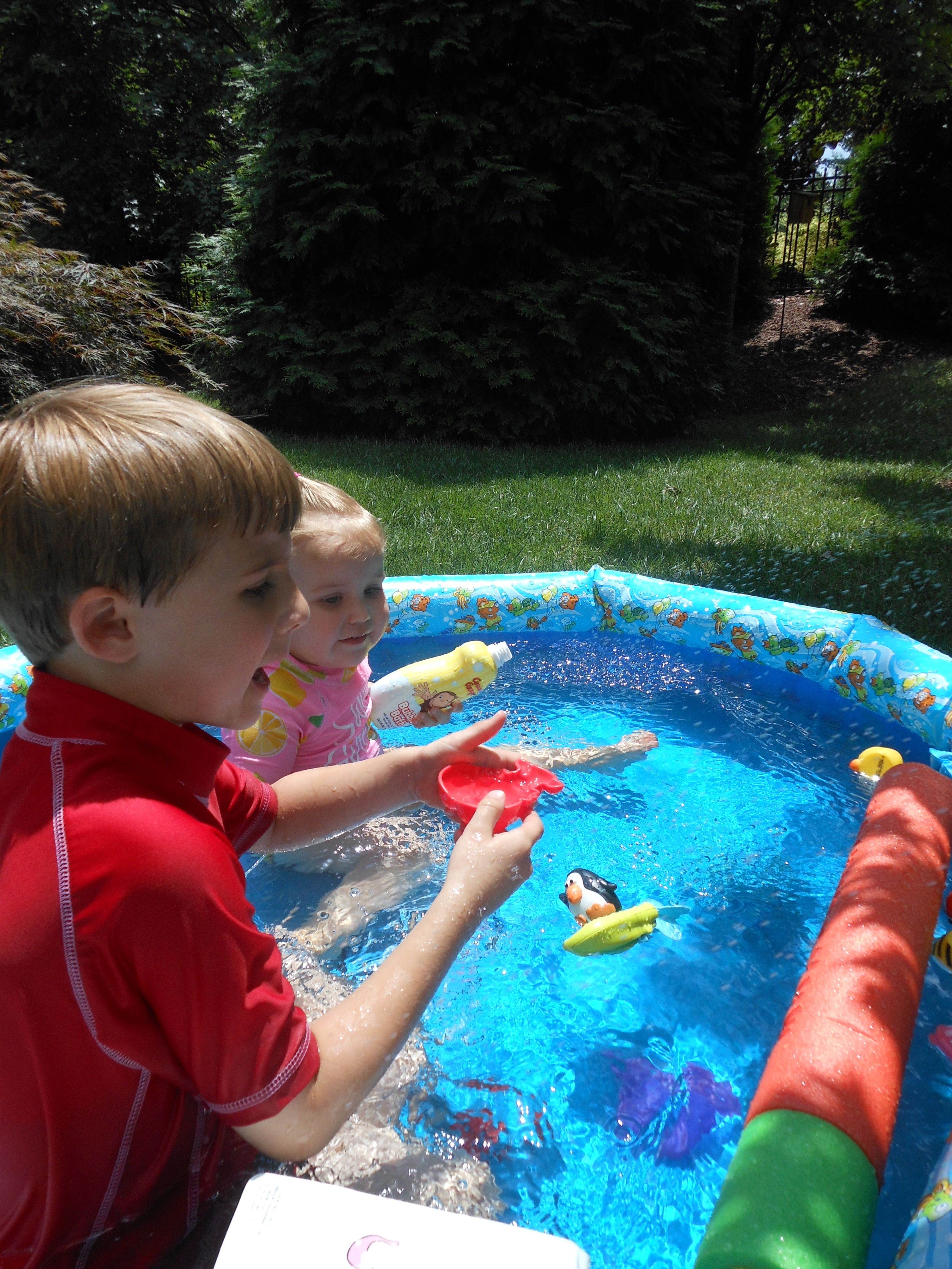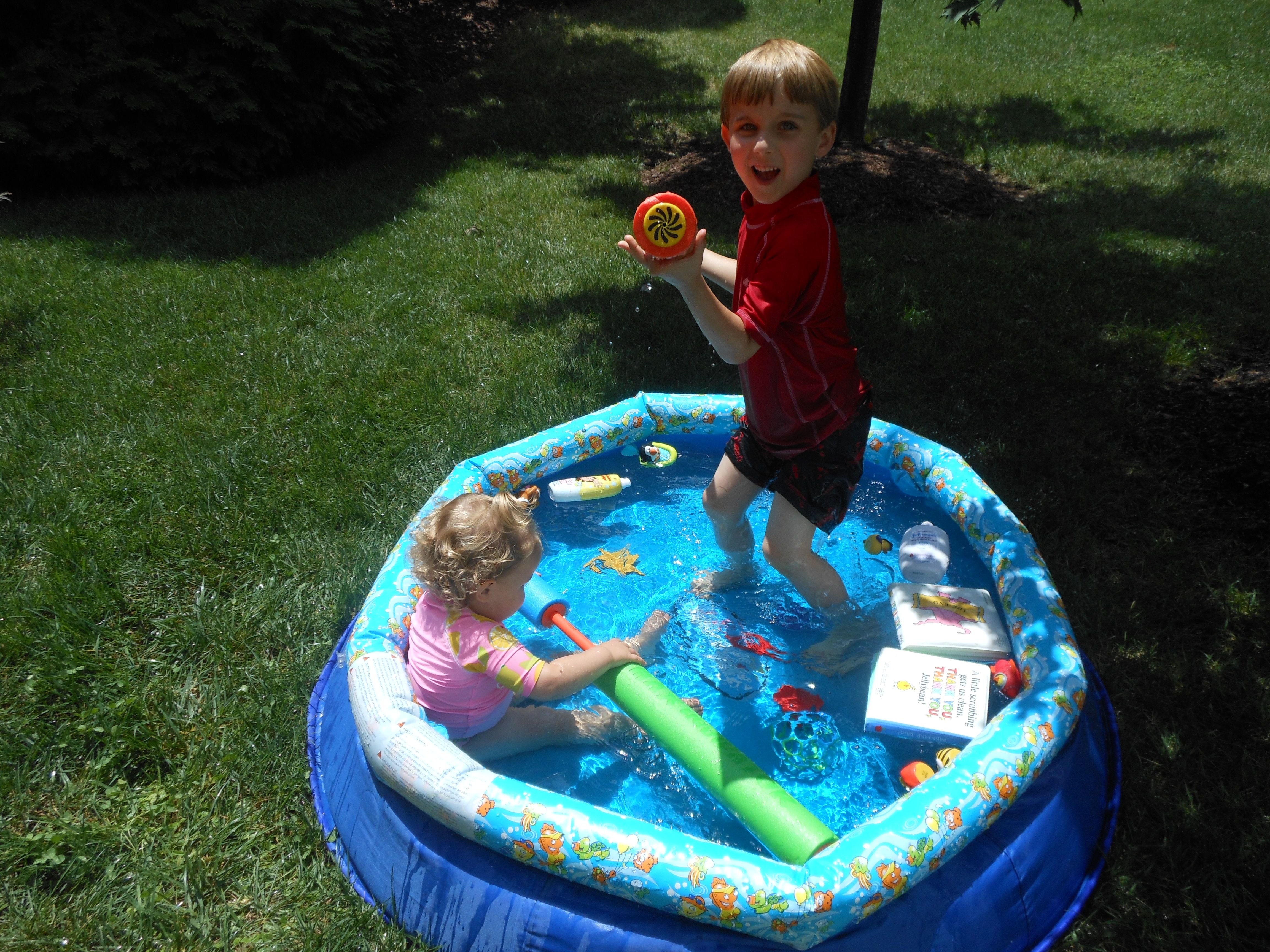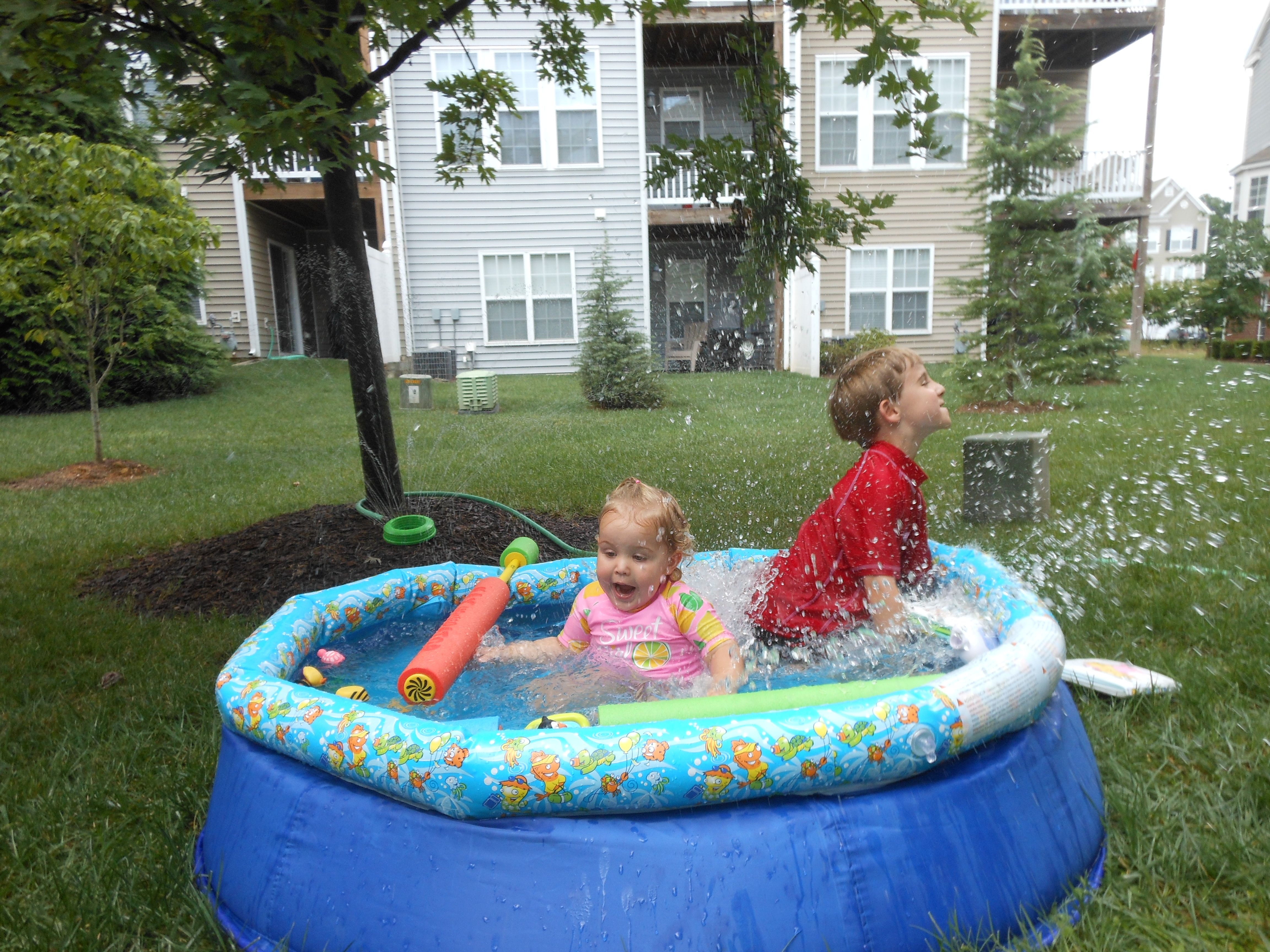 It was a great day to be outside, so–why not break out the kiddie pool again! It was so hot, Brandon and I got in on the fun, too. Brandon and Brian had fun with the squirt guns, and Brian of course continued to do his “cannonbaaaaaaaall!” jumps into the pool, splashing everyone. Kendall has decided she likes sunscreen now, and kept asking for more. We used our new Hello Kitty beach towels (even Brian)! We played until naptime. Later, we went to visit Grandpa and Grandma for dinner, and walked away with a pile of groceries! (They’re moving to their new house soon, and needed to clear out the fridge.) 🙂