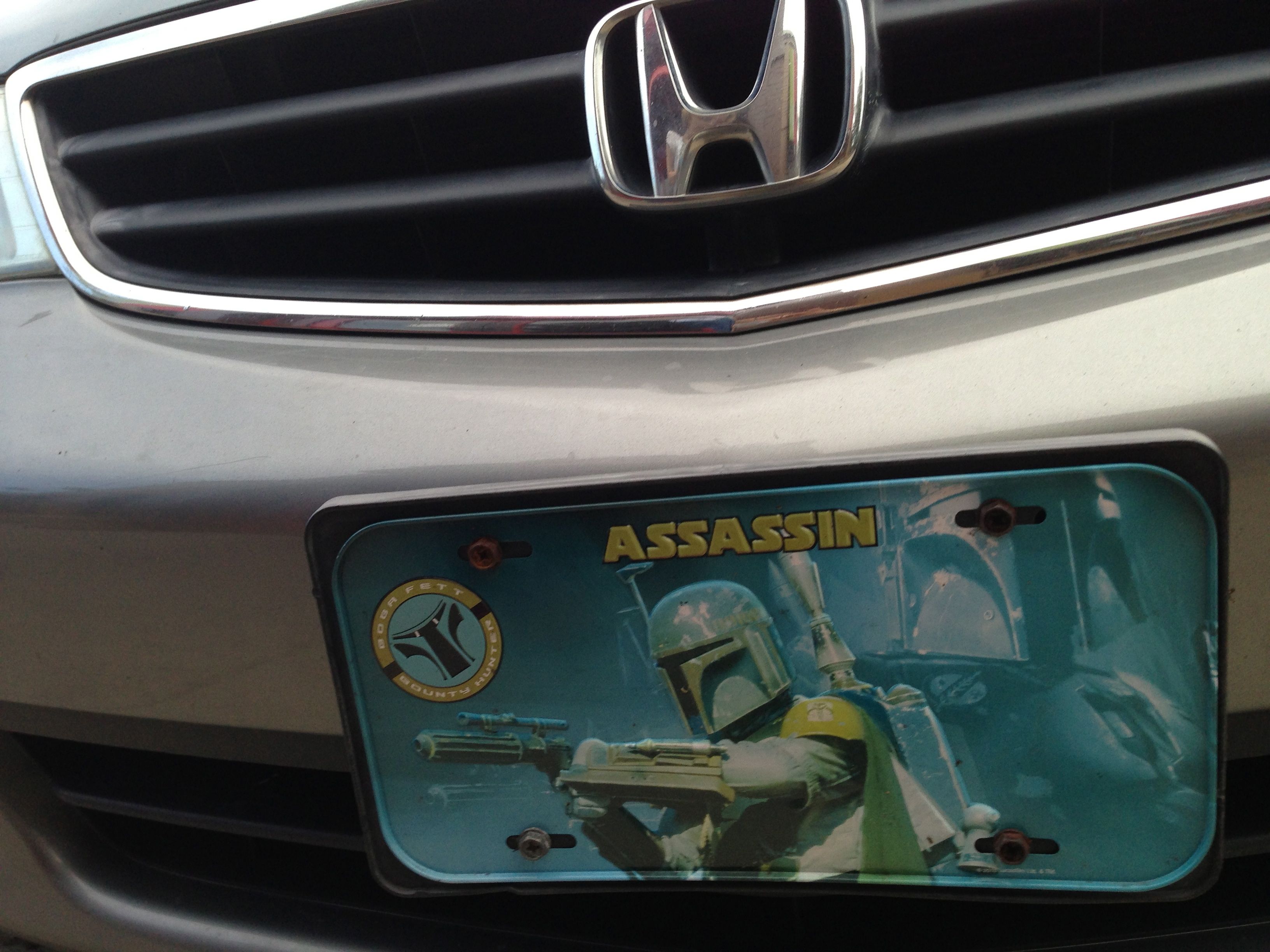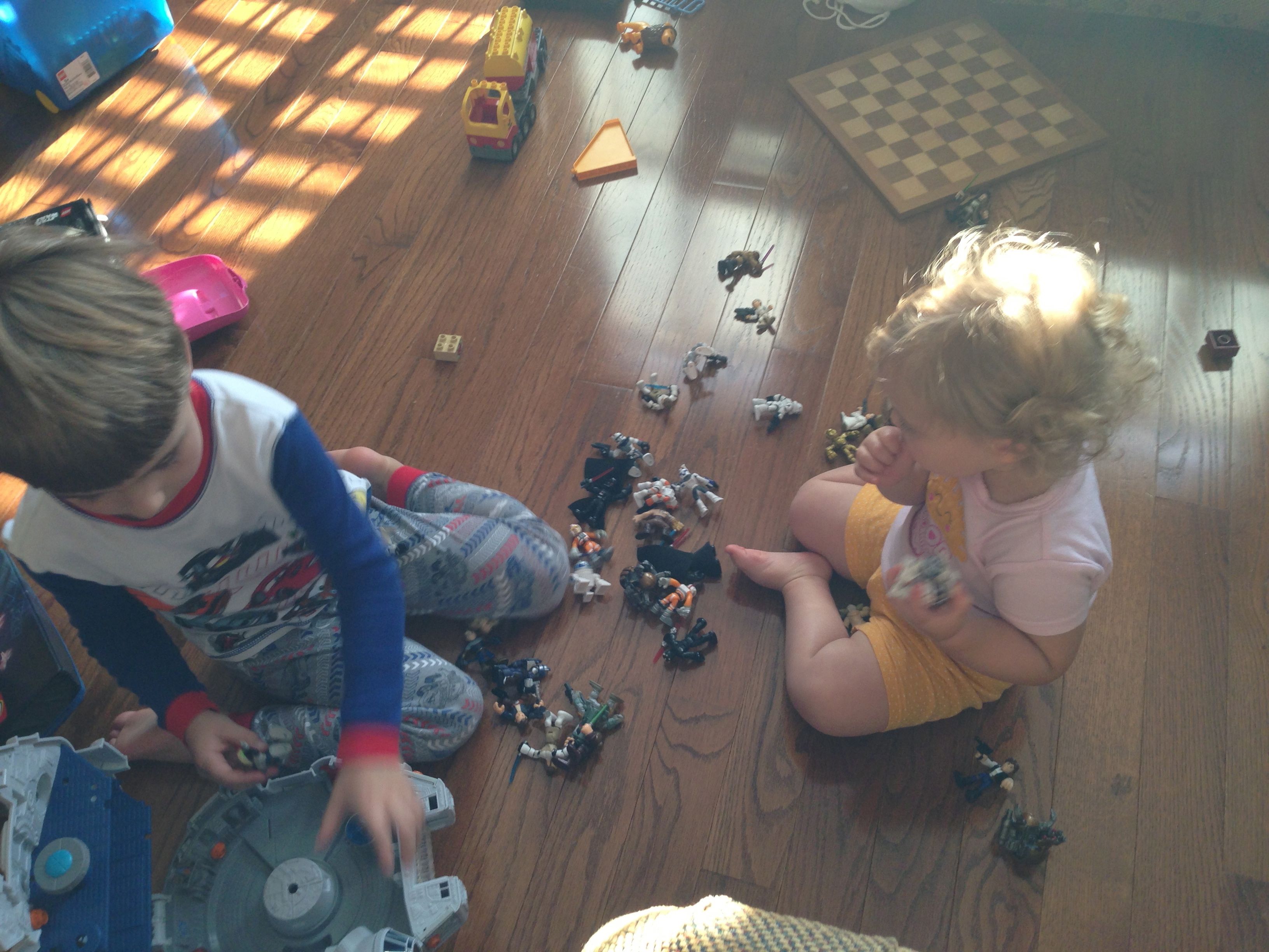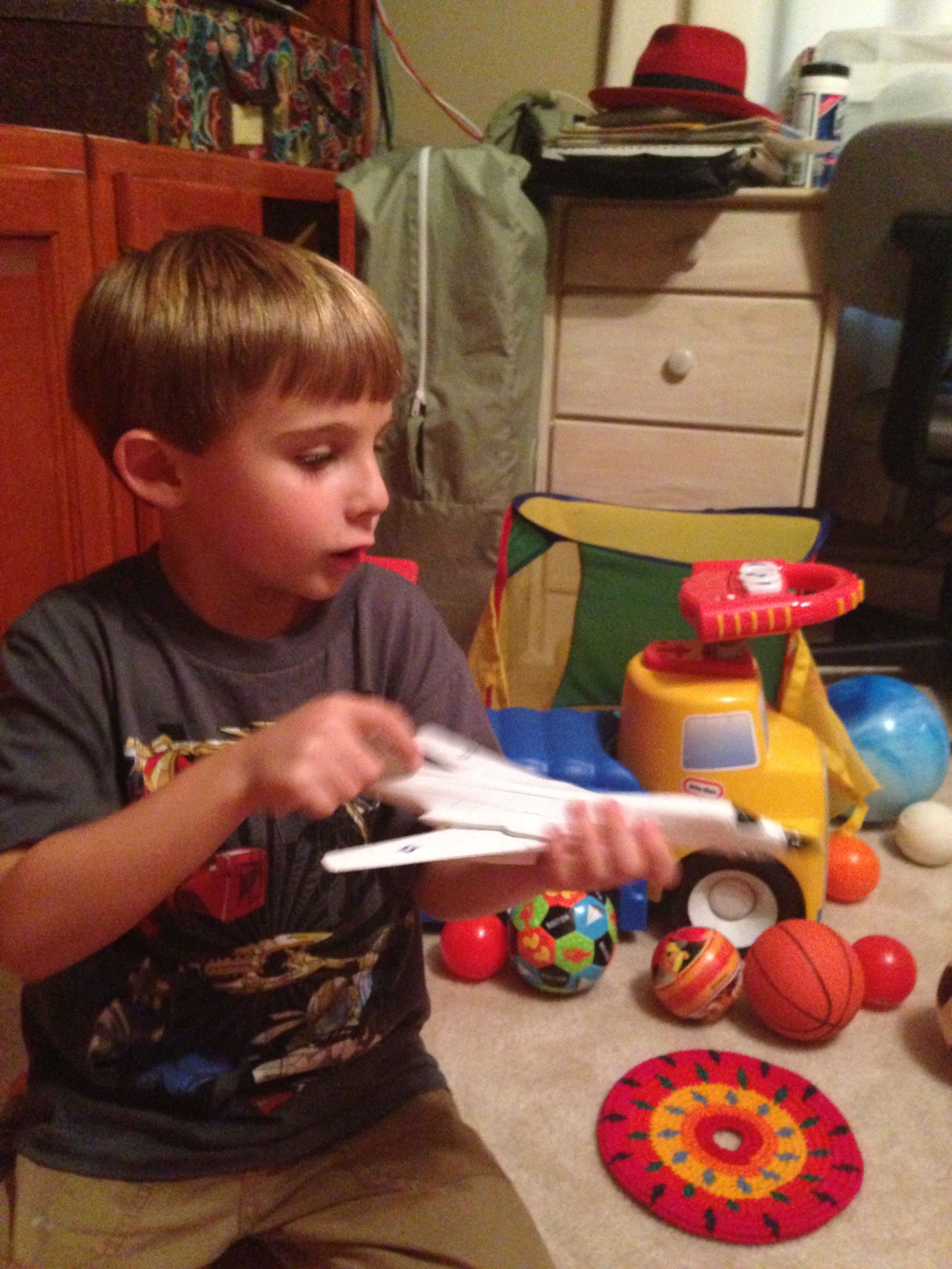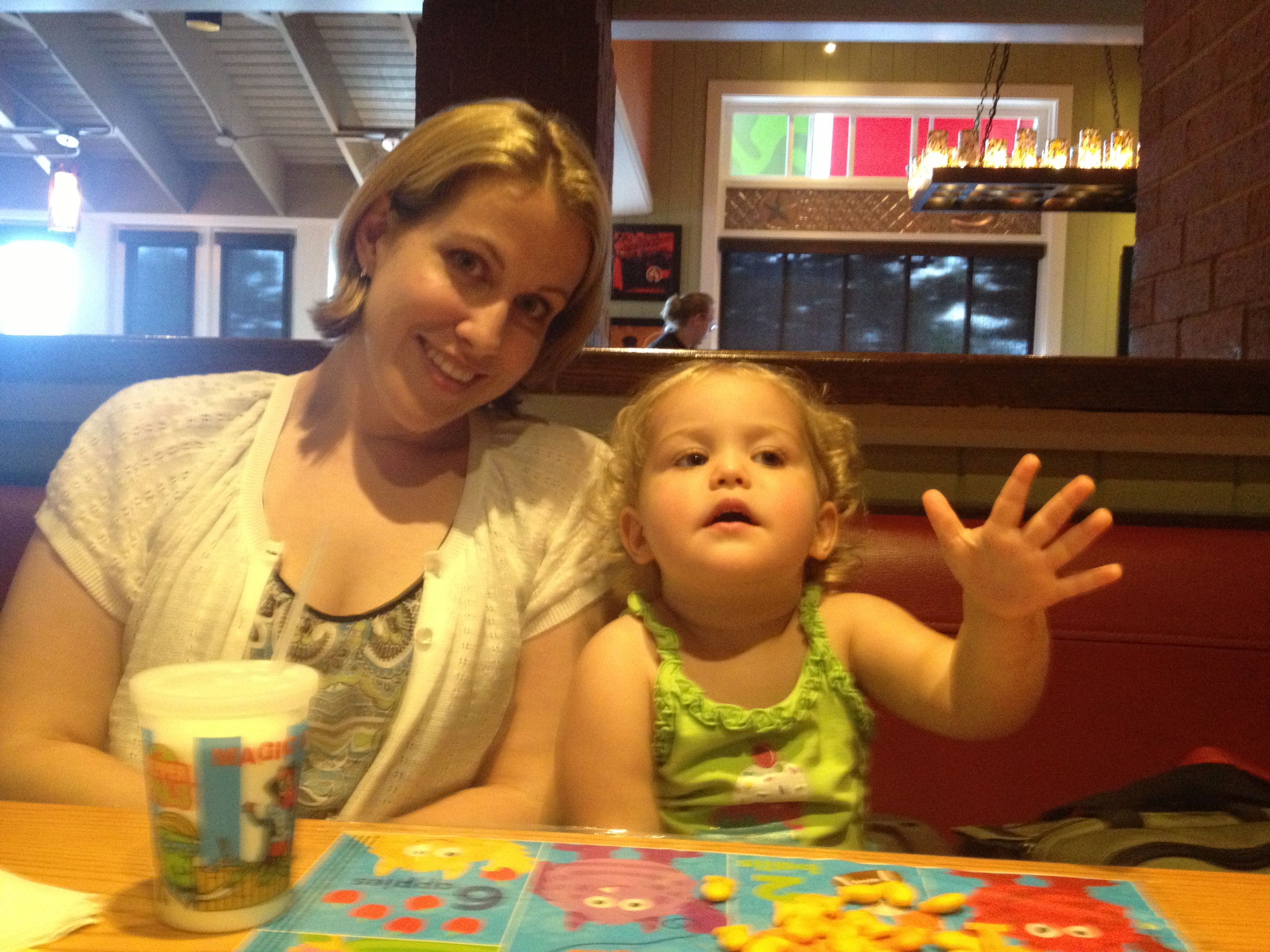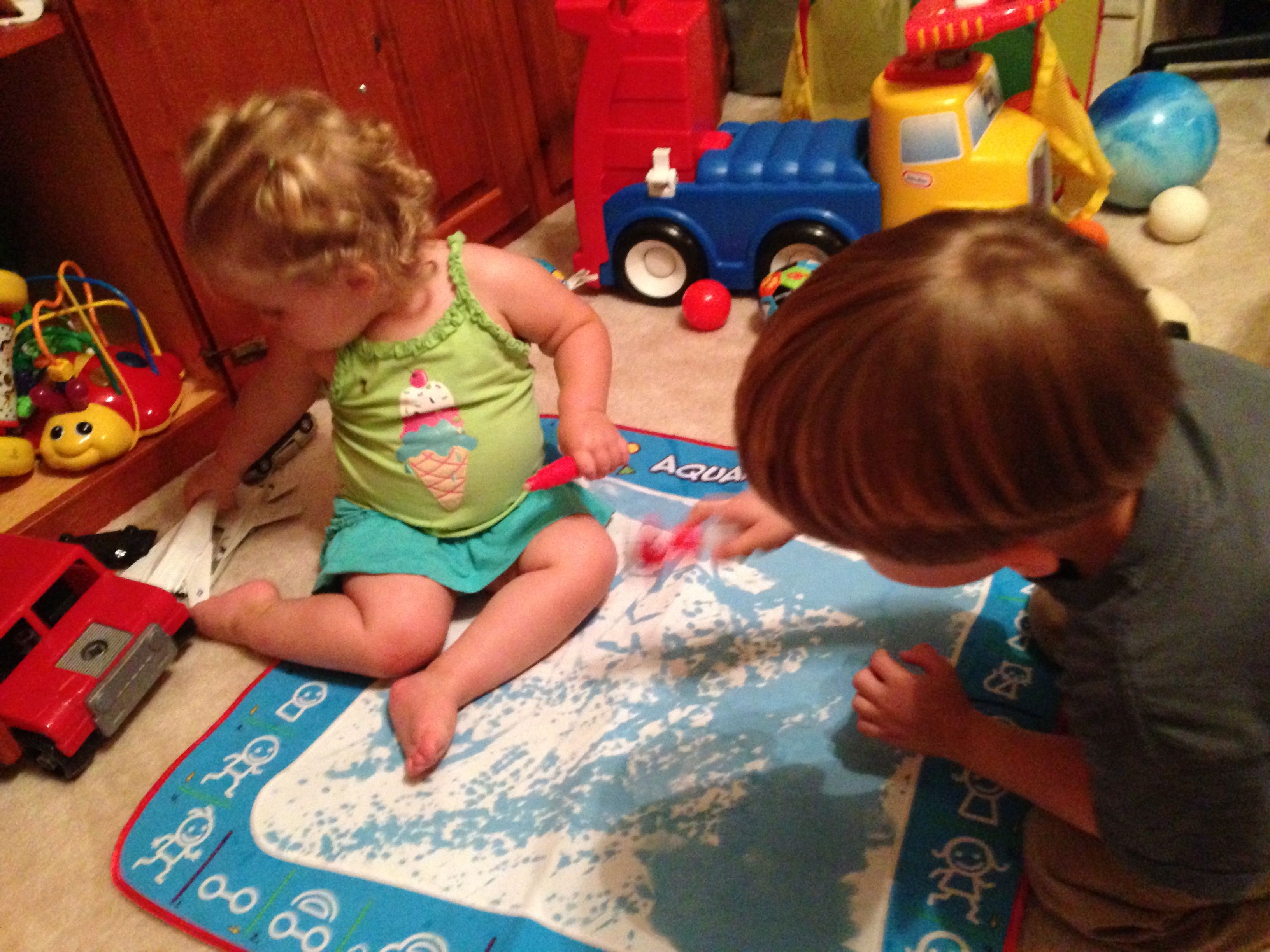 It’s Friday, it’s time to party! Even before school, the kids were ready to play. They pulled out so many toys before I even got downstairs..! Kendall was very silly with her bagel, enthusiastically getting blueberry cream cheese all over her face. Brian somehow managed to get a cookie, and celebrated that he had the king (what can I say, he loves the Chessmen.) After school, Brian said he wanted to go to the “place where I get to circle pictures of what I want with crayons”–which I knew must mean Chili’s. So, we said okay, and headed over. We had our dinner (and chocolate lava cake!) and on the way out, Brian noticed someone’s car had a Boba Fett front license plate on it–he said I had to take a picture. 🙂 When we got home, the kids were so sugared up and it was still early, so we had some extra playtime. They went a little wild with the AquaDoodle!