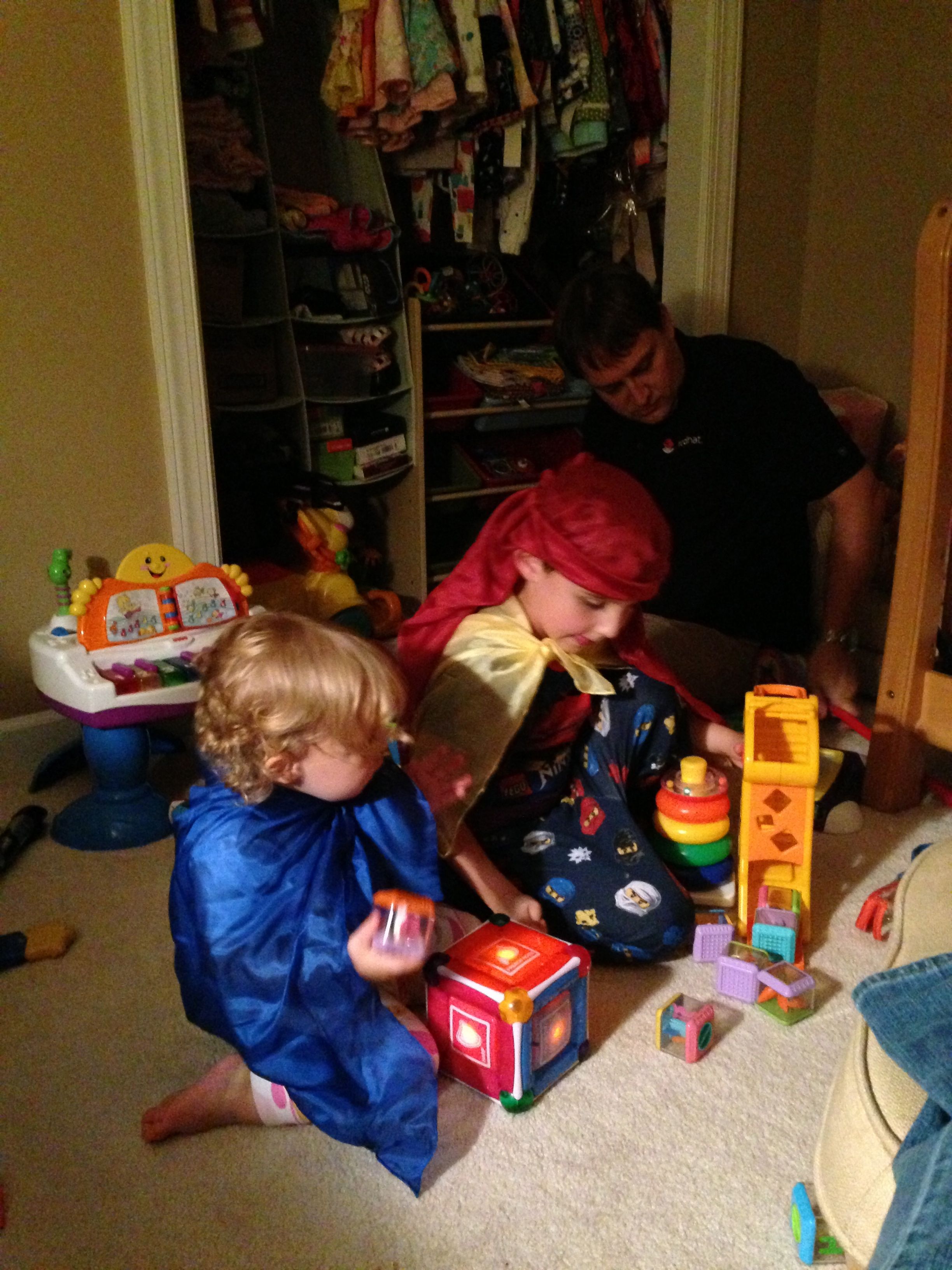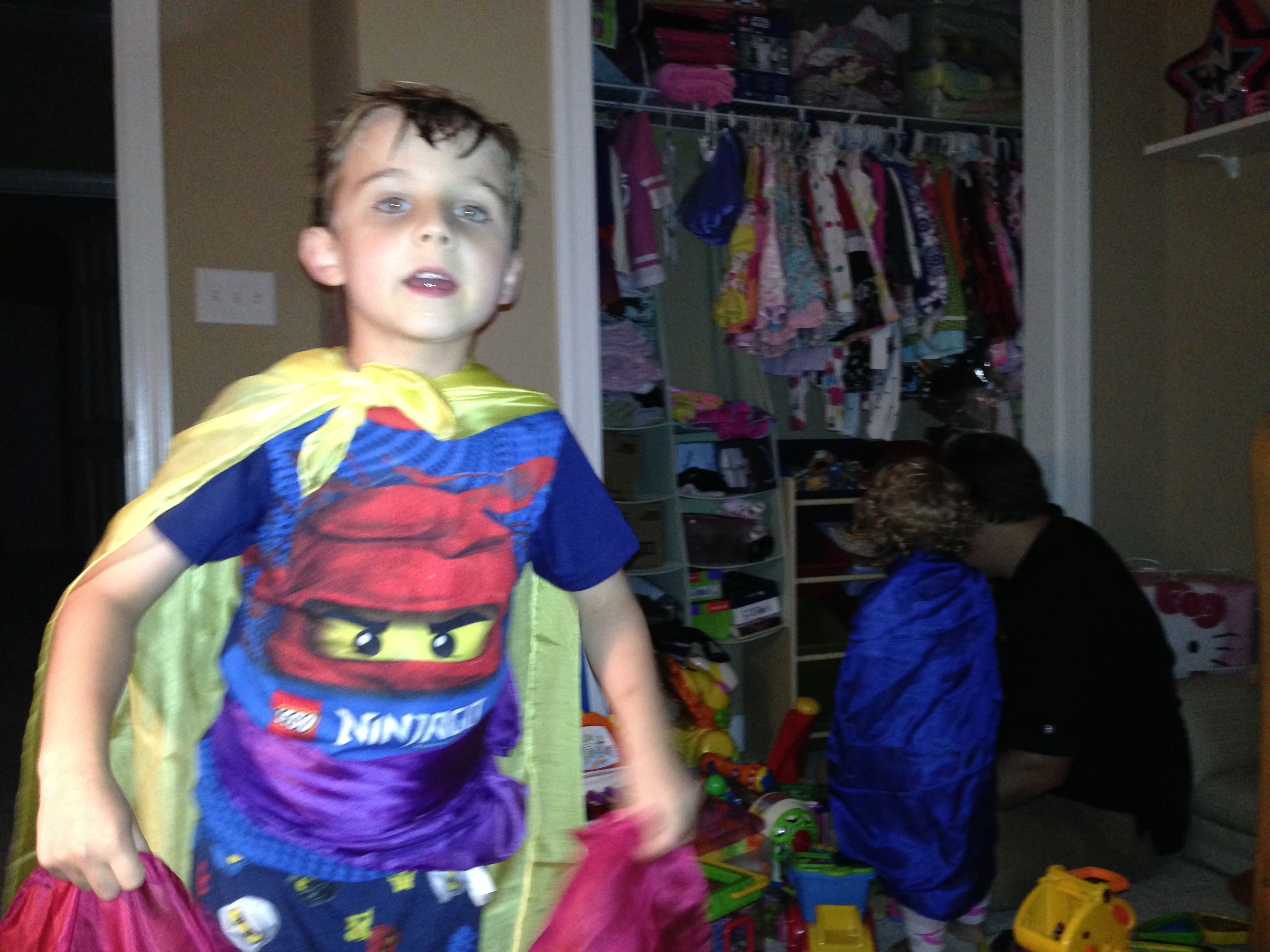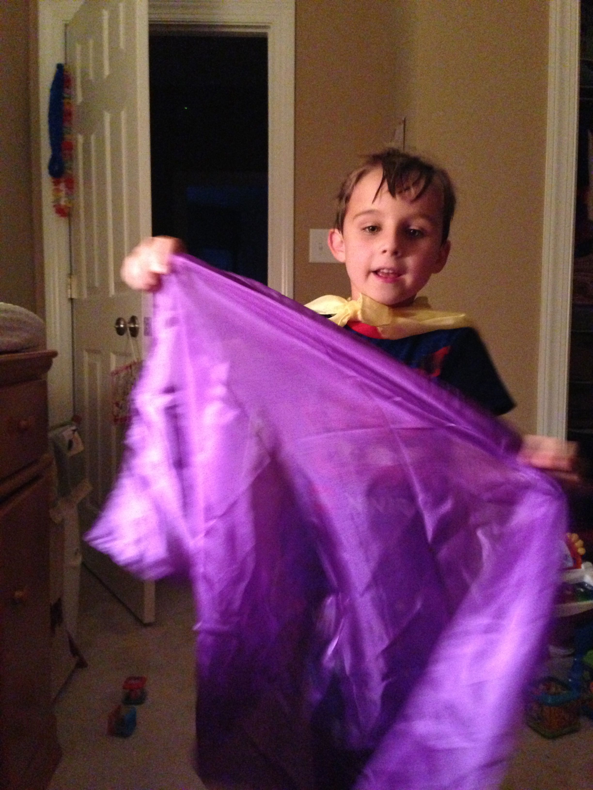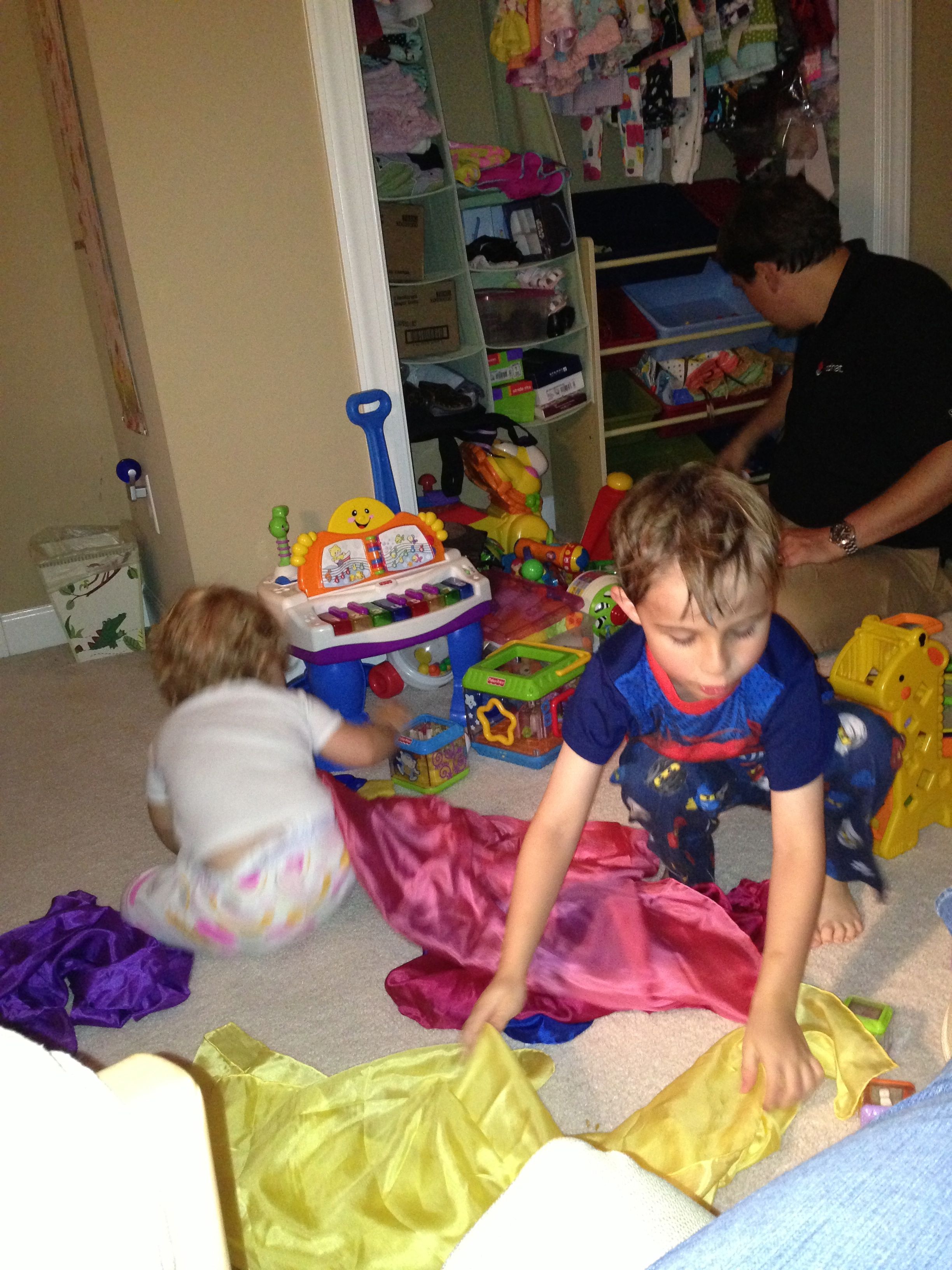The kids were very silly this Monday morning–Brian pretending to be too sleepy for school. 😉 After school, I gave the kids some play silks–big squares of colorful silk fabric, supposedly a great toy for imaginative play. They seemed to get into it, turning them into capes and headdresses. 🙂