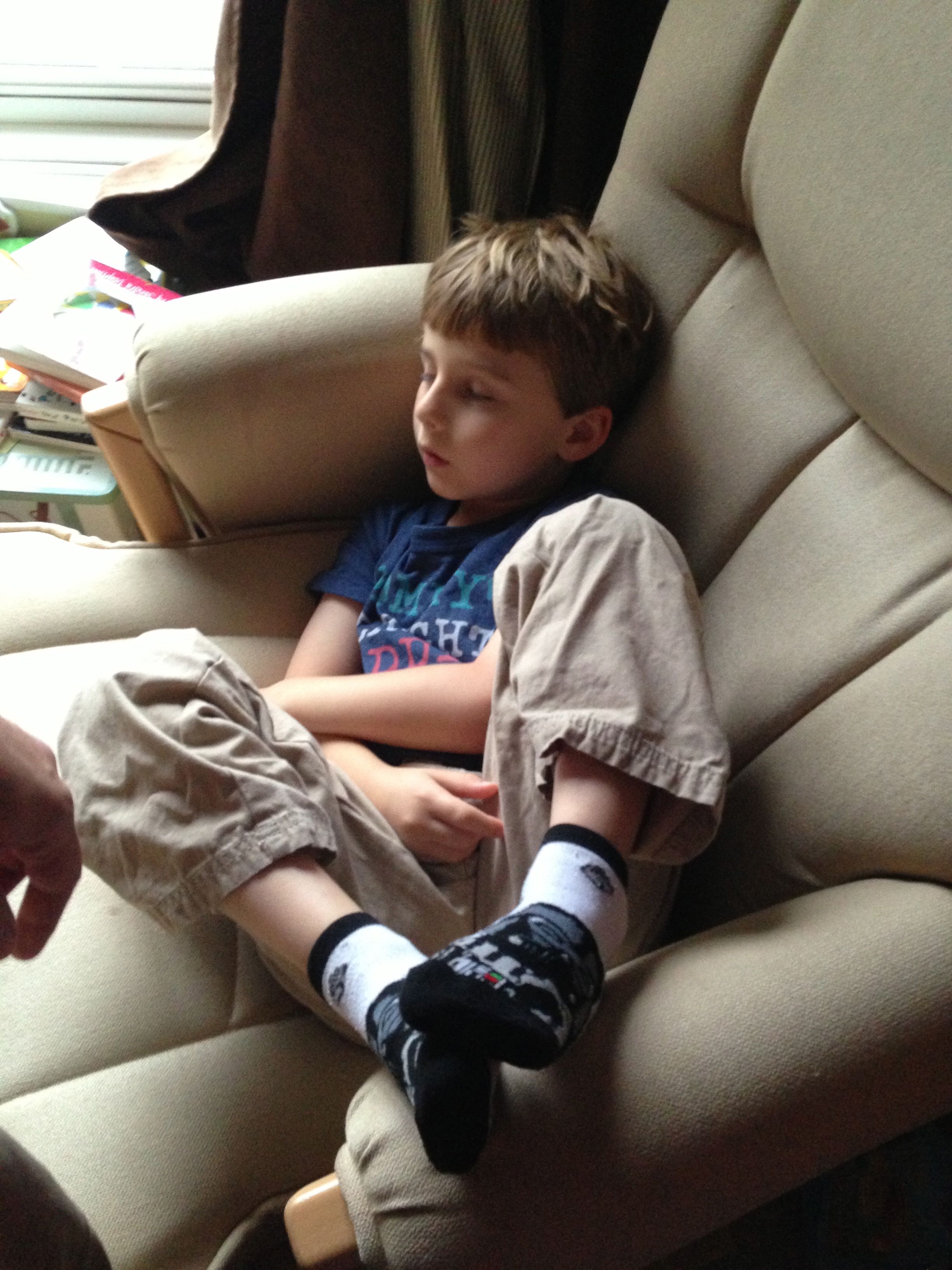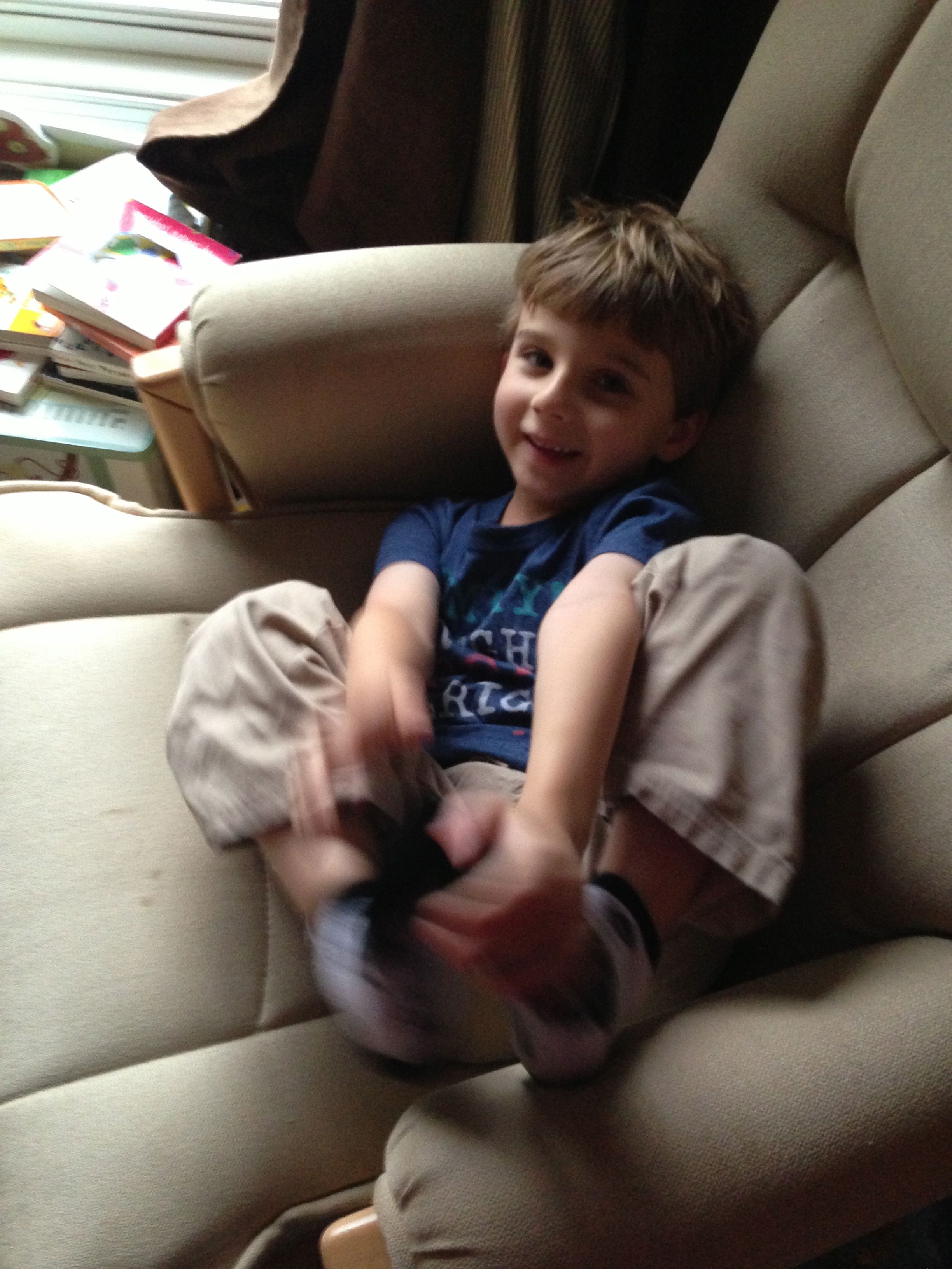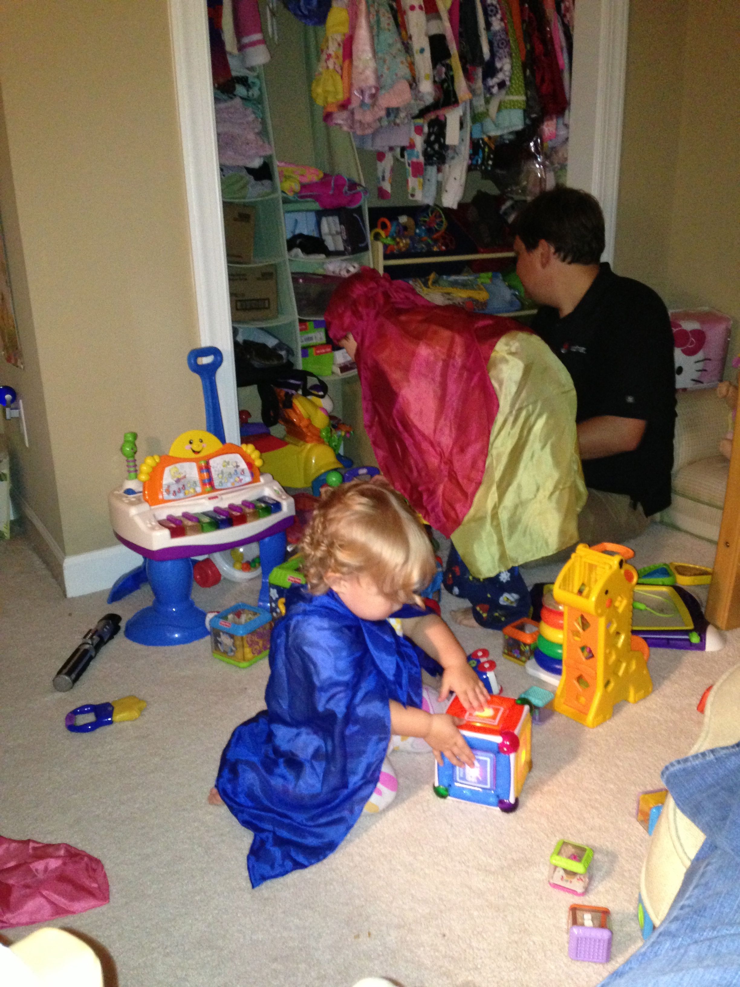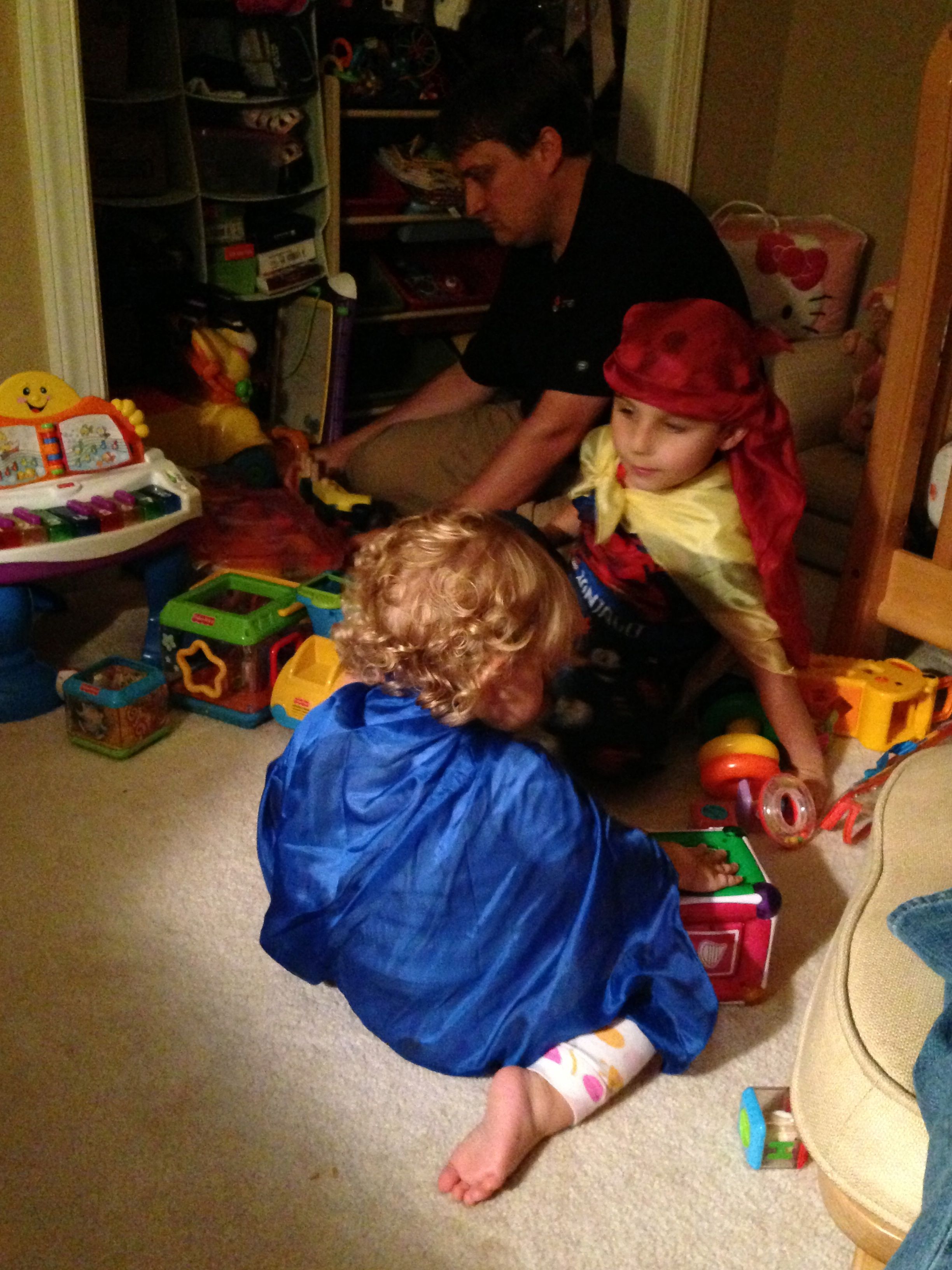 The kids were very silly this Monday morning–Brian pretending to be too sleepy for school. 😉 After school, I gave the kids some play silks–big squares of colorful silk fabric, supposedly a great toy for imaginative play. They seemed to get into it, turning them into capes and headdresses. 🙂