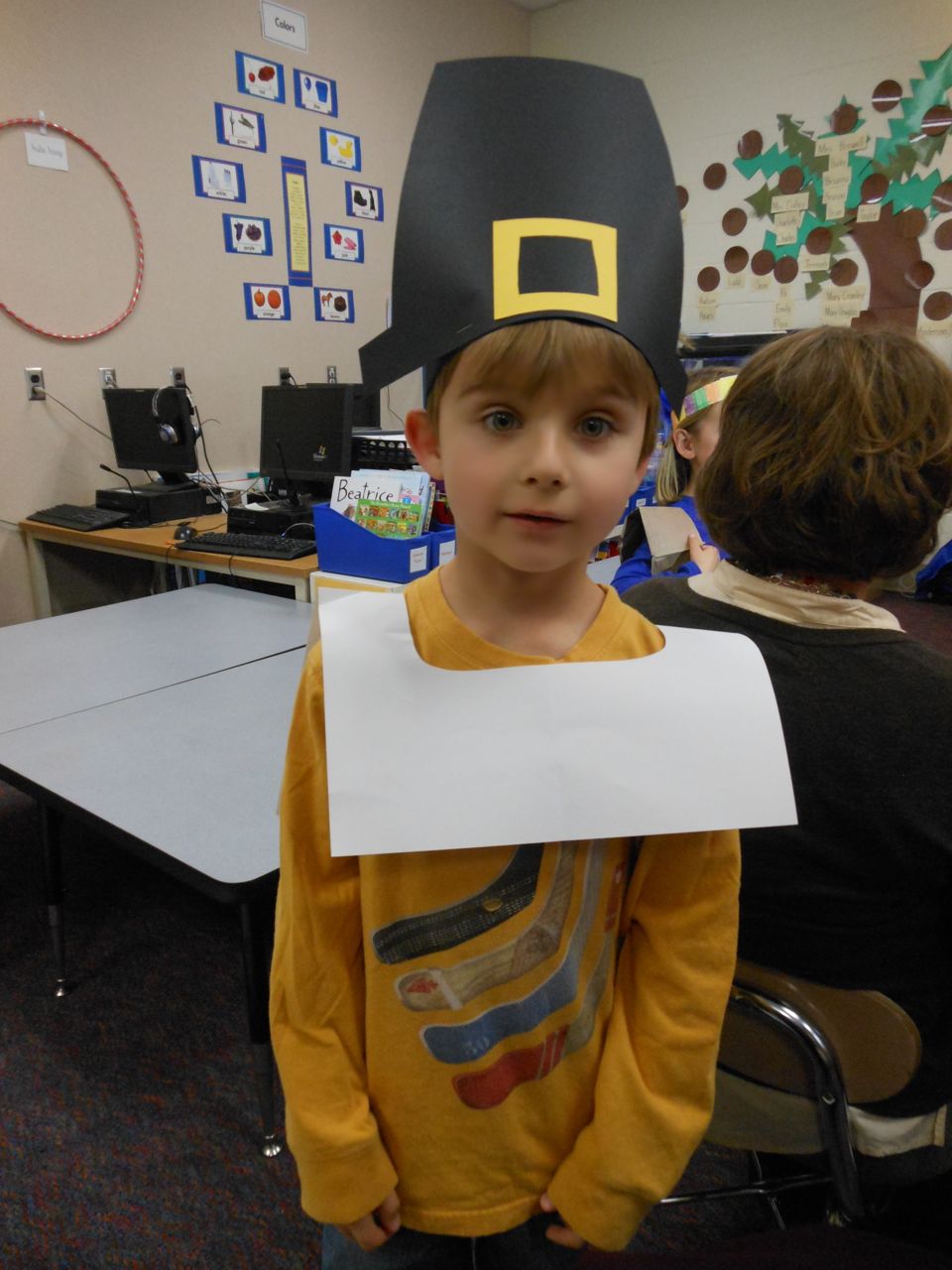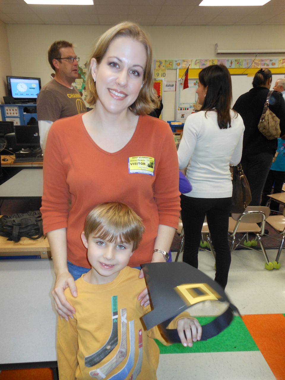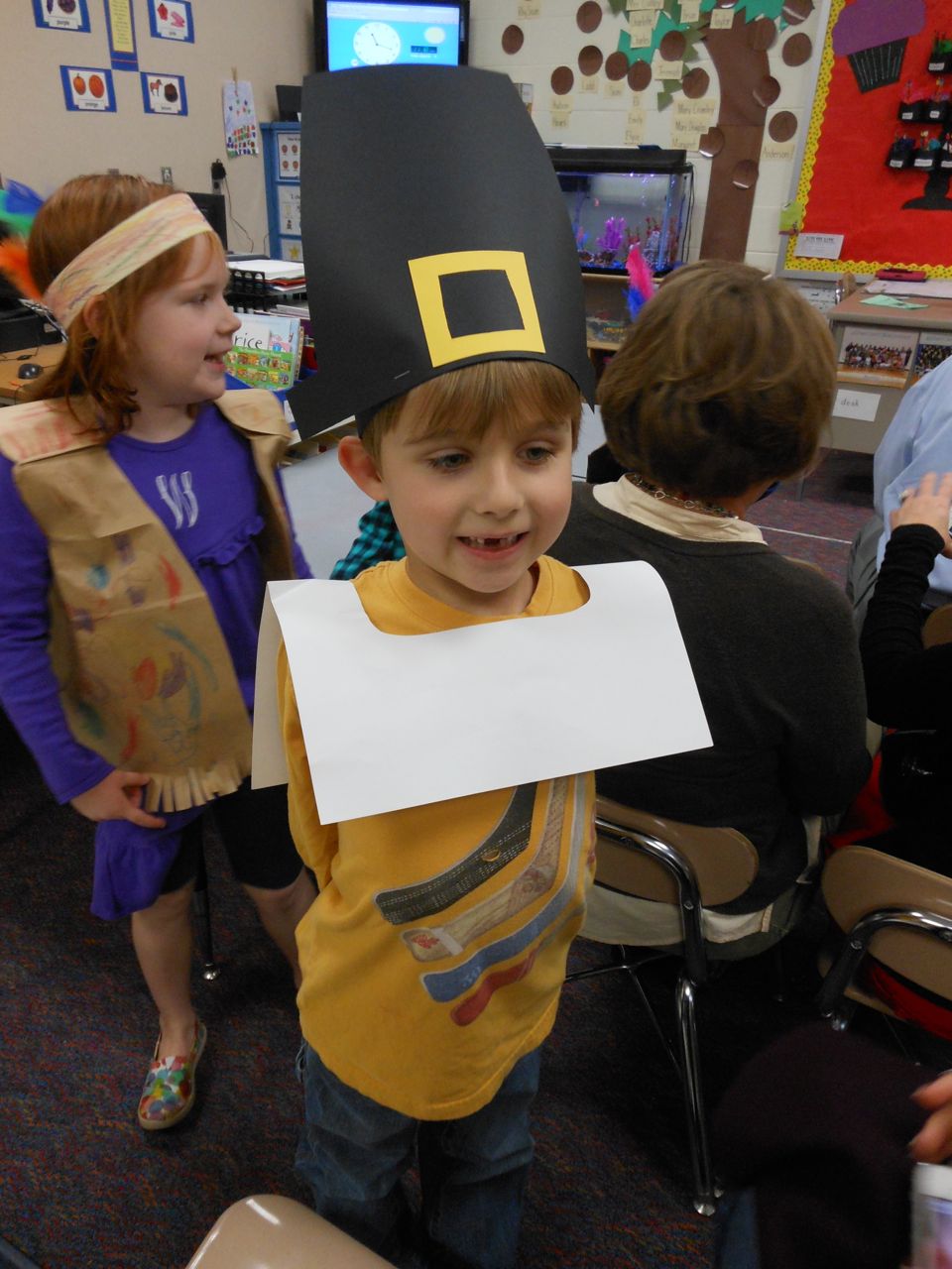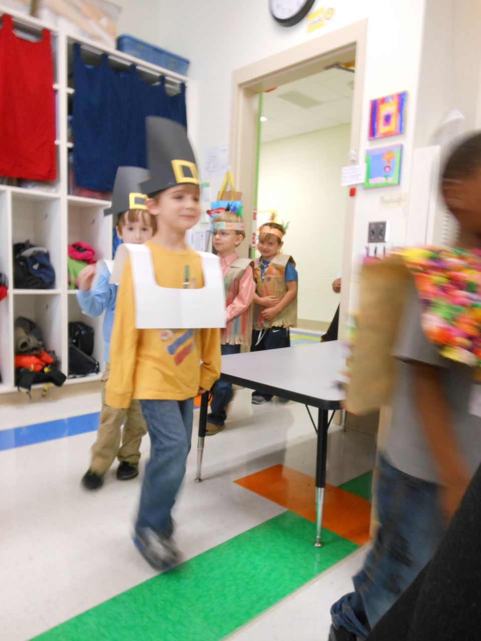 Today was Brian’s Thanksgiving play at Root! He was adorable dressed up as a construction-paper pilgrim. 🙂 Each kid had a few lines to recite, and every few lines the class did a song together. Brian had been practicing his lines quite a bit, and was well prepared. We’d even overheard him singing the songs now and then, when he thought we weren’t listening! He had wanted them to be a surprise. 😉 Brian was just bursting with pride as he marched into the room, he was so happy to see us both there! All the kids did a great job, and the songs were very cute. I did my best to get some photos through the throng of smartphone-wielding parents (of which I was one, I suppose!) Brandon managed to snag some video, which we’ve included below. Even Ms. Sarah Catherine came by to visit. After the play, the kids went outside for recess, while us parents decorated their classroom and laid out a potluck Thanksgiving feast for them. Root’s PTA moms don’t mess around, and I bet Martha herself would have approved of the decorations, and the feast. 🙂 We enjoyed seeing more of Brian’s classroom, and his artwork. We saw some of his personal items that we hear a lot about, like his walking club necklace (the kids earn feet charms to put on it, the more laps they walk or run!) We also saw his classroom job assignment indicator–this week, he is the Messenger! It was fun to see the kids play a bit, and we had a laugh about the plastic sushi being inside the cash register (the same one he liked so much at Goddard–that is on his Christmas list!) And the boys pushing around the sock monkey in the shopping cart (that’s also on his Christmas list!) We saw the famous Golden Spatula award (still not totally clear on that, but I think good behavior at lunchtime is involved in earning this glittery honor!)