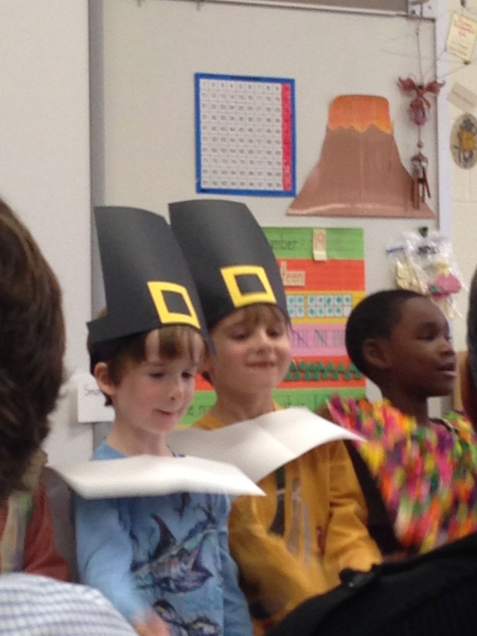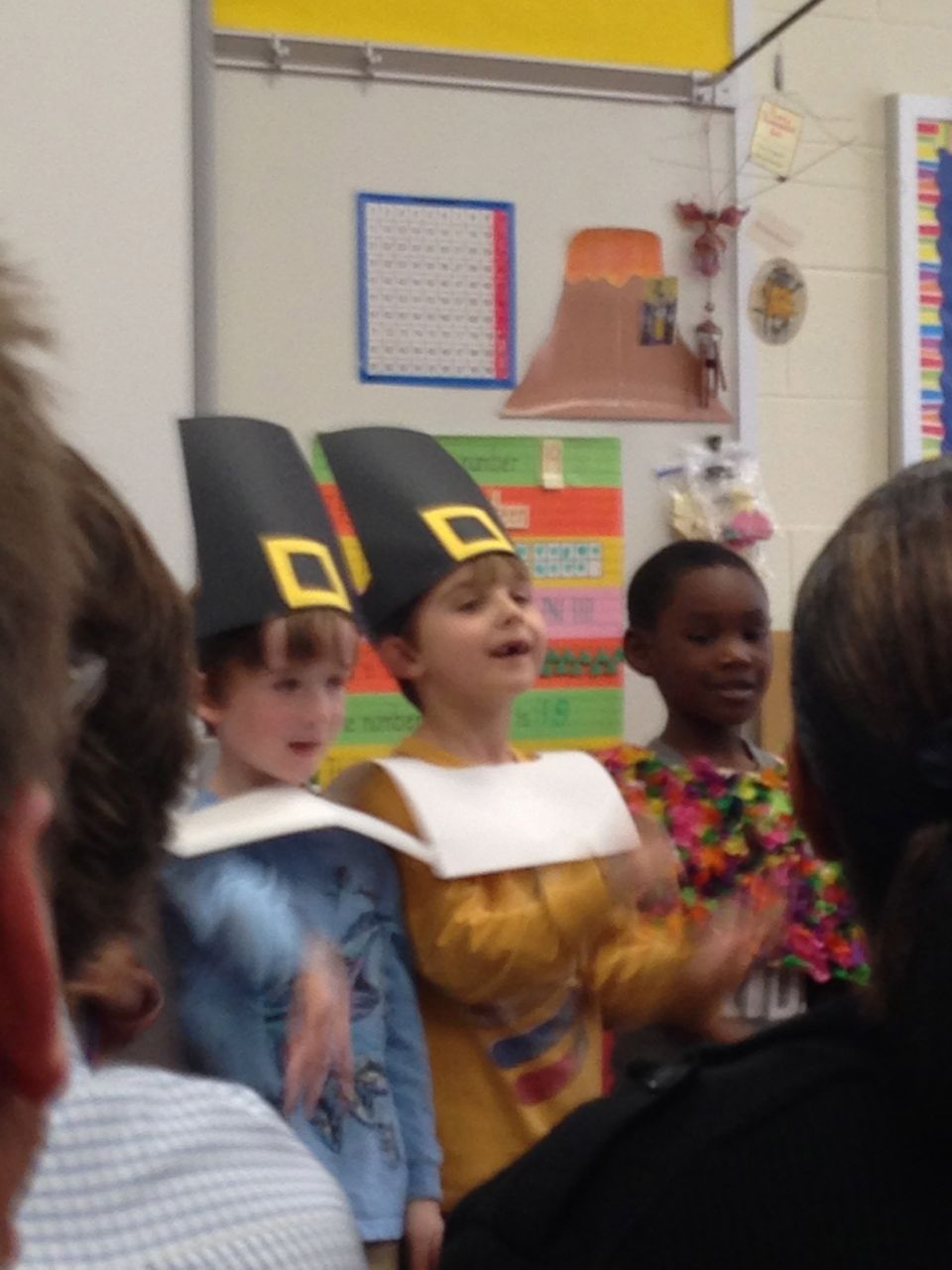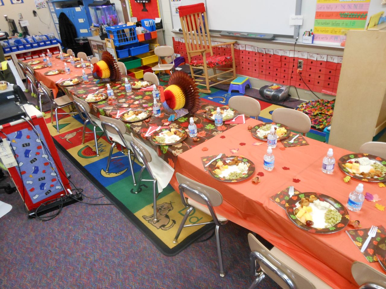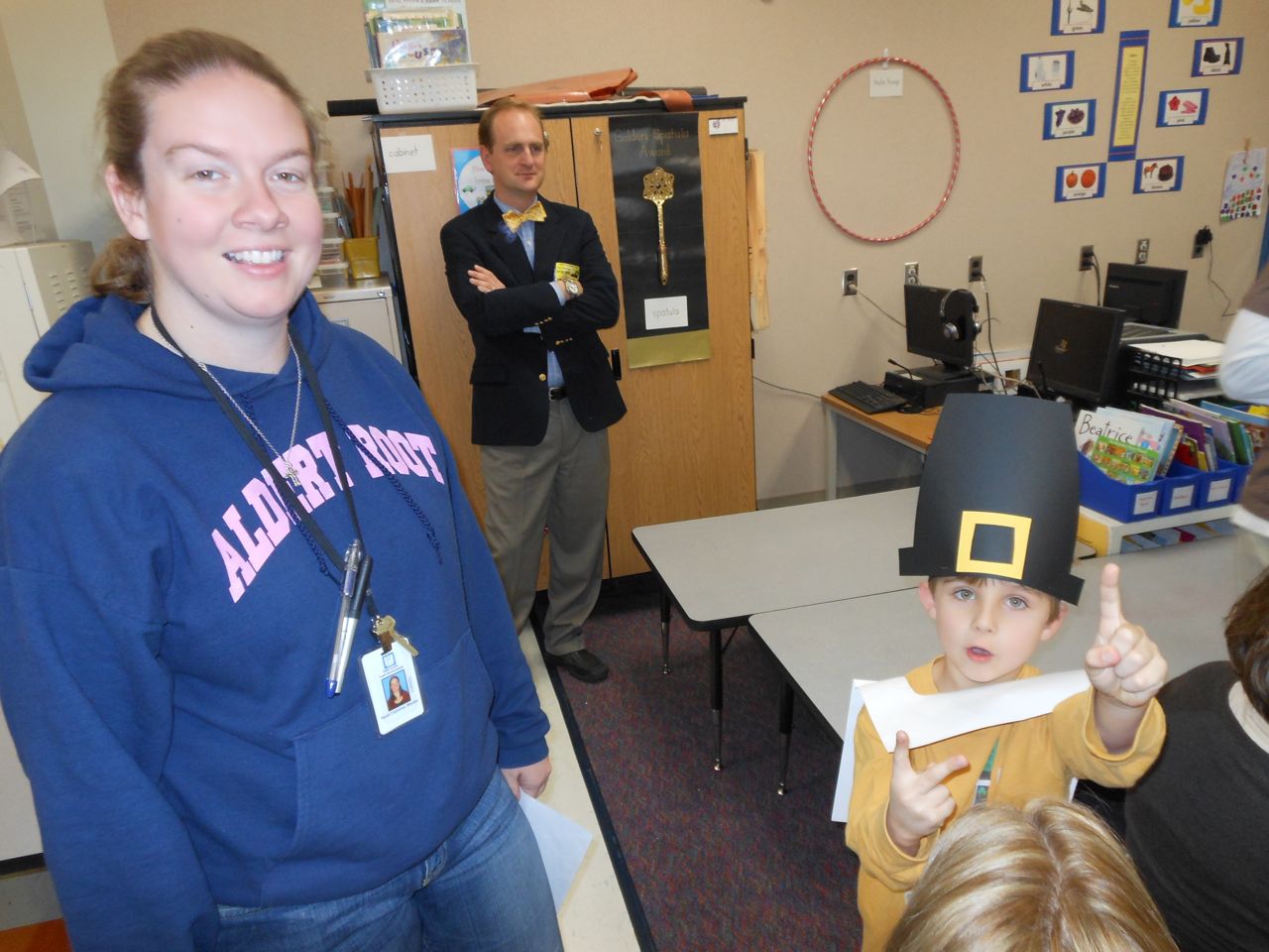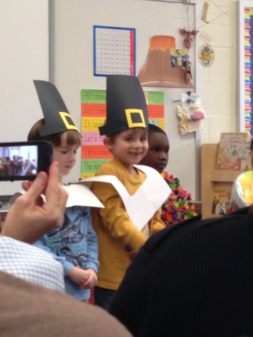 Today was Brian’s Thanksgiving play at Root! He was adorable dressed up as a construction-paper pilgrim. 🙂 Each kid had a few lines to recite, and every few lines the class did a song together. Brian had been practicing his lines quite a bit, and was well prepared. We’d even overheard him singing the songs now and then, when he thought we weren’t listening! He had wanted them to be a surprise. 😉 Brian was just bursting with pride as he marched into the room, he was so happy to see us both there! All the kids did a great job, and the songs were very cute. I did my best to get some photos through the throng of smartphone-wielding parents (of which I was one, I suppose!) Brandon managed to snag some video, which we’ve included below. Even Ms. Sarah Catherine came by to visit. After the play, the kids went outside for recess, while us parents decorated their classroom and laid out a potluck Thanksgiving feast for them. Root’s PTA moms don’t mess around, and I bet Martha herself would have approved of the decorations, and the feast. 🙂 We enjoyed seeing more of Brian’s classroom, and his artwork. We saw some of his personal items that we hear a lot about, like his walking club necklace (the kids earn feet charms to put on it, the more laps they walk or run!) We also saw his classroom job assignment indicator–this week, he is the Messenger! It was fun to see the kids play a bit, and we had a laugh about the plastic sushi being inside the cash register (the same one he liked so much at Goddard–that is on his Christmas list!) And the boys pushing around the sock monkey in the shopping cart (that’s also on his Christmas list!) We saw the famous Golden Spatula award (still not totally clear on that, but I think good behavior at lunchtime is involved in earning this glittery honor!)