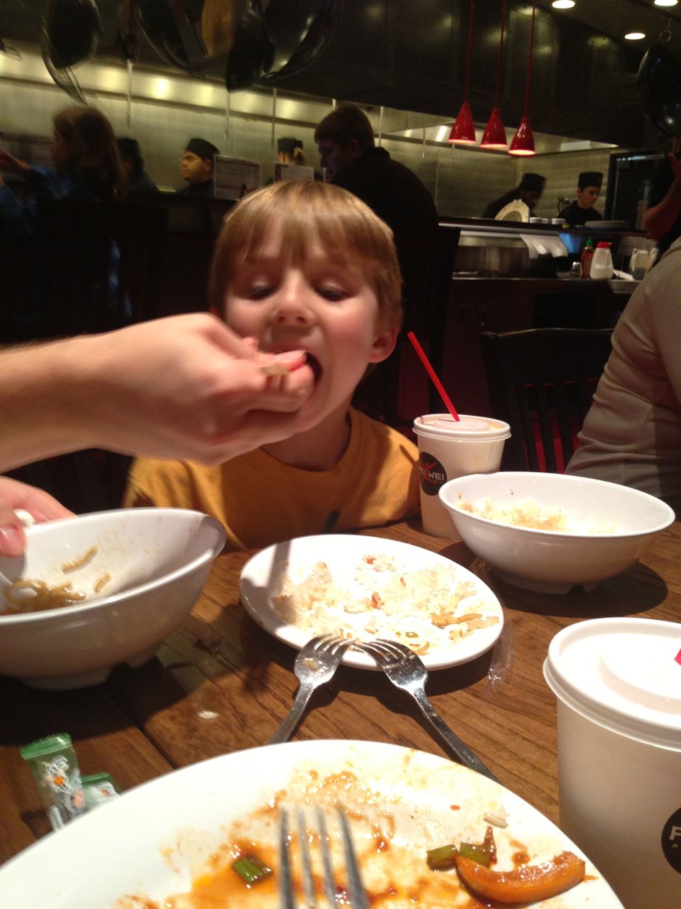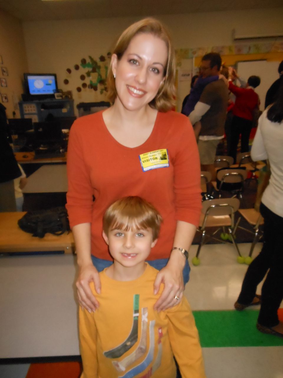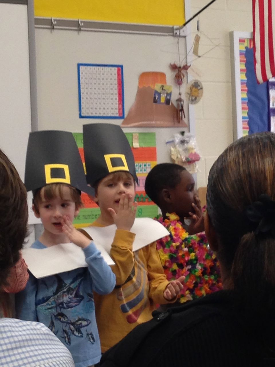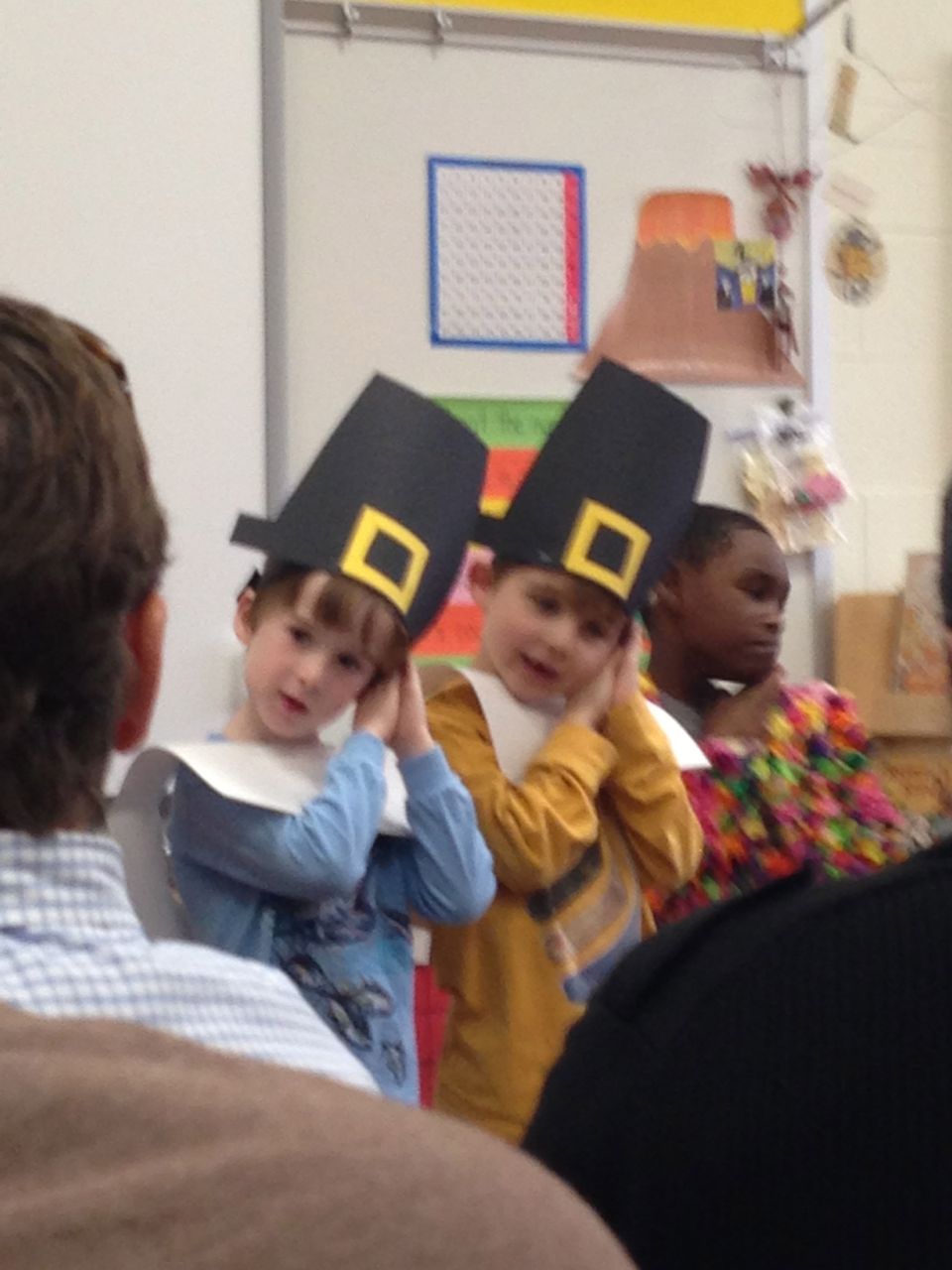 Today was Brian’s Thanksgiving play at Root! He was adorable dressed up as a construction-paper pilgrim. 🙂 Each kid had a few lines to recite, and every few lines the class did a song together. Brian had been practicing his lines quite a bit, and was well prepared. We’d even overheard him singing the songs now and then, when he thought we weren’t listening! He had wanted them to be a surprise. 😉 Brian was just bursting with pride as he marched into the room, he was so happy to see us both there! All the kids did a great job, and the songs were very cute. I did my best to get some photos through the throng of smartphone-wielding parents (of which I was one, I suppose!) Brandon managed to snag some video, which we’ve included below. Even Ms. Sarah Catherine came by to visit. After the play, the kids went outside for recess, while us parents decorated their classroom and laid out a potluck Thanksgiving feast for them. Root’s PTA moms don’t mess around, and I bet Martha herself would have approved of the decorations, and the feast. 🙂 We enjoyed seeing more of Brian’s classroom, and his artwork. We saw some of his personal items that we hear a lot about, like his walking club necklace (the kids earn feet charms to put on it, the more laps they walk or run!) We also saw his classroom job assignment indicator–this week, he is the Messenger! It was fun to see the kids play a bit, and we had a laugh about the plastic sushi being inside the cash register (the same one he liked so much at Goddard–that is on his Christmas list!) And the boys pushing around the sock monkey in the shopping cart (that’s also on his Christmas list!) We saw the famous Golden Spatula award (still not totally clear on that, but I think good behavior at lunchtime is involved in earning this glittery honor!)