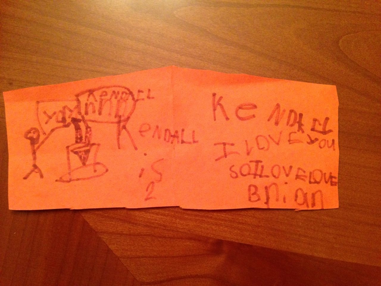 Soon, it was time to go, and we let Brian finish up his day at school. We had our own mission to accomplish–picking up Kendall’s birthday cake! We went home briefly, and then headed out toward the Cupcake Shoppe–and we saw Brian’s white bus on its way to Laurel Hills! He didn’t see us, but we thought it was neat to see his bus. Kendall’s cake was adorable, and matched her party supplies very well! It even had a dusting of edible glitter! I think she will love it. After school, we picked up the kids and realized we needed a few last-minute supplies for her party.. So we took the kids out to dinner at Pei Wei, and then went over to Party City. Brian wanted this shiny plastic sword from the leftover-Halloween supplies.. But we figure he has armaments enough already. When we got home, Brian showed us the birthday card he’d made for Kendall–so sweet! “Kendall I love you so, I love love”–aww..! It even had a cake with two candles and pizza. 🙂