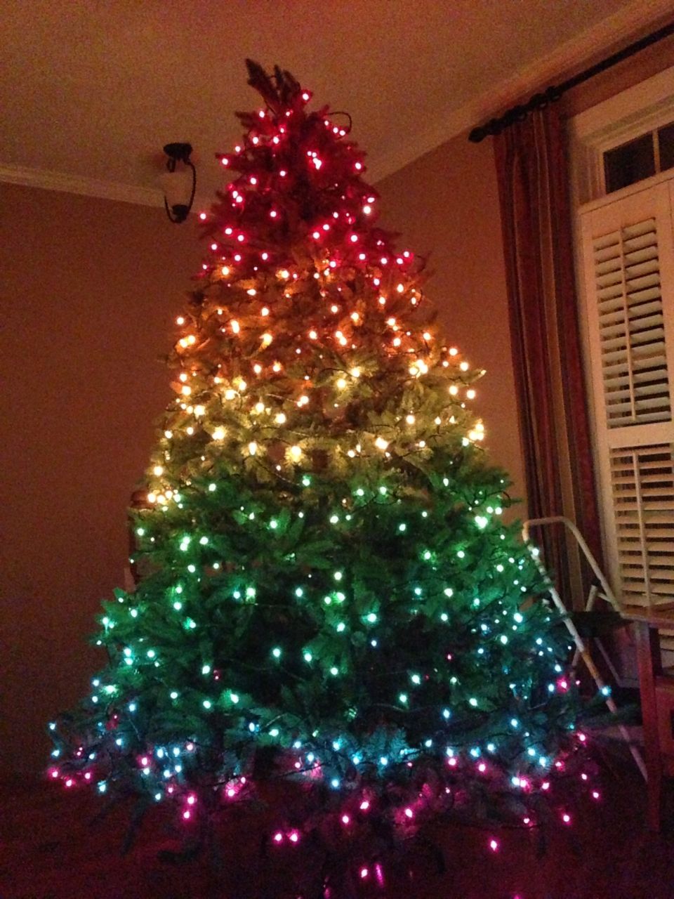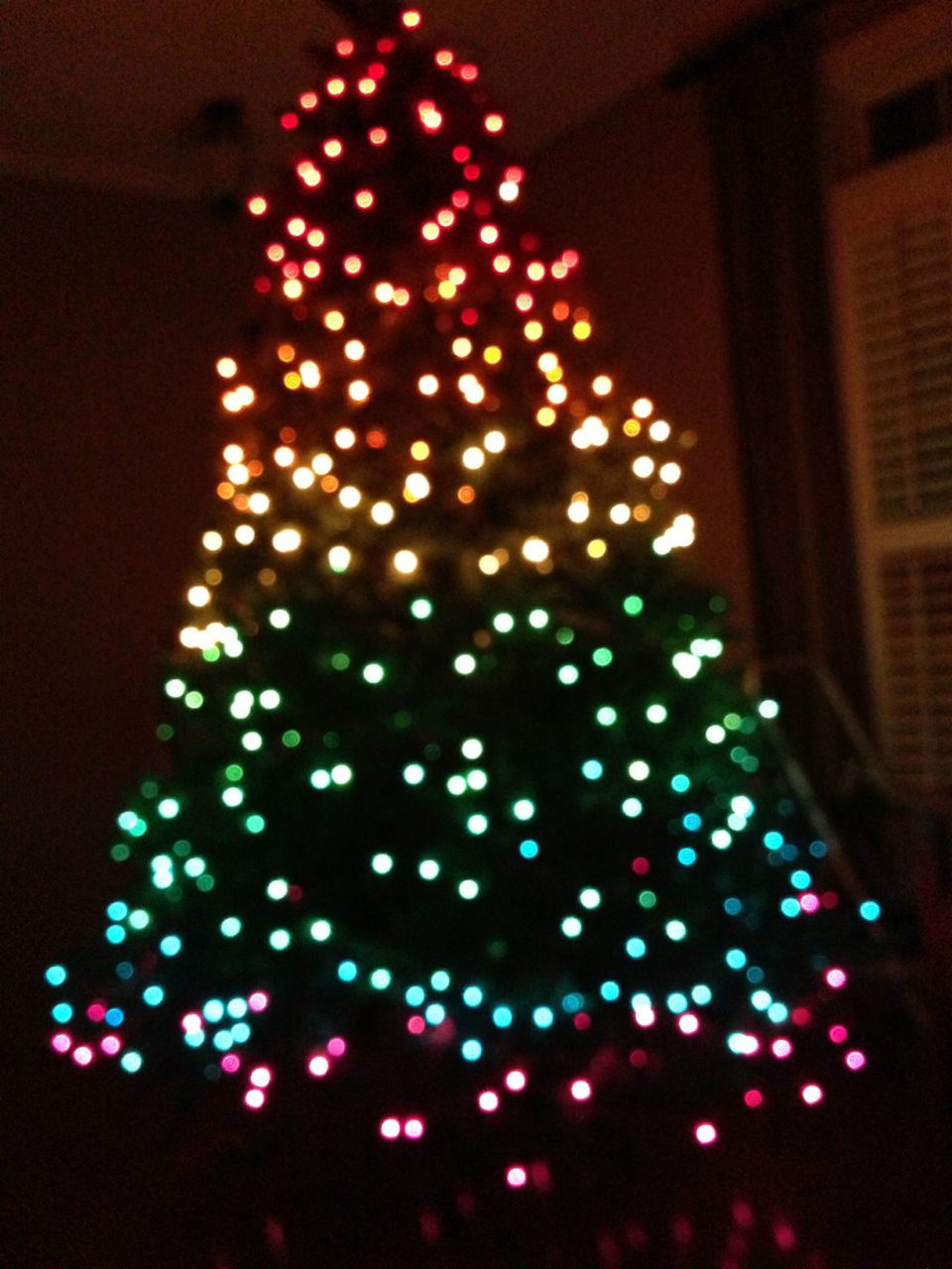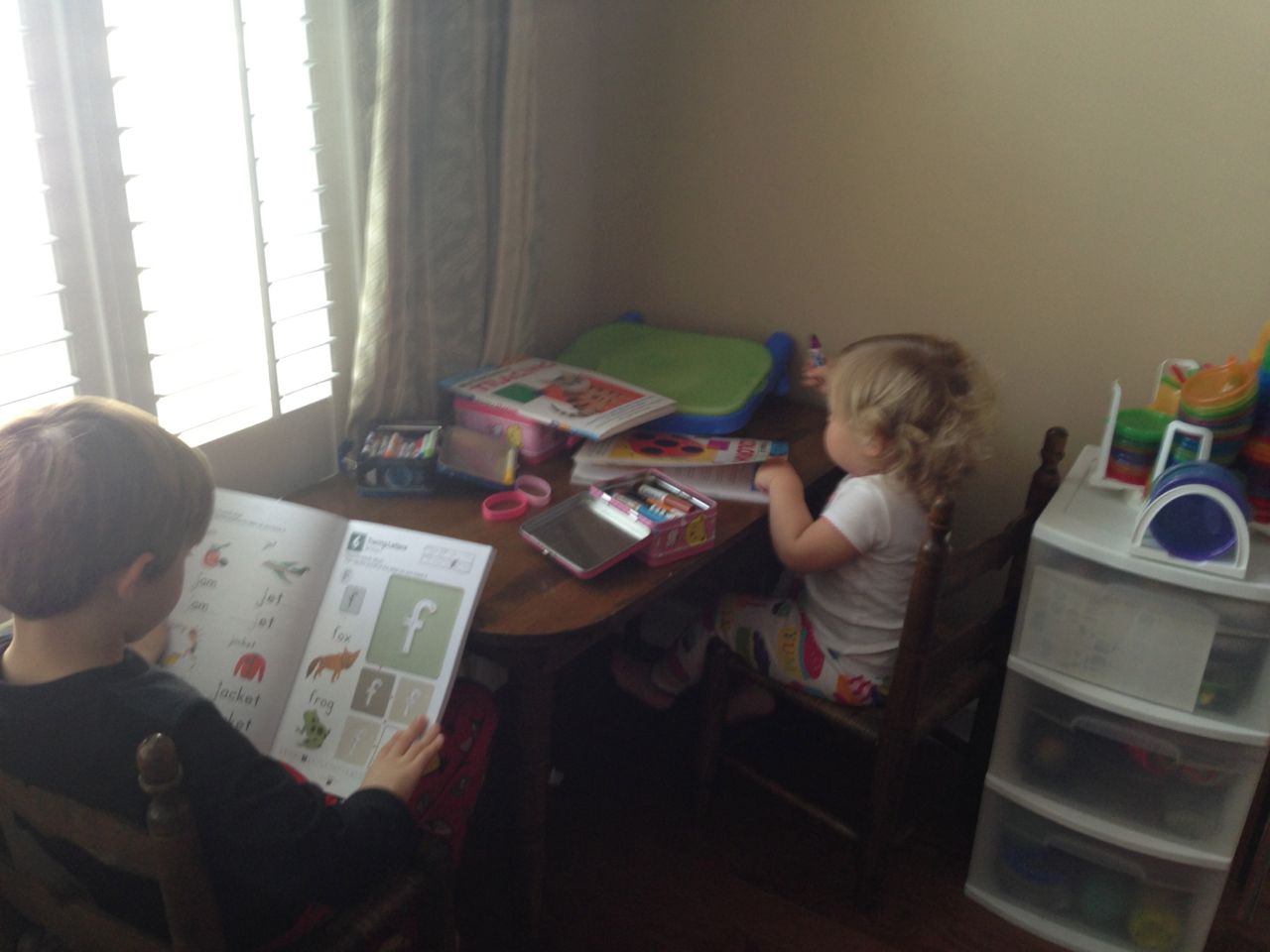 We put our Christmas tree up today! Although, we had another rude awakening this year–all three extra-long, heavy-duty multicolored strings of lights that we’d had for years had stopped working. So now, not only is our tree no longer pre-lit, (the original lights previously painstakingly removed by Brandon..) Our backup-plan lights are a no-go (even after a valiant effort at fixing them, by Brandon). So, we improvised! Years ago, when we were heavy into our dinner-parties-and-entertaining phase, I’d bought strings of lights in just about every color you could imagine, thinking I’d use them for themed parties. Purple, amber, and green for Mardi Gras, red white and blue for July 4th, and so on. We hadn’t used those lights in quite awhile, but we ran the idea of a rainbow tree by the kids, and they loved the idea! So, we embarked on our plan, and we were all quite pleased with the results! We had hoped to get it decorated today as well, but, that just leaves more fun for tomorrow, I guess! Plus, the rainbow tree looks pretty fabulous all by itself. 😉 Also included, some pictures of the kids doing some blessedly quiet workbook activities.
