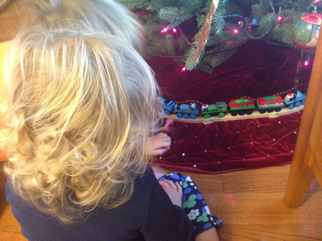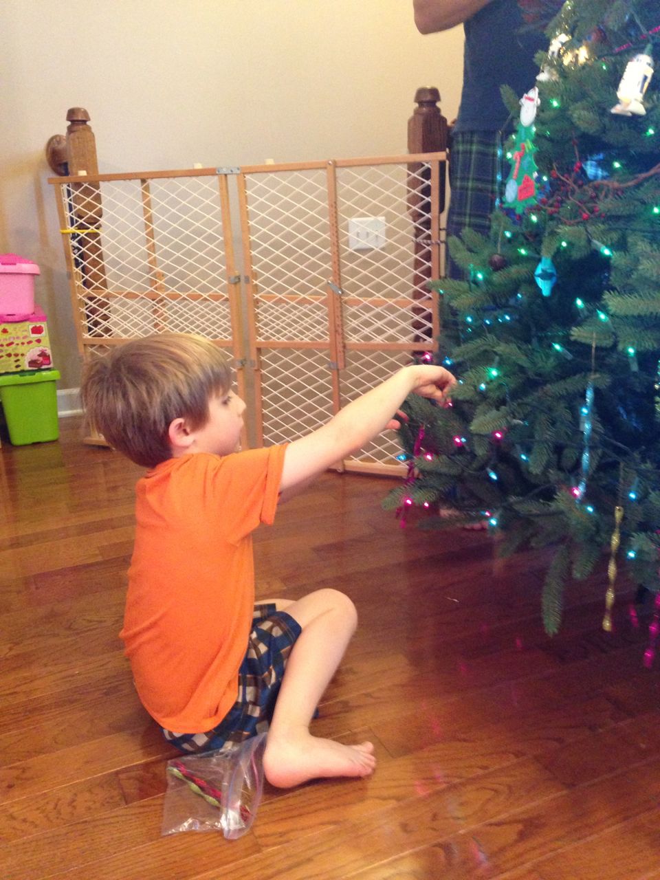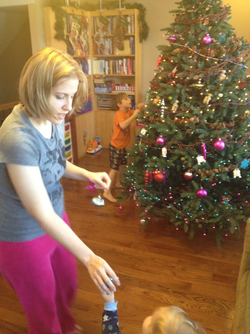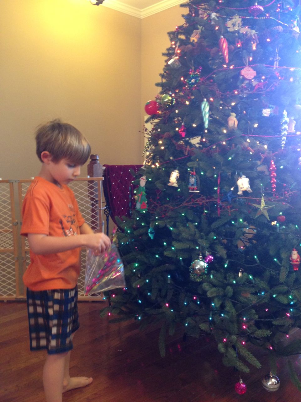 We finished up our Thanksgiving break today by being very industrious, even though we stayed in our PJs past noon! We managed to get the tree decorated fully, with the train underneath and all. Brian loves these Mameshiba characters so much right now, he made his own Mameshiba ornament! He drew a very nice edamame. 🙂 I got the motivation to do a bit of cooking, and made a lovely homemade chicken soup, totally from scratch, including a whole chicken. At the same time, I made a big crock pot full of beef stew. We’ll be set for a few meals this week, plus some to set by in the freezer. I used these tiny star-shaped pasta called stelline in the chicken soup–I showed them to Kendall (who was watching me as I cooked) and she wanted to touch them. I put a few on the table, and to my surprise, she ate them up, uncooked and all! Silly girl. She did like them better in the soup, I think!