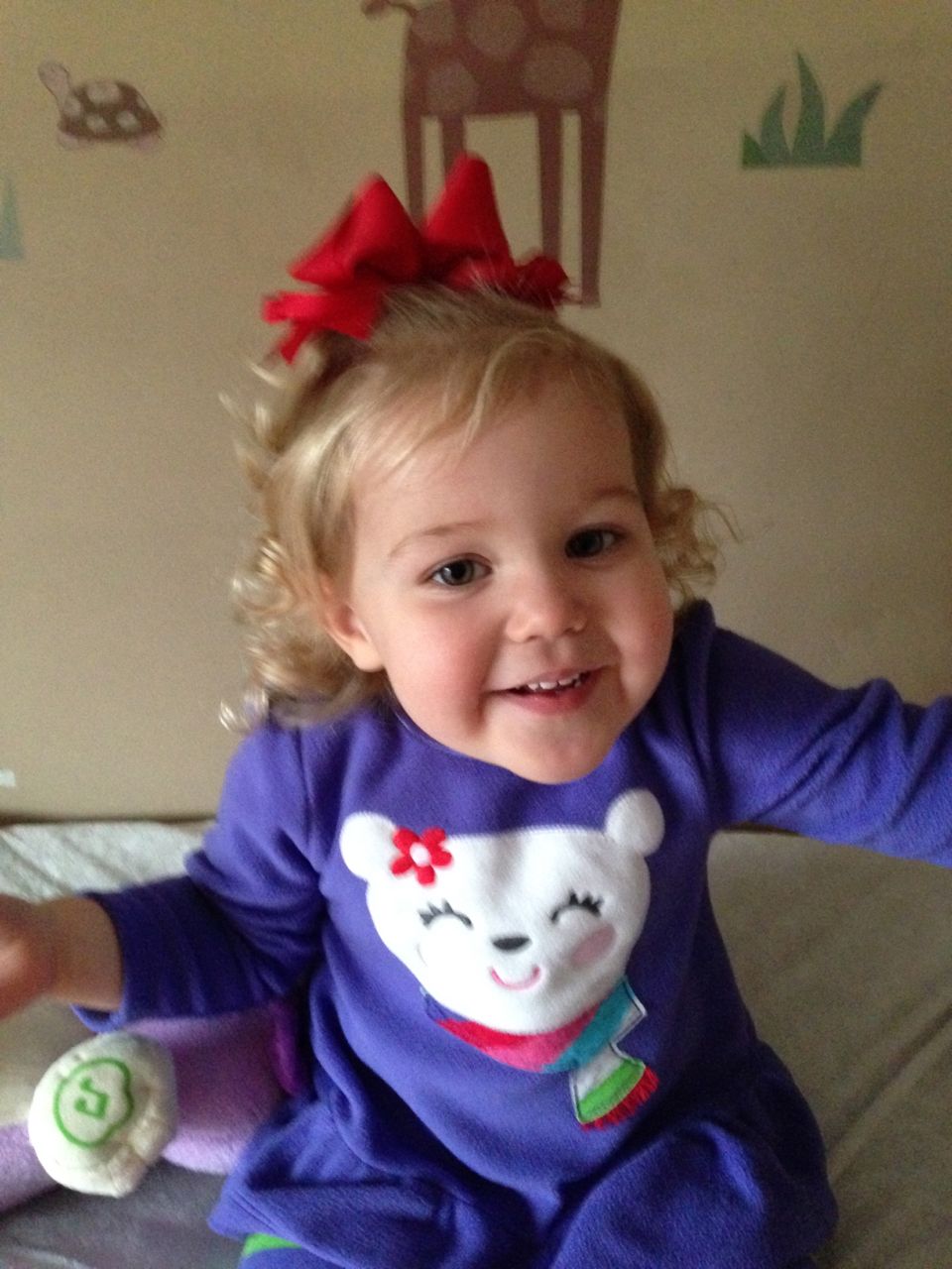 Kendall received this big hairbow along with a sweater I purchased for her from eBay–how nice of the seller to include it as a bonus!  Kendall thought it was awesome and was very excited to wear it. 🙂
