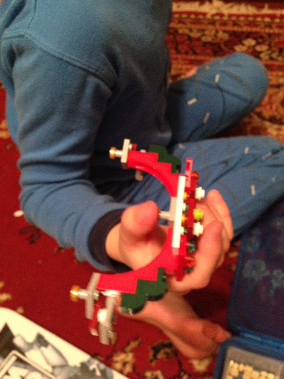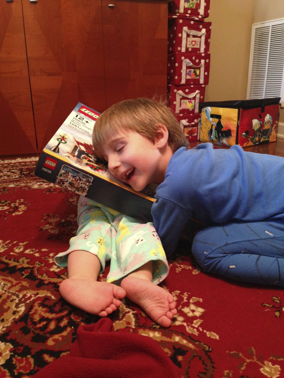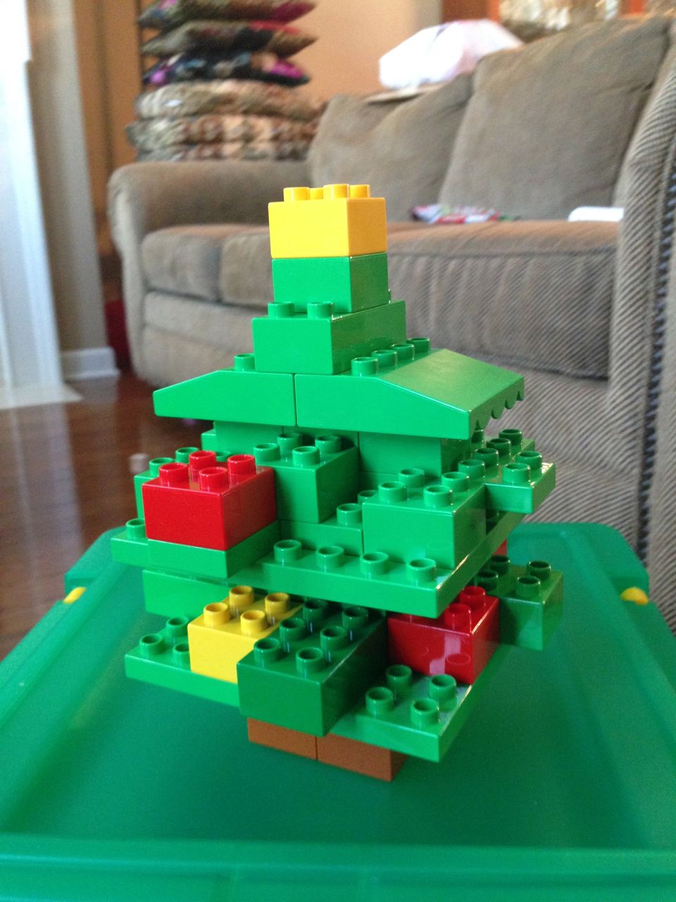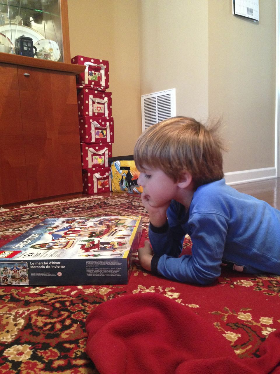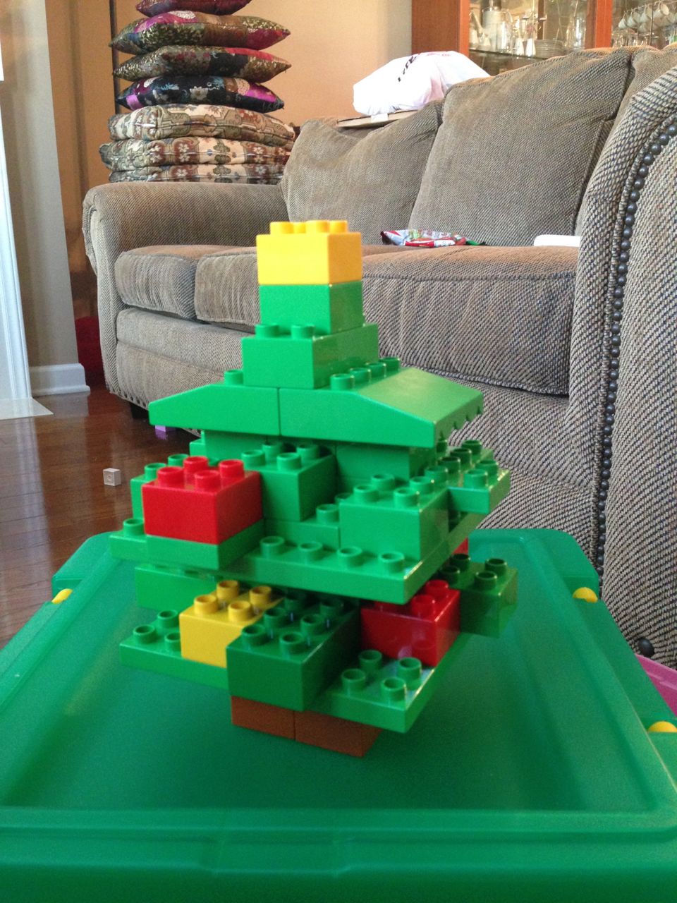 Today we started building this year’s Winter  Village addition, the new Lego Winter Market!  Brian was so happy to get into a new set!  He made a lot of his own creations with the parts, while Brandon and I ended up doing the bulk of the assembly. 😉  Once we had to reclaim the bulk of his parts, Brian moved onto other toys, and Kendall with him.  They played cooking and restaurant with the toy food for quite awhile!  Brian and Kendall played with Duplos as well, making tall houses and hotels, and I helped them make a Duplo Christmas tree.  They were very happy to eat their Gingerman cookies as a special after-lunch dessert!