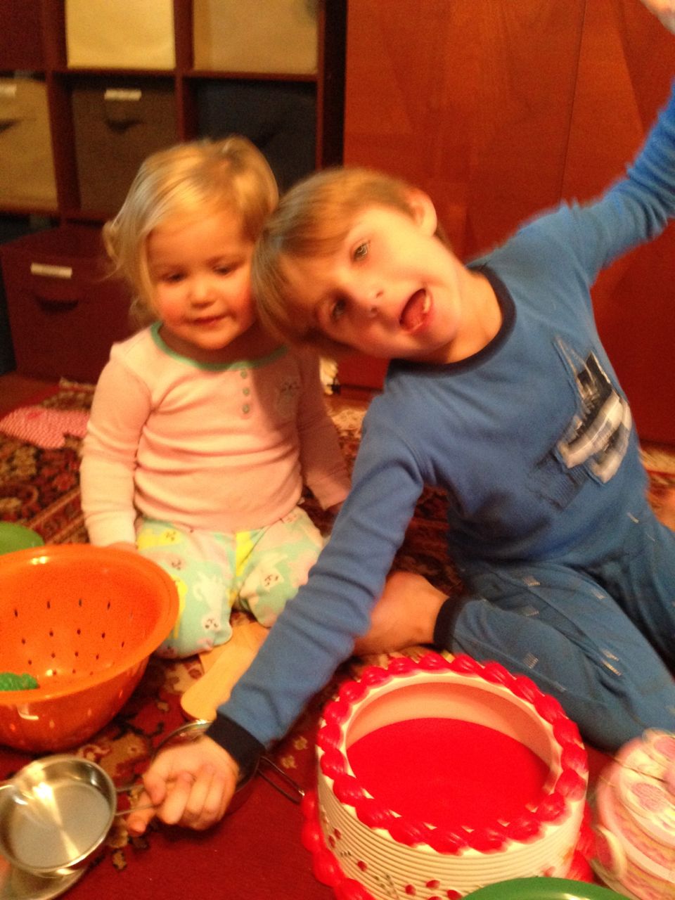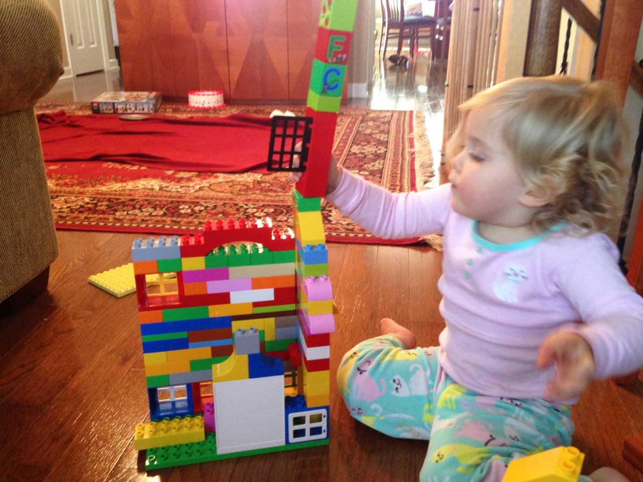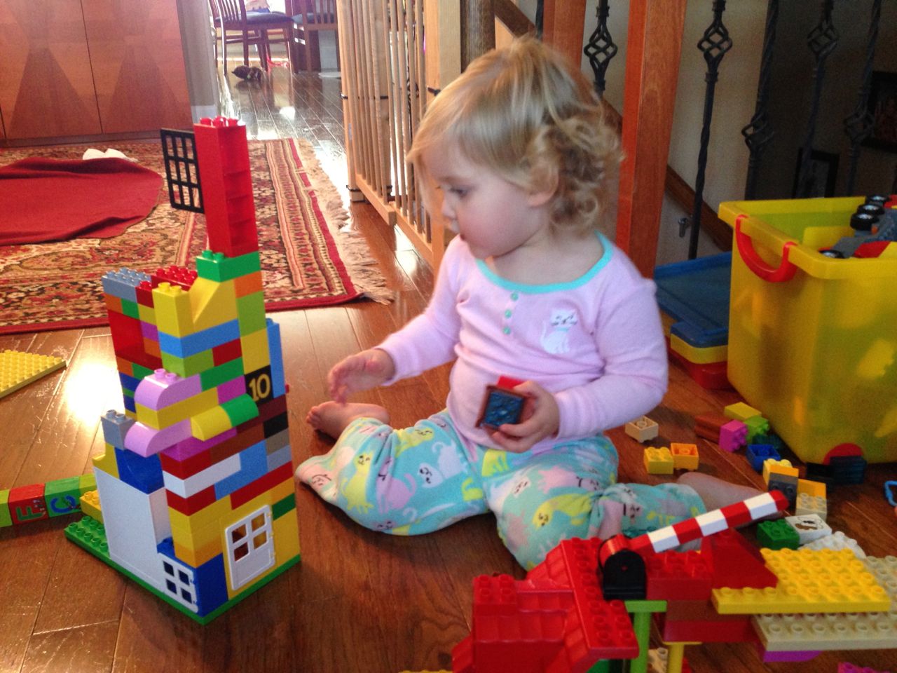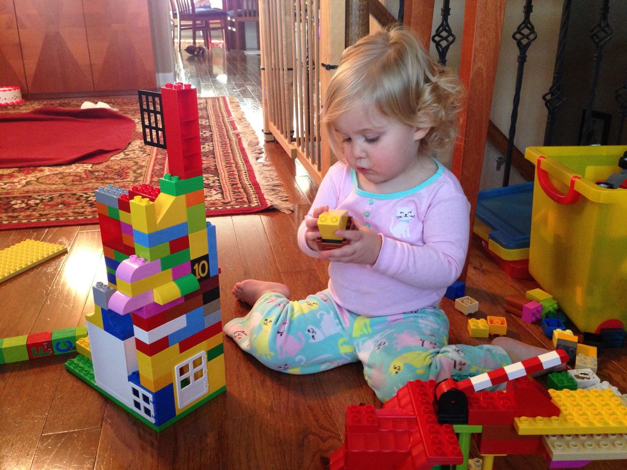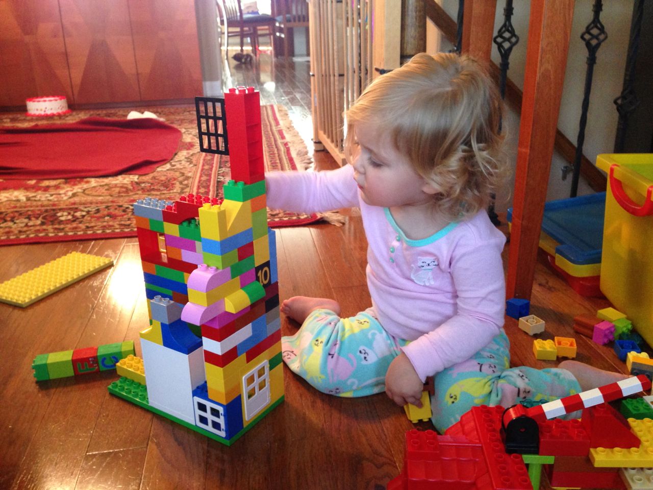 Today we started building this year’s Winter  Village addition, the new Lego Winter Market!  Brian was so happy to get into a new set!  He made a lot of his own creations with the parts, while Brandon and I ended up doing the bulk of the assembly. 😉  Once we had to reclaim the bulk of his parts, Brian moved onto other toys, and Kendall with him.  They played cooking and restaurant with the toy food for quite awhile!  Brian and Kendall played with Duplos as well, making tall houses and hotels, and I helped them make a Duplo Christmas tree.  They were very happy to eat their Gingerman cookies as a special after-lunch dessert!