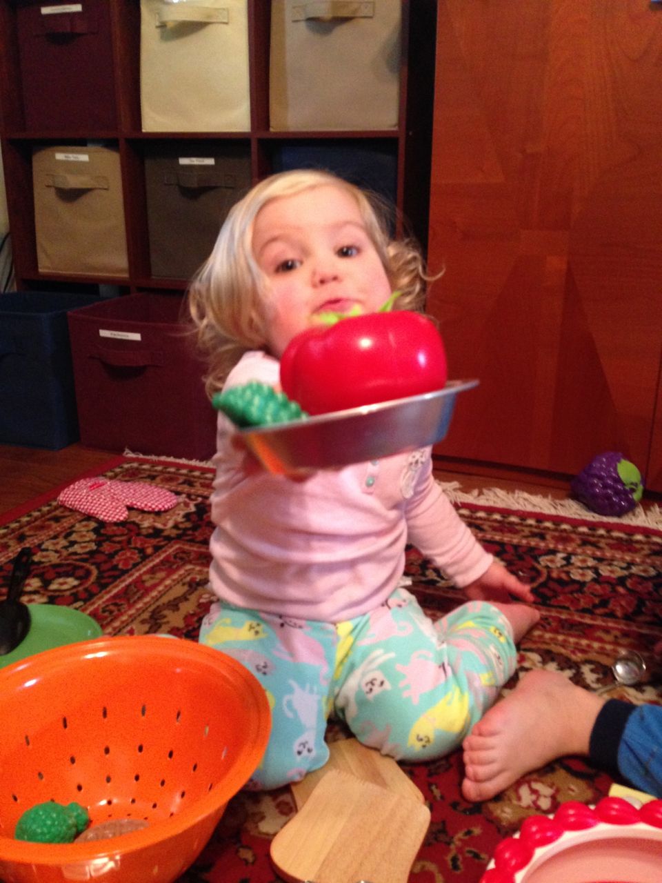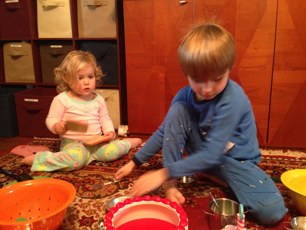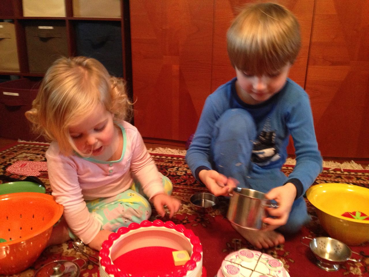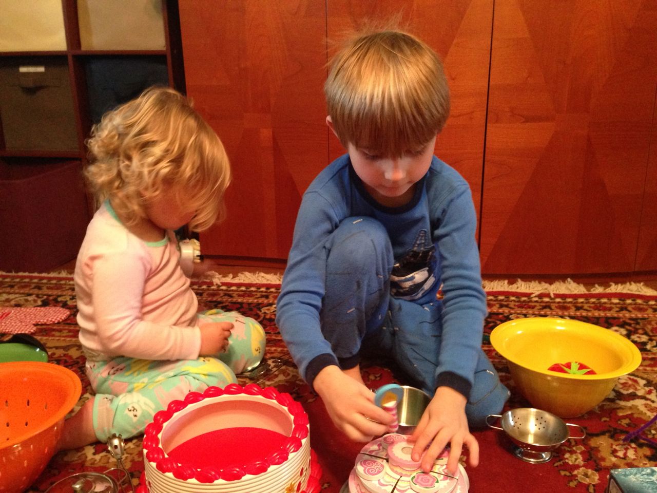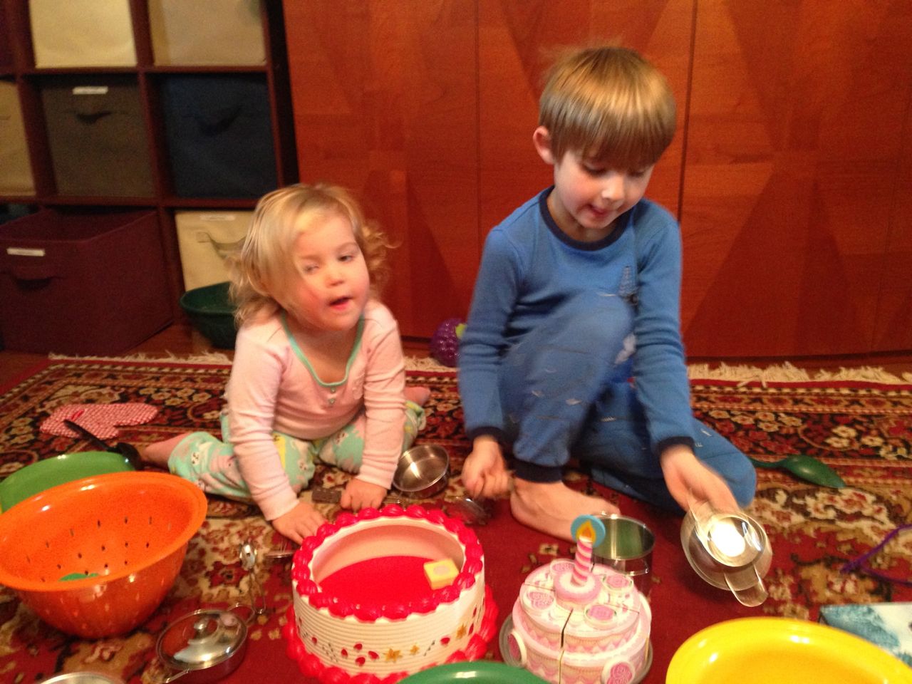 Today we started building this year’s Winter  Village addition, the new Lego Winter Market!  Brian was so happy to get into a new set!  He made a lot of his own creations with the parts, while Brandon and I ended up doing the bulk of the assembly. 😉  Once we had to reclaim the bulk of his parts, Brian moved onto other toys, and Kendall with him.  They played cooking and restaurant with the toy food for quite awhile!  Brian and Kendall played with Duplos as well, making tall houses and hotels, and I helped them make a Duplo Christmas tree.  They were very happy to eat their Gingerman cookies as a special after-lunch dessert!