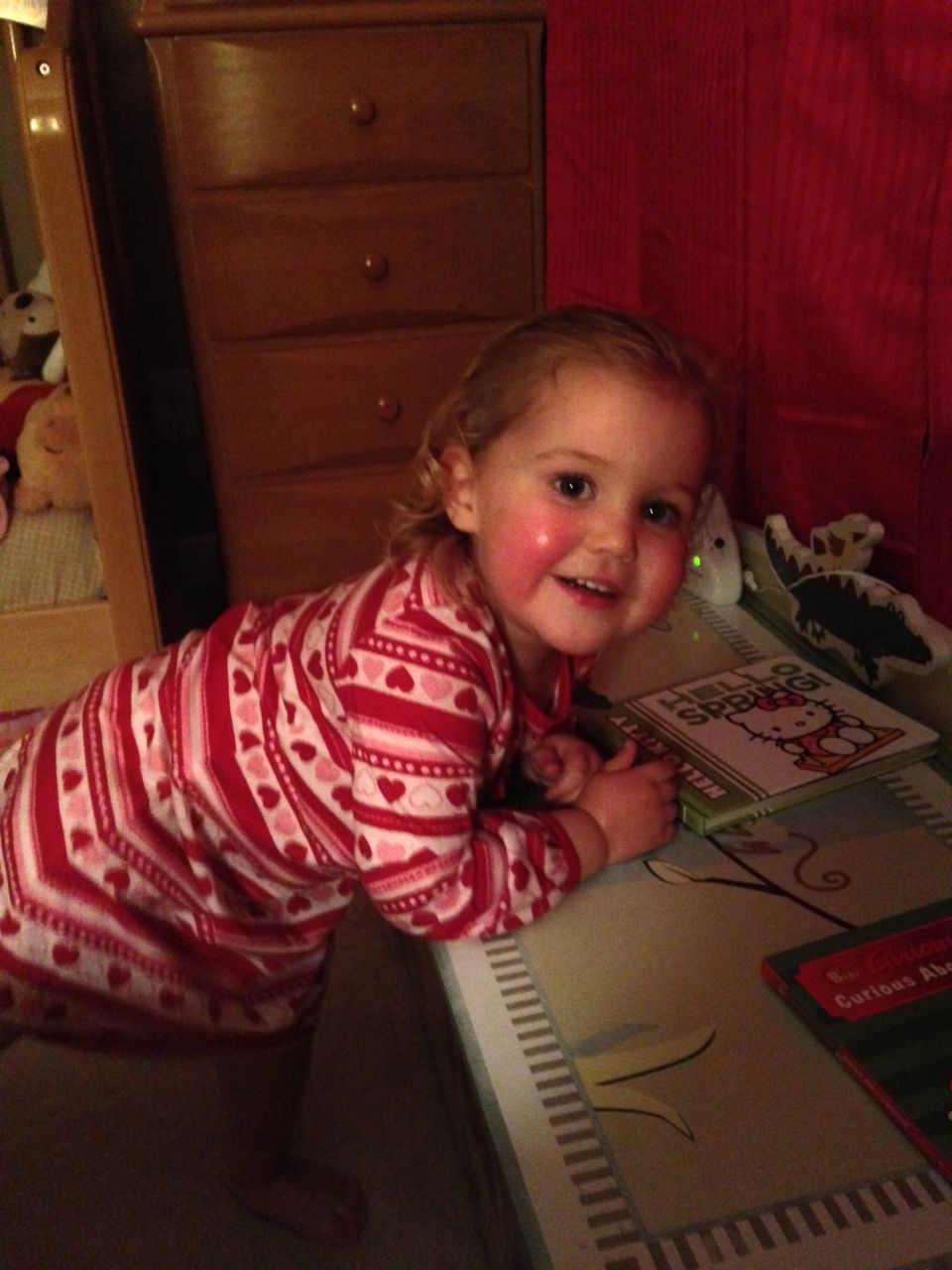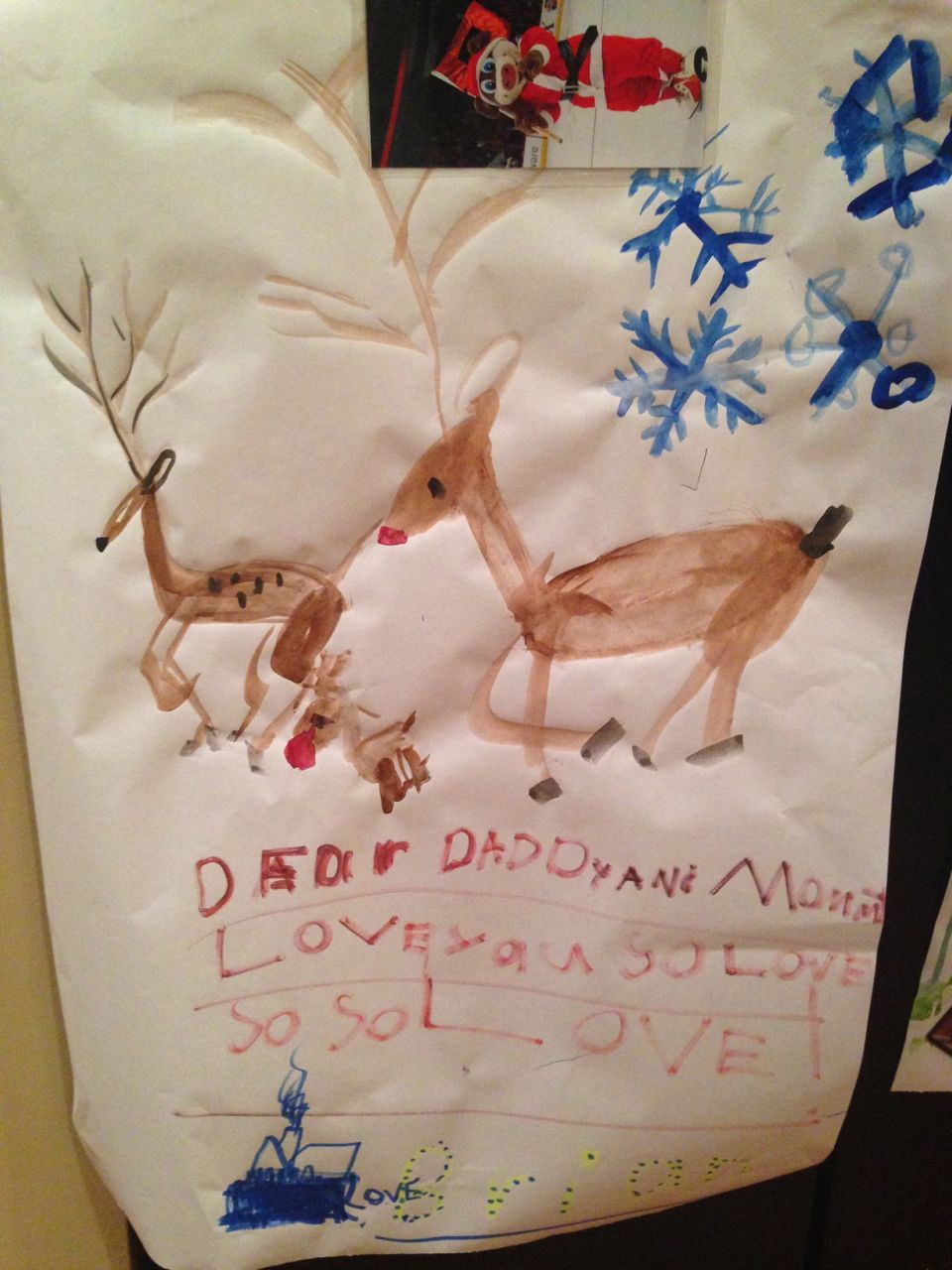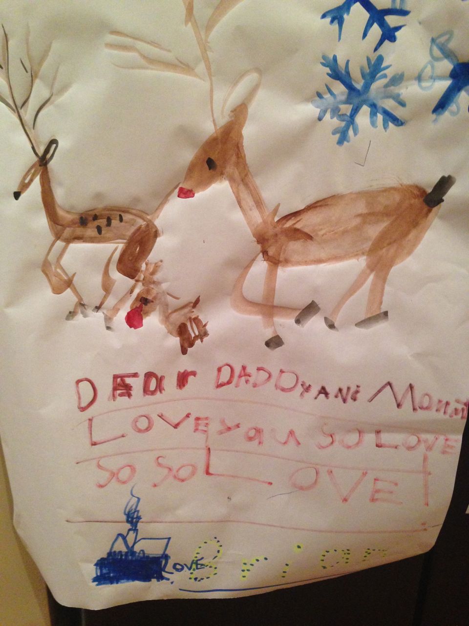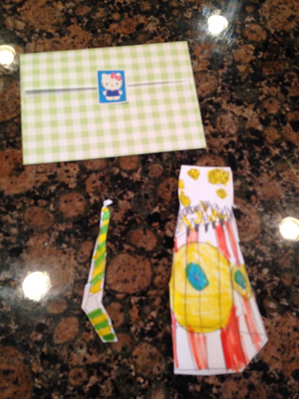 Kendall has a new pink toothbrush, and is very proud of herself for brushing her teeth all by herself with it! I think she’s so cute in her little nightgown. 🙂 Also included, some great paintings that Brian did with Nana (check out the deer antlers and detailed trees and snowflakes!) Brian also made us a present, a paper hockey set and box of popcorn, all wrapped up in an envelope.