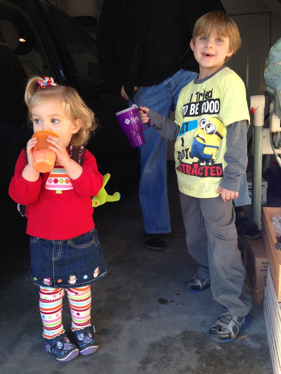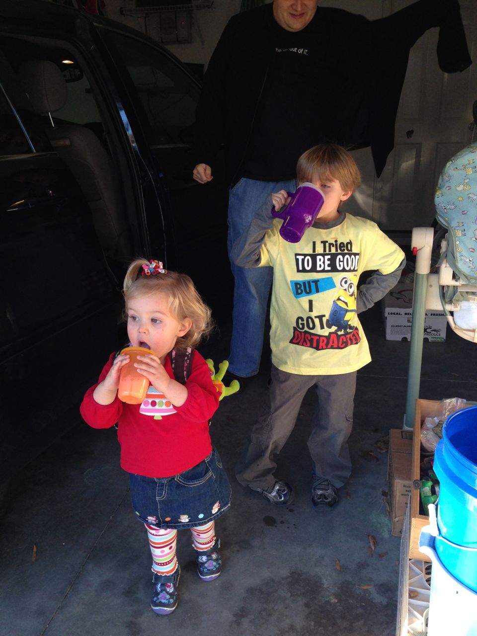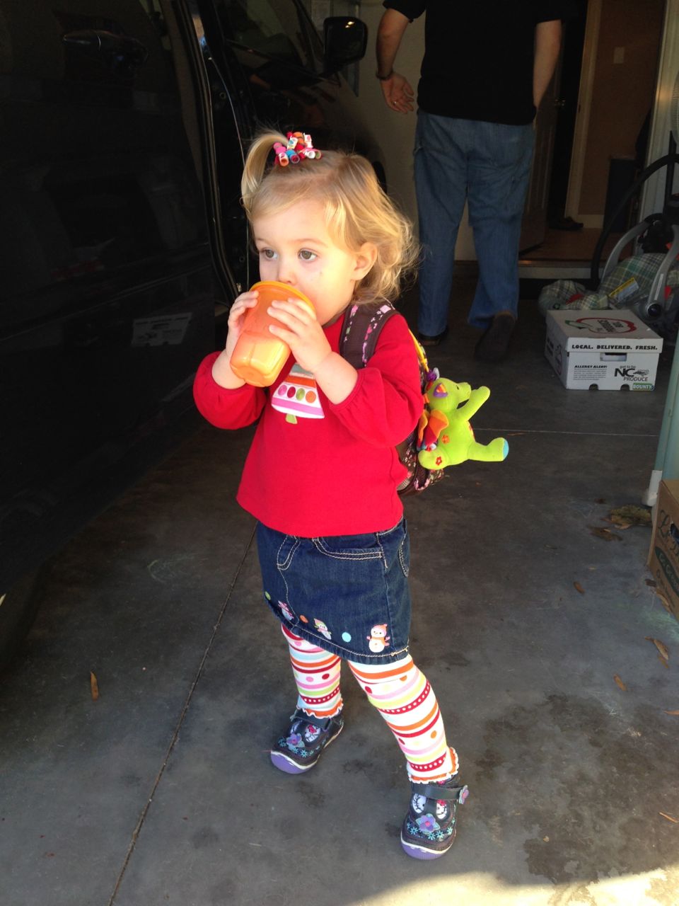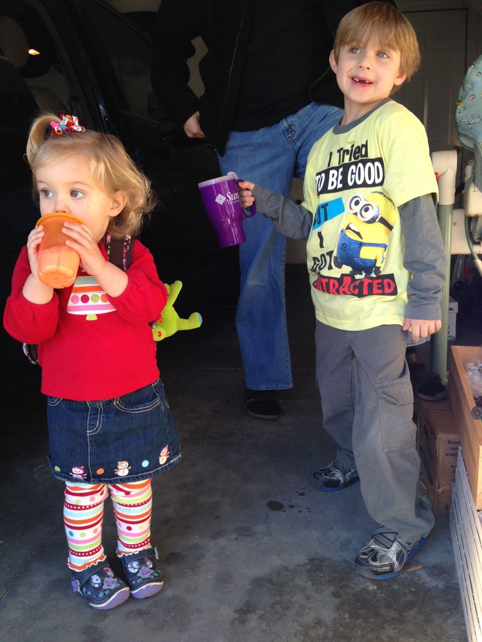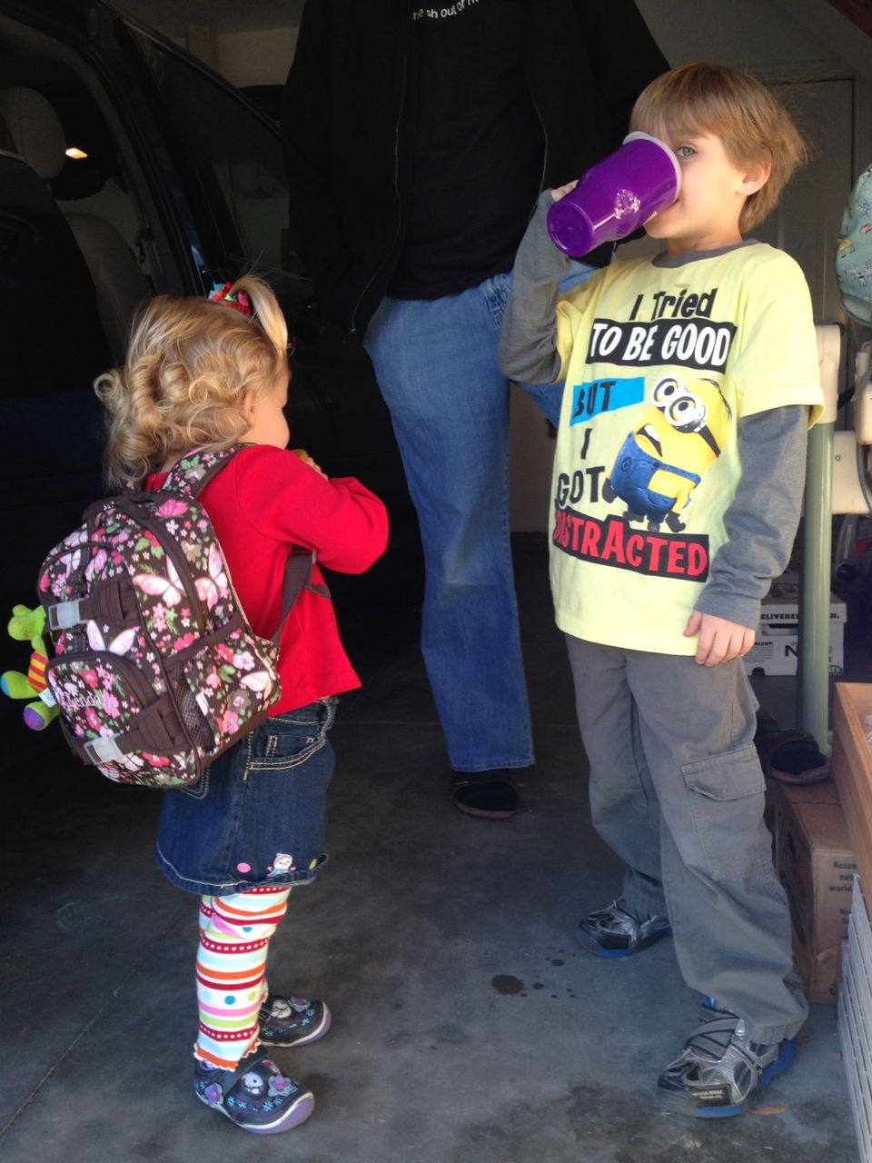 Here’s a few shots of the kids before school today!  I thought Kendall was so cute in her outfit with her little backpack on.  Brian was celebrating a special morning cup of hot cocoa–I guess Brandon caved under the incessant begging! 😉  The boy is all about the peppermint hot cocoa.