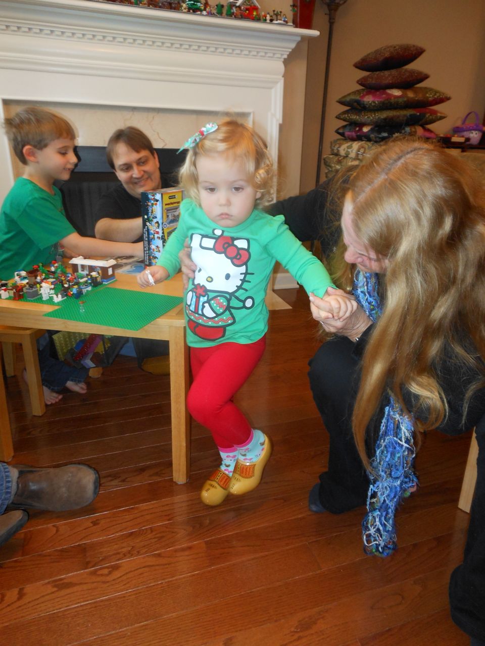 Soon, Nana and Sytse arrived and came bearing an amazing tray of goodies, and a cute little pair of wooden clogs for Kendall. They were a little snug, but we got them on for a little bit (somehow Kendall’s tiny little feet have suddenly jumped almost two sizes–a little irritating for me, since I’d bought her shoes she’ll never wear now!) We managed to keep the kids from tearing into the candy for just a little bit, and they played with the grandparents while I got the food on the table. We had our lunch, of our Christmas ham and lots of vegetables and sides. The kids did well, but I knew what they really wanted (treats, of course!) We took a break from the food, and I got Kendall cleaned up from lunch and put her in one of her many holiday dresses. Then, we let the kids open up their presents from Nana and Sytse. Brian got one of the big items he’d been wanting–a red Plasma Car! Oh, he was so excited, he rode it around the living room in thunderous circles. Of course, this nearly set off World War III with Kendall, who was deeply offended that she didn’t have one of her own! We didn’t think of that.. I suppose another Plasma Car will be be in our future here shortly. Some other highlights include a really cute Boo plush toy (it seems the Boo merchandising empire has expanded from the book that Roger and Cheryl got the kids awhile back!) and one of Brian’s favorite books from visiting the library, “The Marshmallow Incident” (by the same author that wrote “Cloudy with a Chance of Meatballs”). Brian loved that book so much, we renewed it over and over and he just dissolved into giggles at the silly antics of the knights and villagers! Kendall got a nice tea set and a cute Hello Kitty charm–she chews on things a lot less now, but we still might wait just a little bit longer before she can wear it!