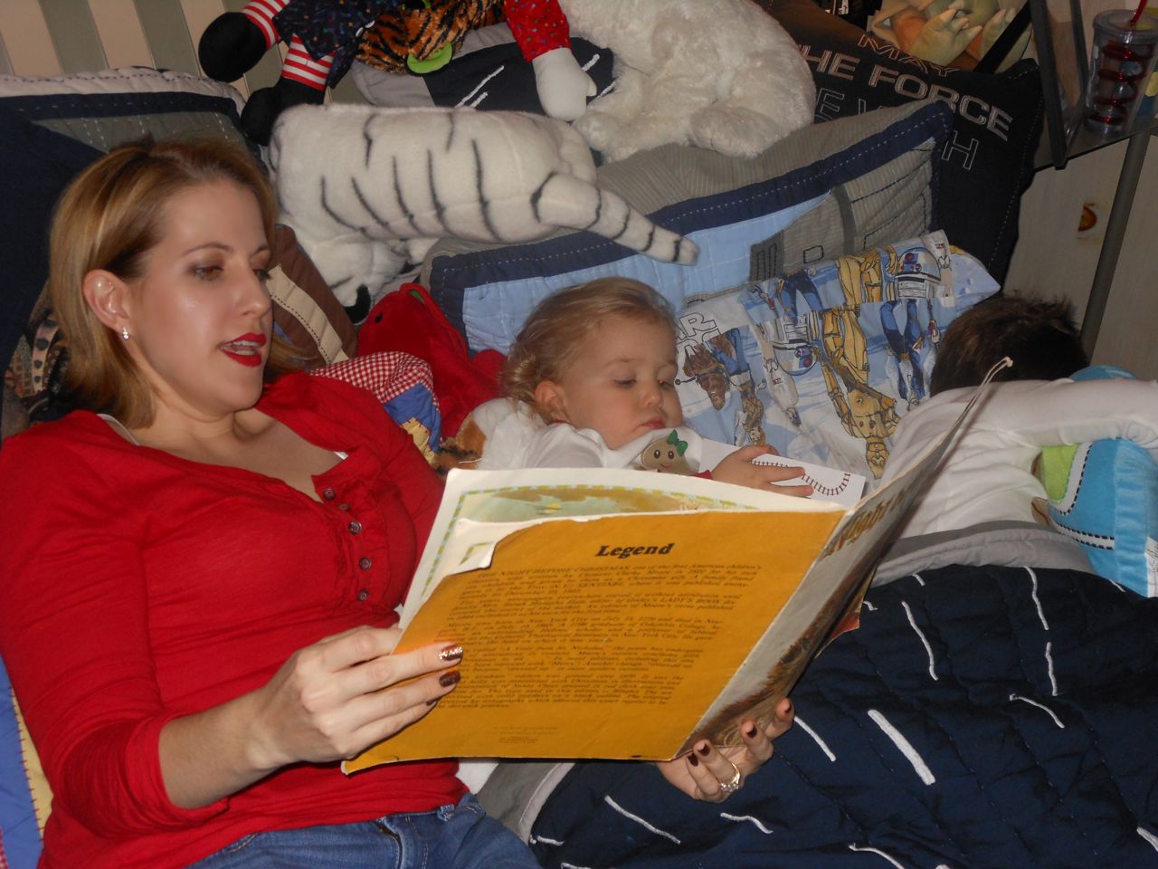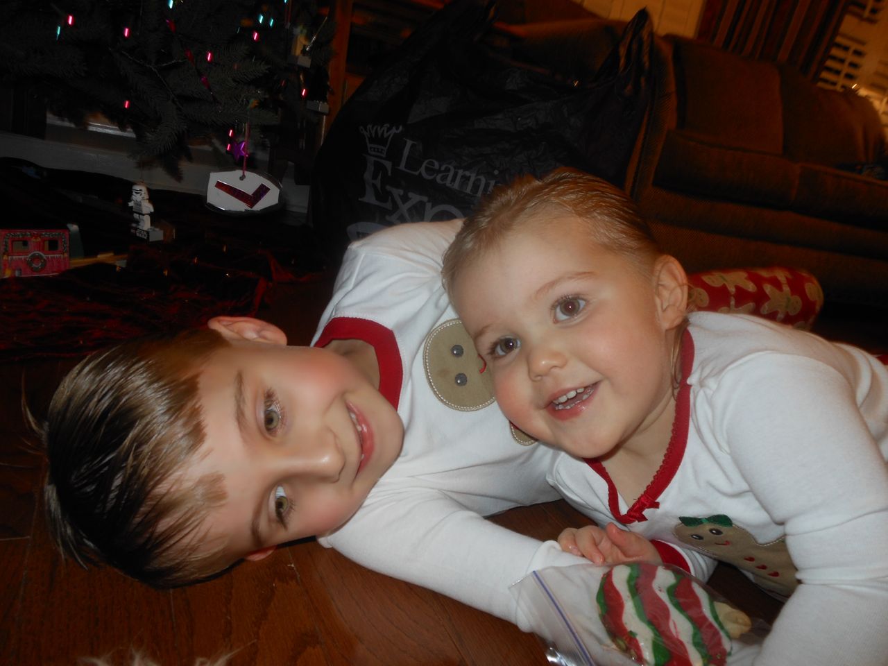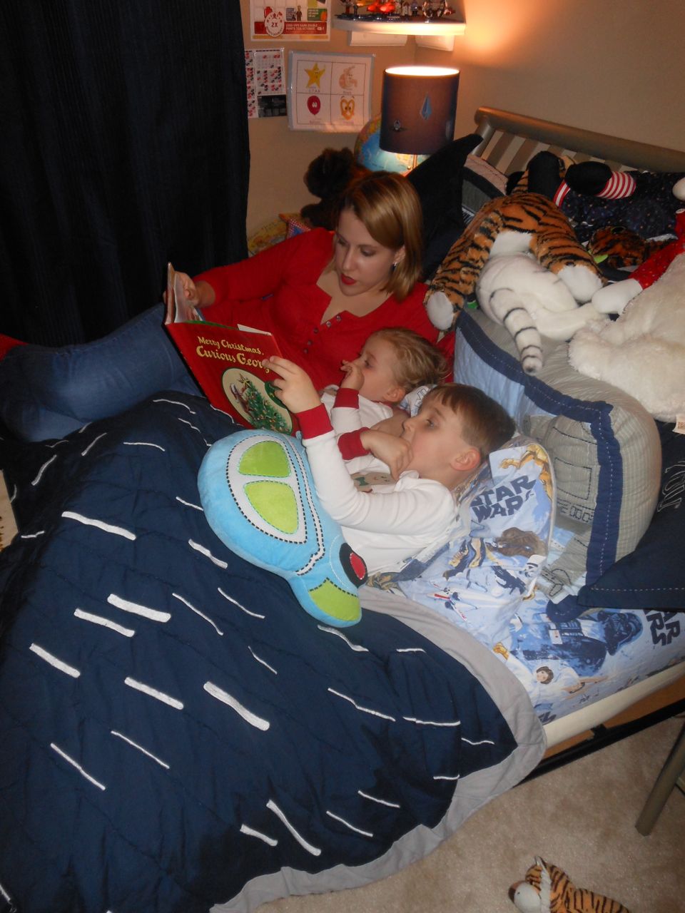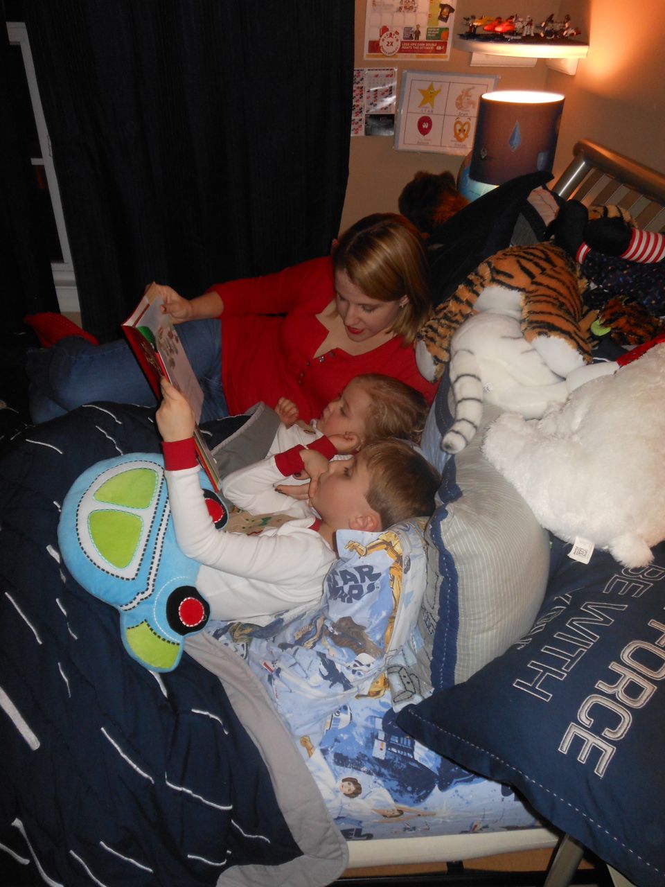 Eventually, even we started questioning our parenting, letting the kids stay up late and have all this sugar..! So we shuffled everyone back upstairs, brushed teeth really well, and then read some of our traditional Christmas Eve books, including the copy of Twas The Night Before Christmas that I read when I was a kid. Kendall was absolutely wild, thanks to the sugar, the excitement, and the lateness of the hour, but still really cute. 😉 It was a challenge, but we finally got the kids settled, and warned them that there is to be absolutely no sneaking downstairs in the morning without us!