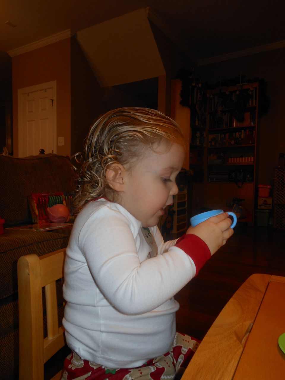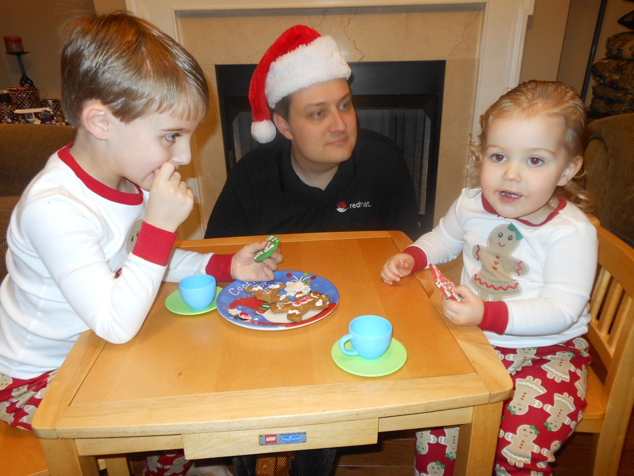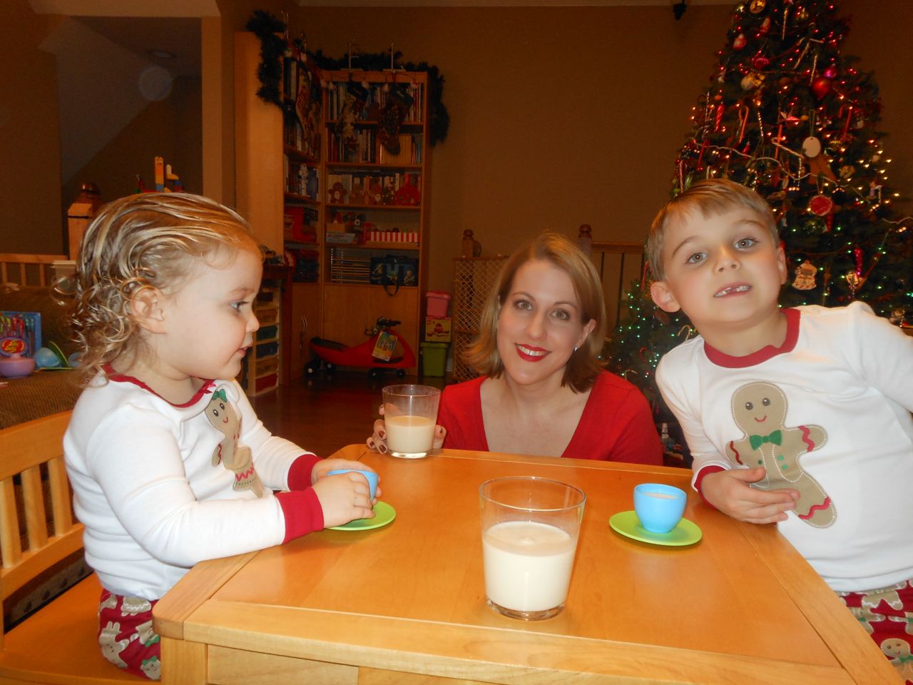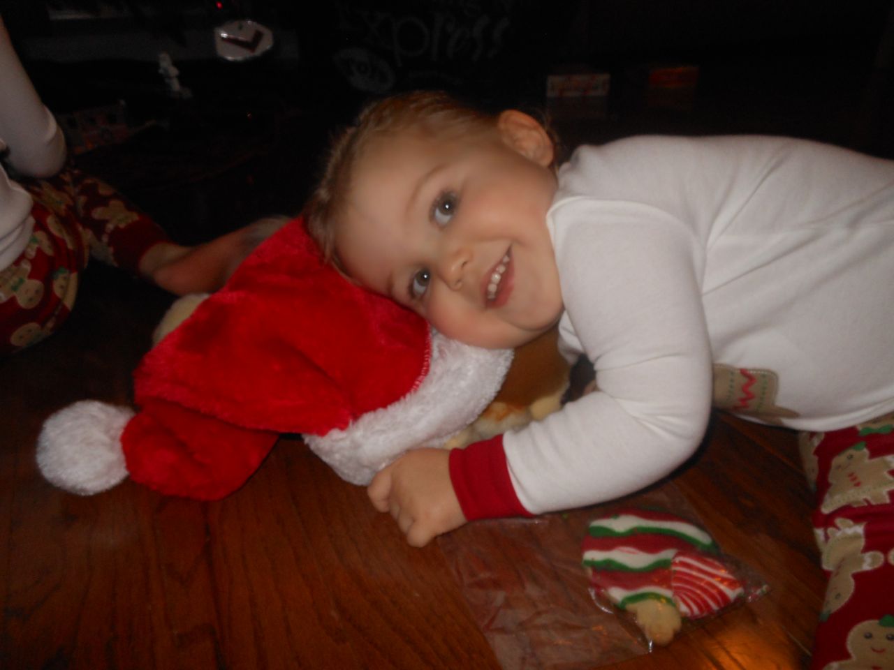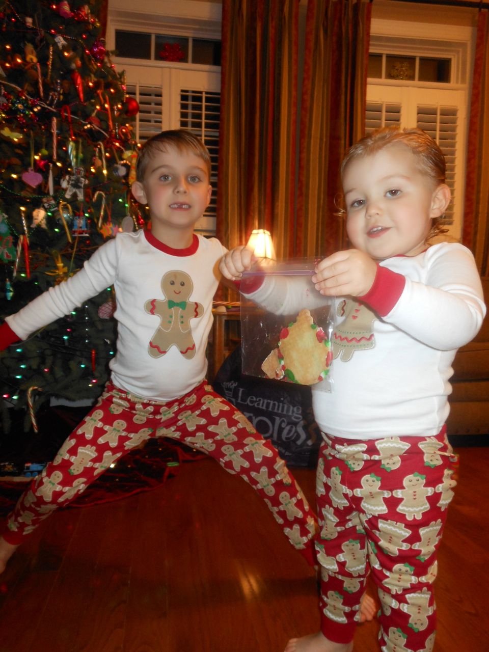 I booked it back home with my prize, and we got the new coffeemaker unpacked and set up. The kids liked the box (no surprise there!) We had some ham sandwiches for dinner with the Christmas ham and yeast rolls left over from our lunch. Kendall really liked the cornbread this evening! We got through bathtime as quickly as we could, and put the kids in their new gingerbread boy and girl pajamas. I prevailed upon them to let me take some photos in their cute PJs in front of the tree, offering up the bribe of an extra treat before they really had to go to bed. They hammed it up with Boo and their Santa hats, and I just tried to get them to look my way now and again. 😉 We let them have a little bit of egg nog and some gingerbread cookies and white chocolate angels. We used Kendall’s tea set for the kids to have their treat. Kendall really liked the nog, and kept slamming her cup down asking for more! But Brian was less enthused. He was more into his cookies and treats.