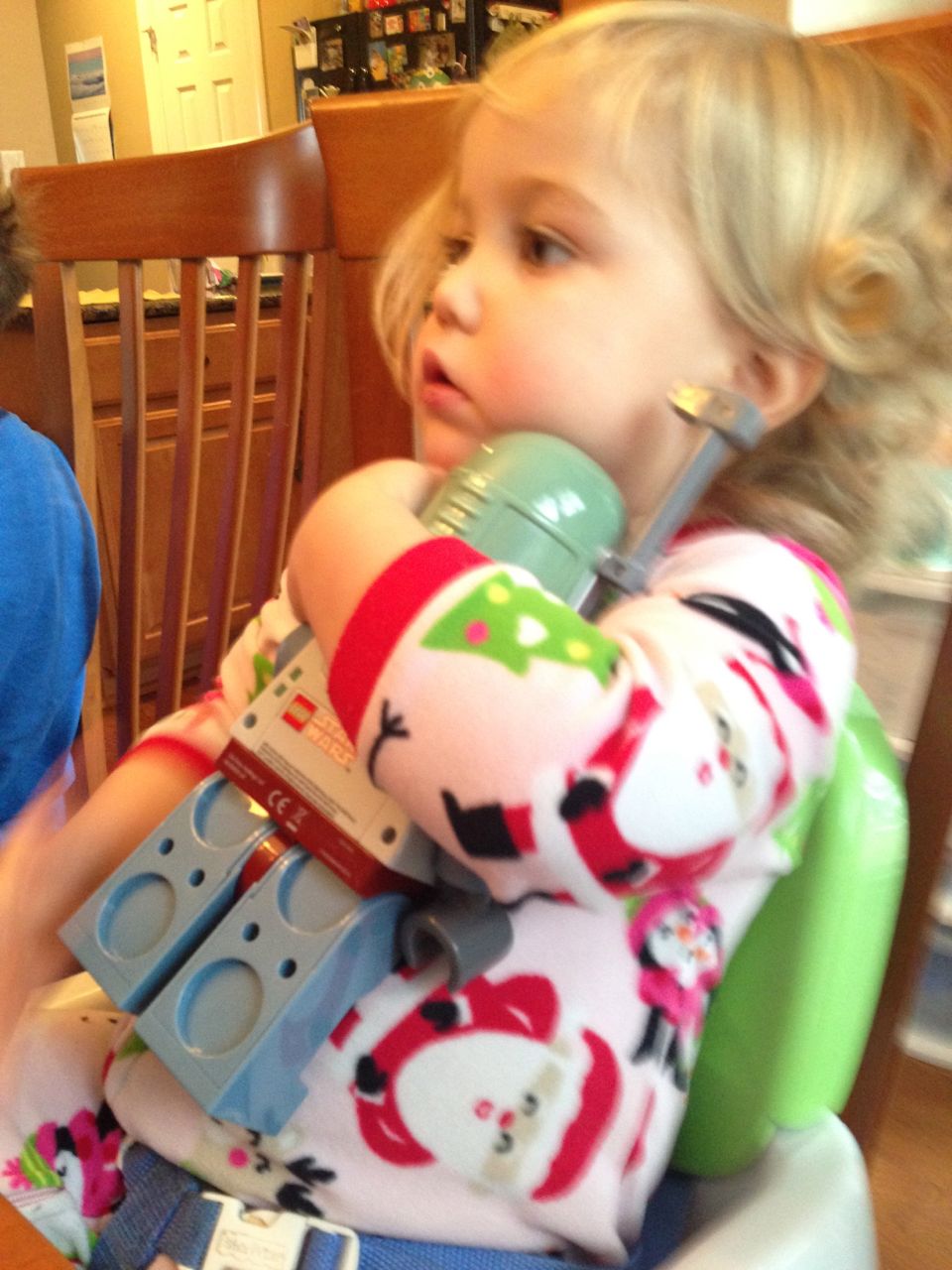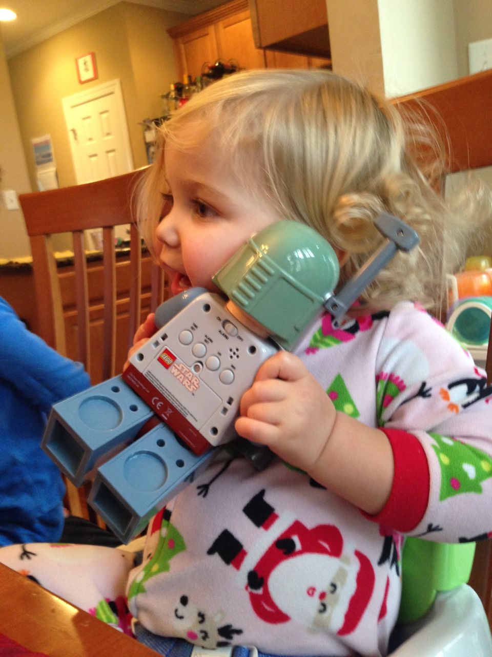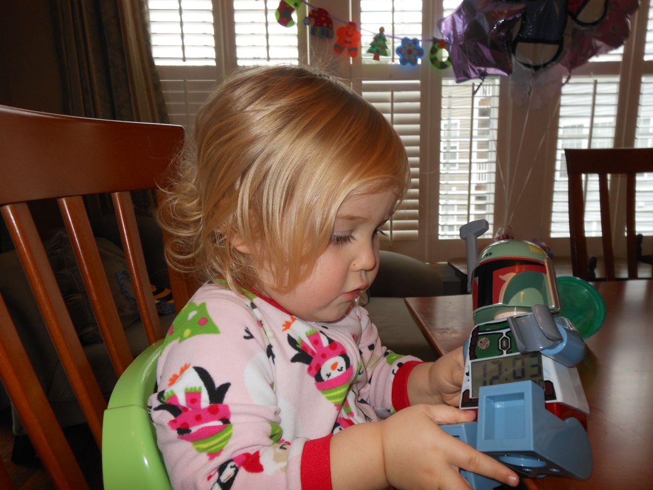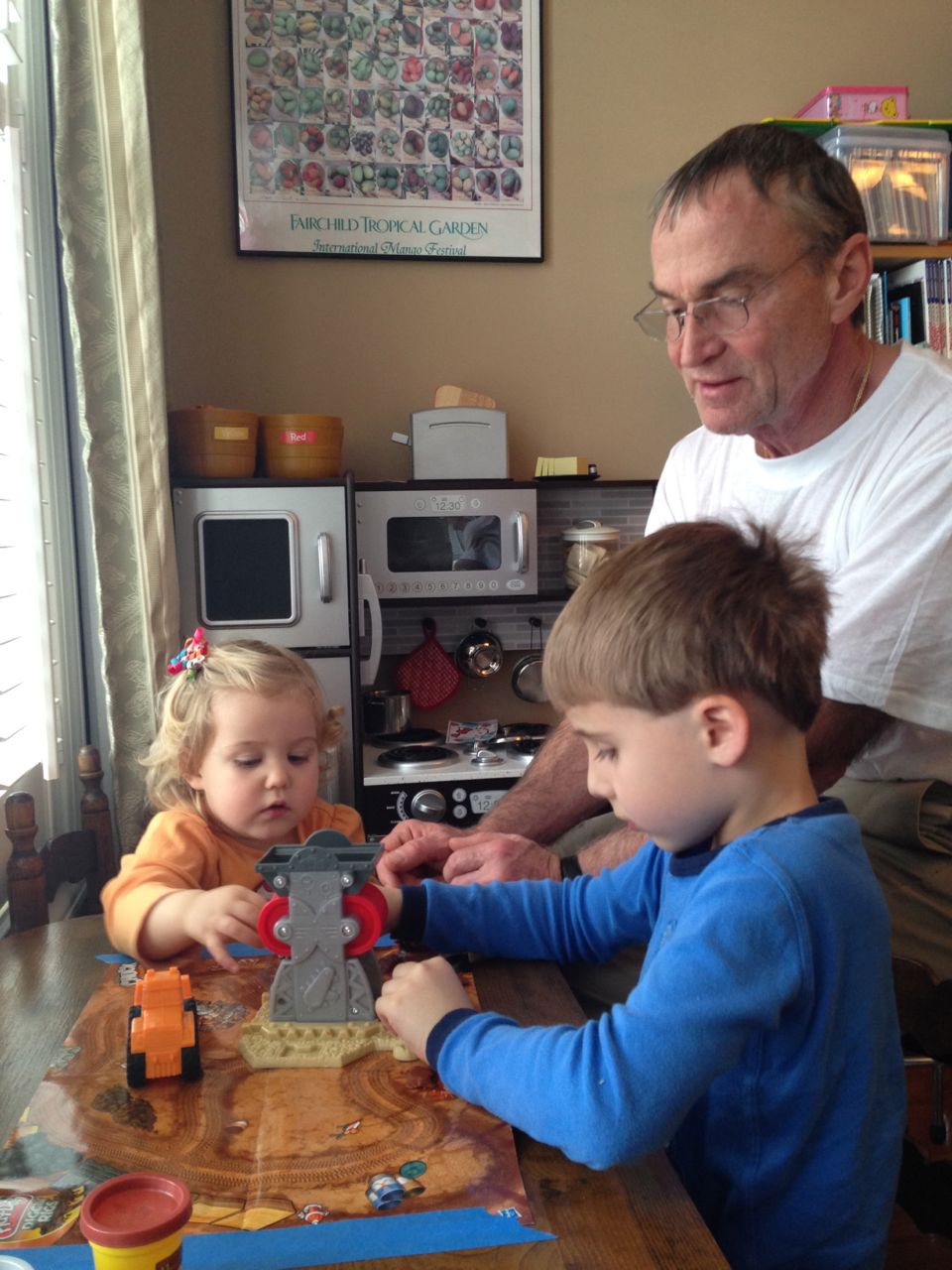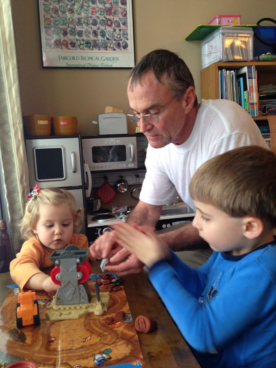 Grandpa Roger arrived late last night, after the kids were already in bed, so the kids were excited to wake up this morning to see him! We all made good use of the new coffeemaker, with Brandon telling Roger our tale of woe about the old one. Roger volunteered to take a look at the old one, and within minutes, had it going again! Turns out, it just needed a bit of descaling. Cool! Now we can use the little one when we travel, like we did originally. The kids had a great time showing Roger all of their presents, and as it turned out, they had a few more to open! Yes, they didn’t even finish opening everything on Christmas day. Brian got his set of hockey guys and quickly set up a game. Kendall got the Boba Fett Lego alarm clock that Brian had insisted that we get her–at the time we chuckled and nearly didn’t go for it, but he really knows his sister! Kendall just adored it, she hugged him and talked about him and generally wouldn’t put him down. She loves this alarm clock better than any baby doll I’ve ever seen her with (note to self: I should probably get her a baby doll that isn’t a baby toy at some point here!) Brian also got a UPS playset, since he loves the UPS trucks and airplanes so much. We opened up Brian’s Play-Doh contruction site from Steve and Sue, and the kids both played with it (and Grandpa, too!) Brian made us a present, our very own Jedi starfighter with our initials on it. He wrapped it up and everything. 😉