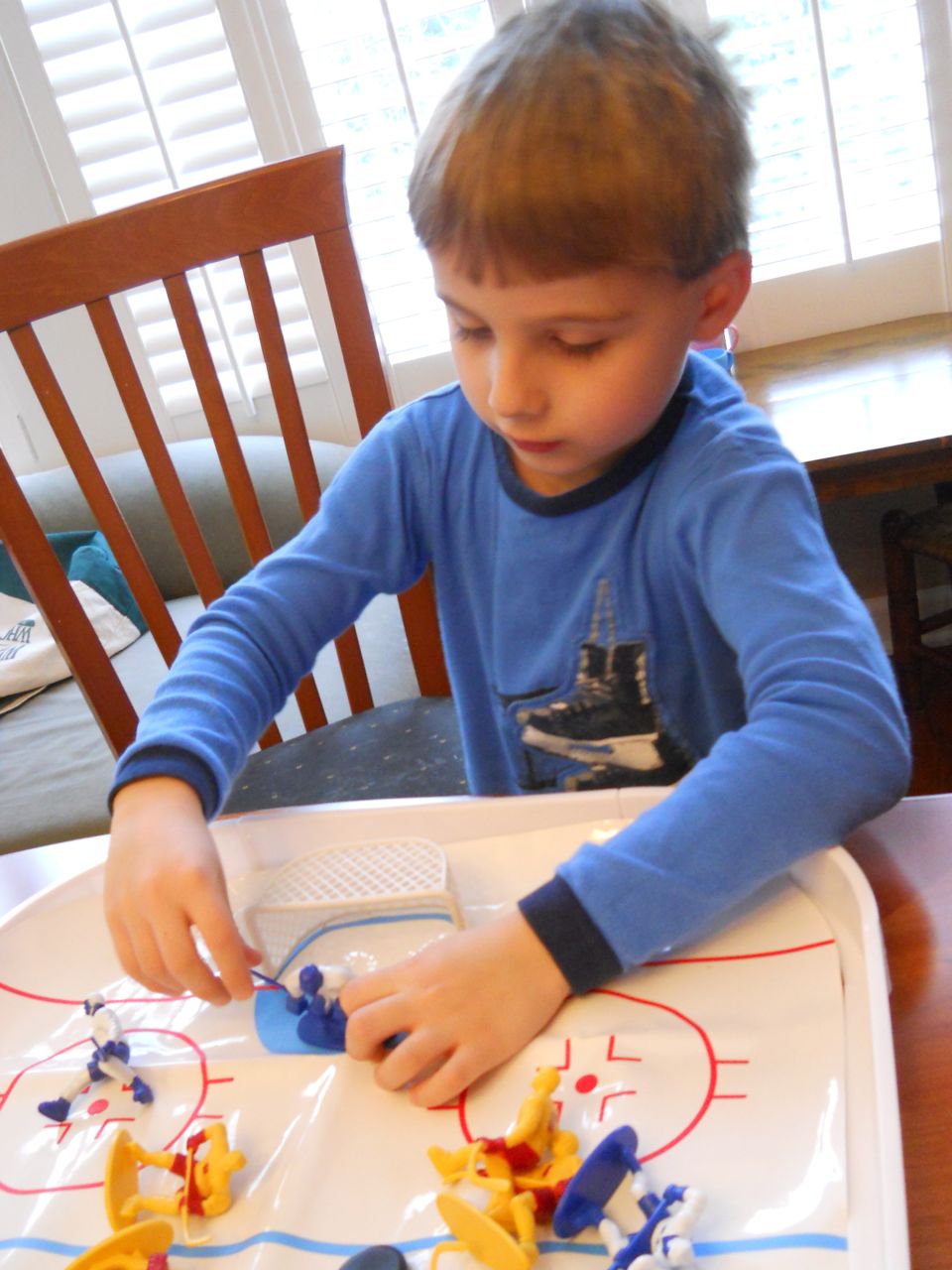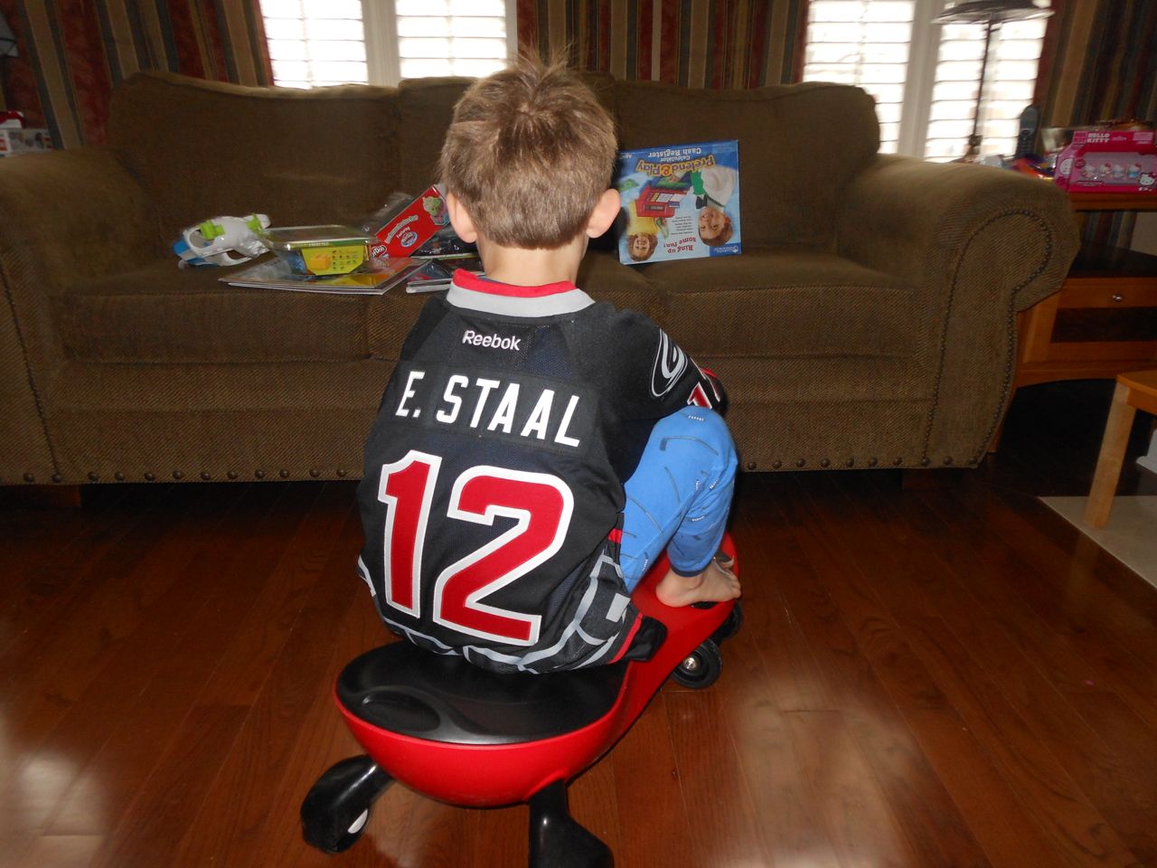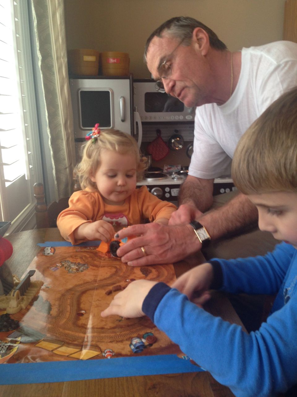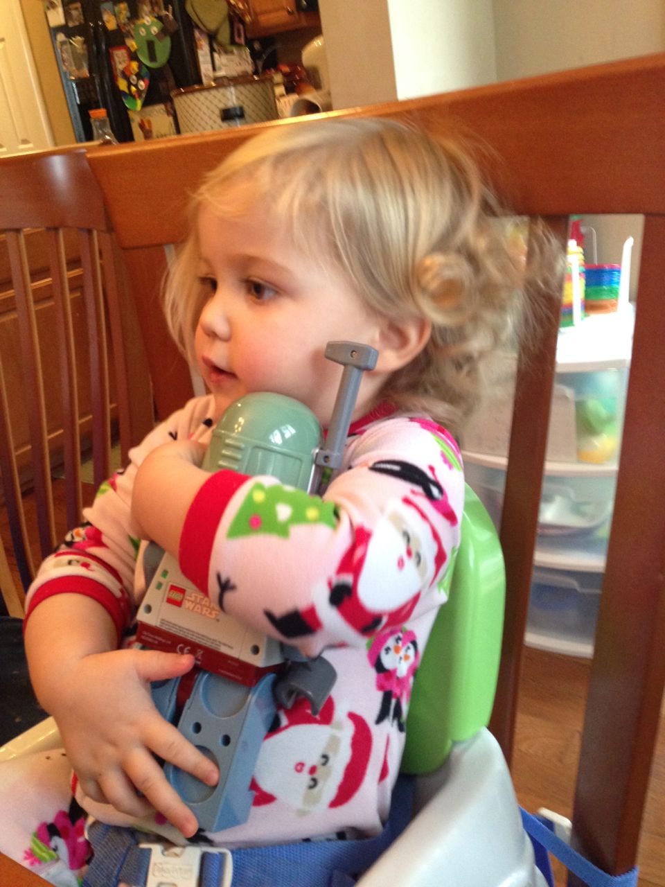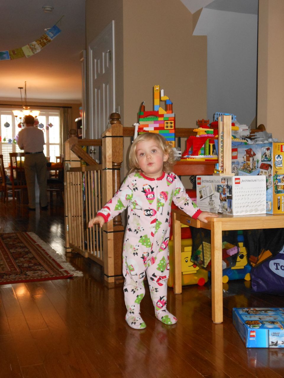 Grandpa Roger arrived late last night, after the kids were already in bed, so the kids were excited to wake up this morning to see him! We all made good use of the new coffeemaker, with Brandon telling Roger our tale of woe about the old one. Roger volunteered to take a look at the old one, and within minutes, had it going again! Turns out, it just needed a bit of descaling. Cool! Now we can use the little one when we travel, like we did originally. The kids had a great time showing Roger all of their presents, and as it turned out, they had a few more to open! Yes, they didn’t even finish opening everything on Christmas day. Brian got his set of hockey guys and quickly set up a game. Kendall got the Boba Fett Lego alarm clock that Brian had insisted that we get her–at the time we chuckled and nearly didn’t go for it, but he really knows his sister! Kendall just adored it, she hugged him and talked about him and generally wouldn’t put him down. She loves this alarm clock better than any baby doll I’ve ever seen her with (note to self: I should probably get her a baby doll that isn’t a baby toy at some point here!) Brian also got a UPS playset, since he loves the UPS trucks and airplanes so much. We opened up Brian’s Play-Doh contruction site from Steve and Sue, and the kids both played with it (and Grandpa, too!) Brian made us a present, our very own Jedi starfighter with our initials on it. He wrapped it up and everything. 😉