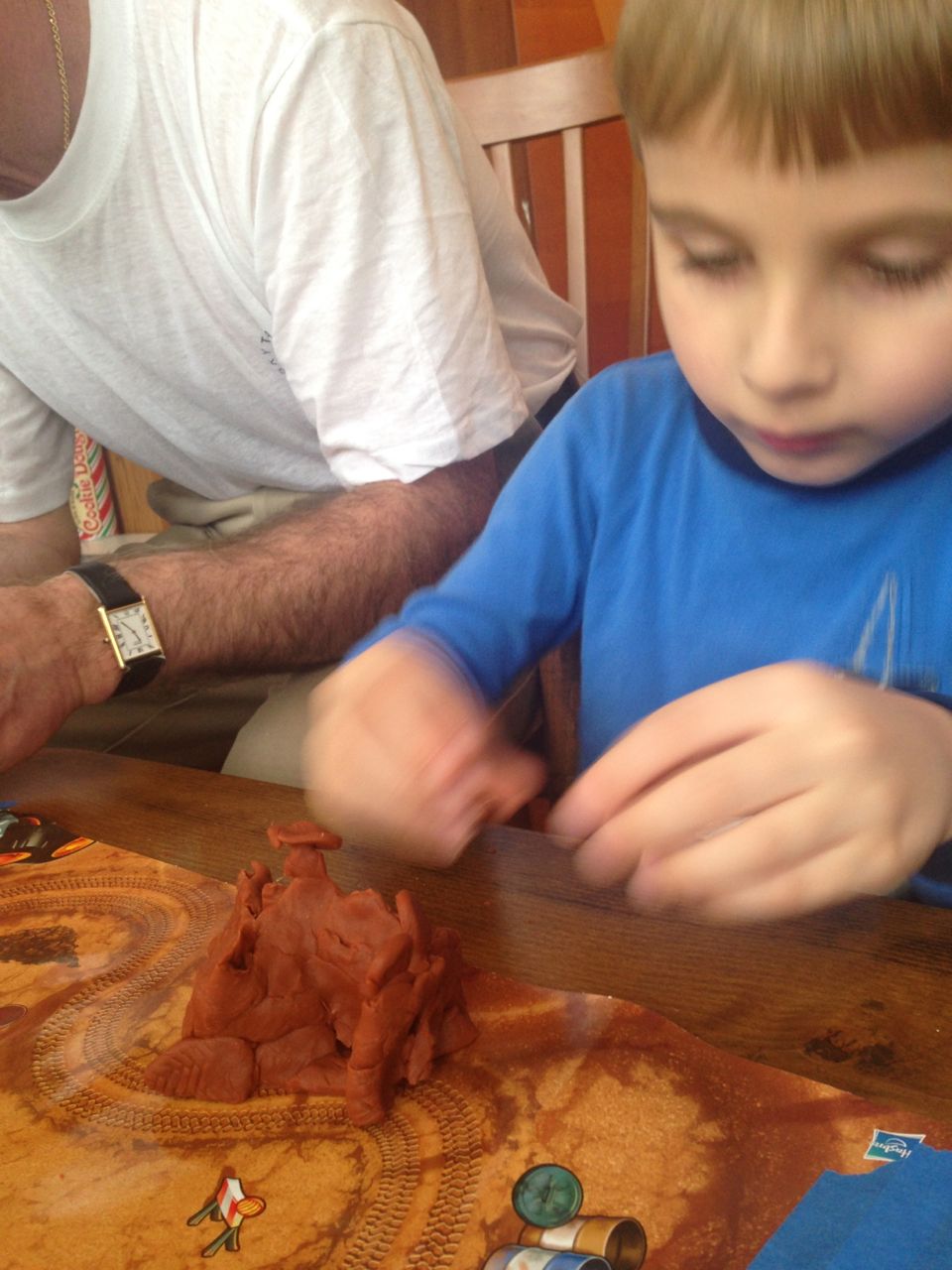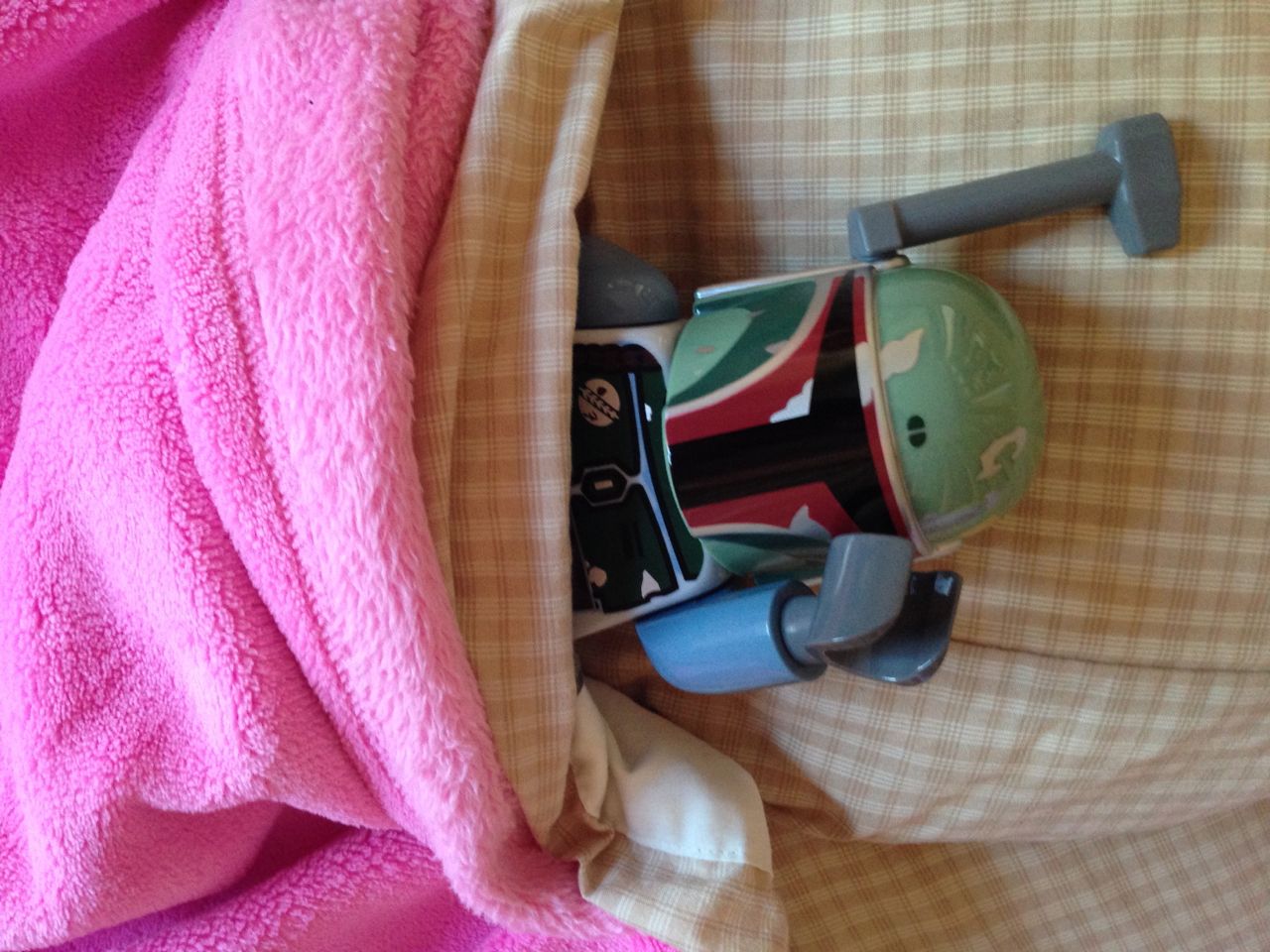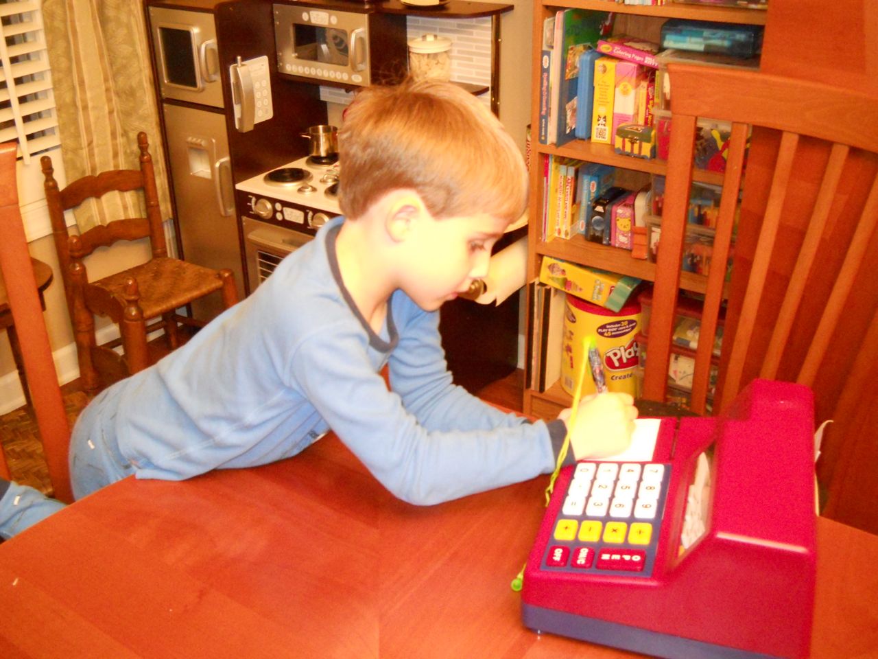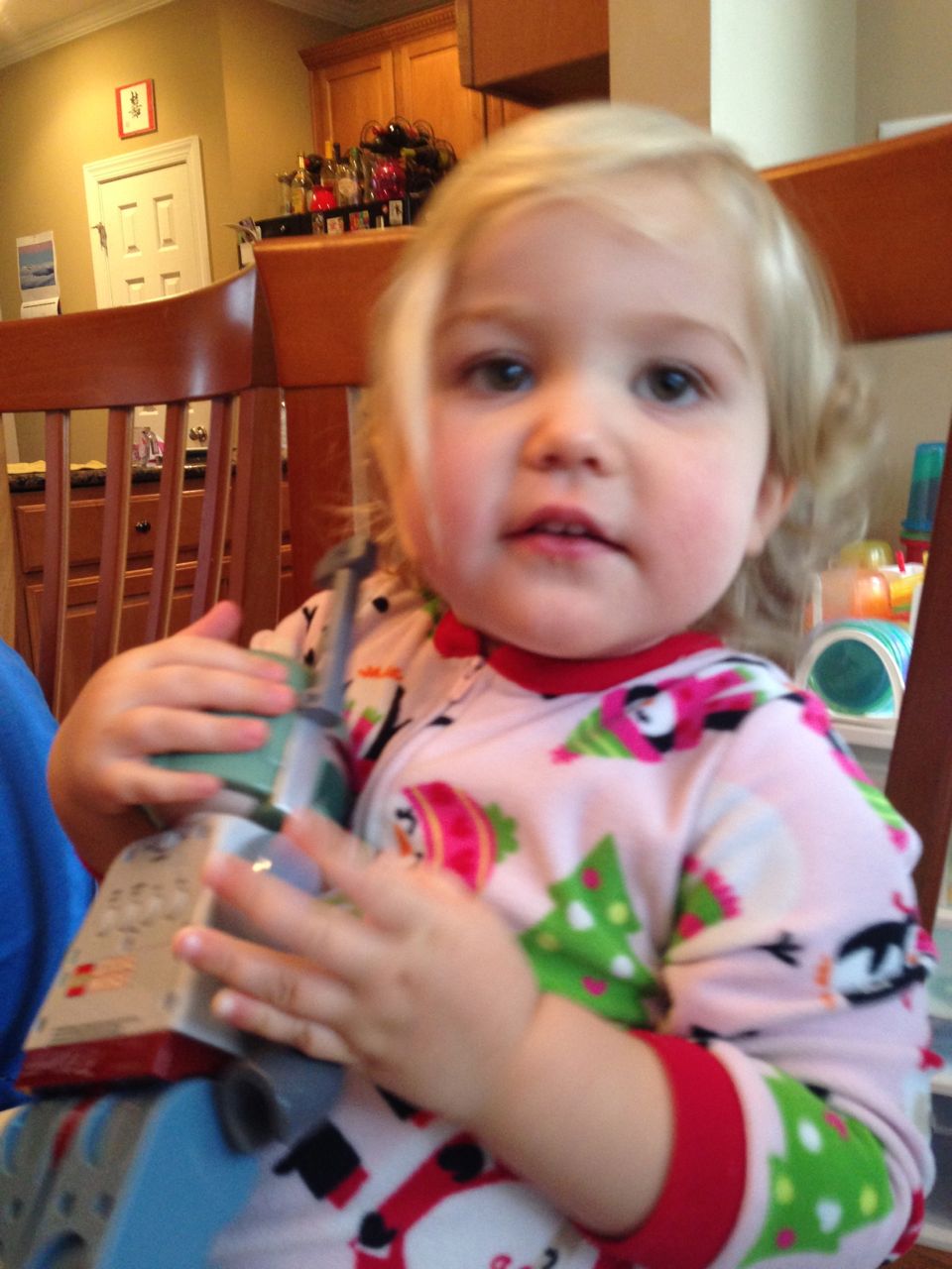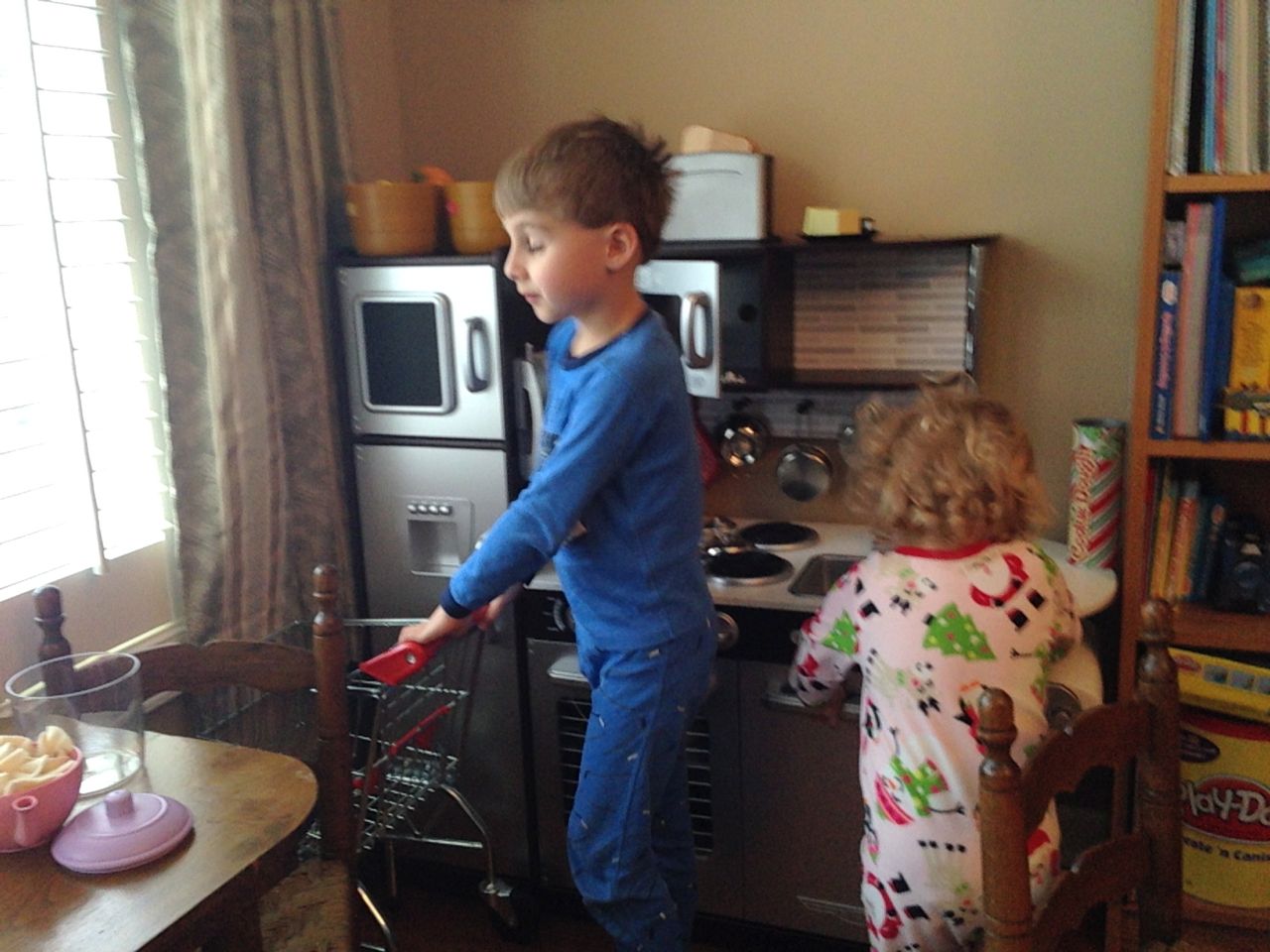 Grandpa Roger arrived late last night, after the kids were already in bed, so the kids were excited to wake up this morning to see him! We all made good use of the new coffeemaker, with Brandon telling Roger our tale of woe about the old one. Roger volunteered to take a look at the old one, and within minutes, had it going again! Turns out, it just needed a bit of descaling. Cool! Now we can use the little one when we travel, like we did originally. The kids had a great time showing Roger all of their presents, and as it turned out, they had a few more to open! Yes, they didn’t even finish opening everything on Christmas day. Brian got his set of hockey guys and quickly set up a game. Kendall got the Boba Fett Lego alarm clock that Brian had insisted that we get her–at the time we chuckled and nearly didn’t go for it, but he really knows his sister! Kendall just adored it, she hugged him and talked about him and generally wouldn’t put him down. She loves this alarm clock better than any baby doll I’ve ever seen her with (note to self: I should probably get her a baby doll that isn’t a baby toy at some point here!) Brian also got a UPS playset, since he loves the UPS trucks and airplanes so much. We opened up Brian’s Play-Doh contruction site from Steve and Sue, and the kids both played with it (and Grandpa, too!) Brian made us a present, our very own Jedi starfighter with our initials on it. He wrapped it up and everything. 😉