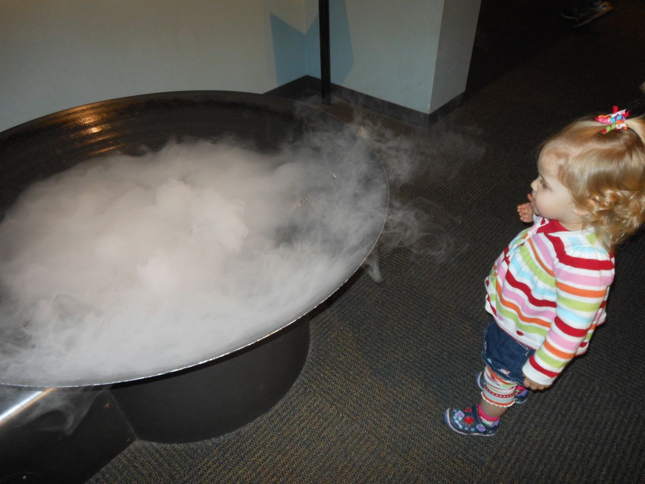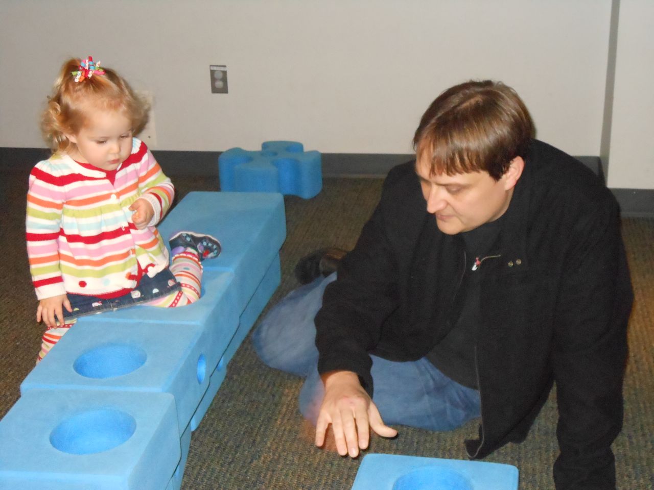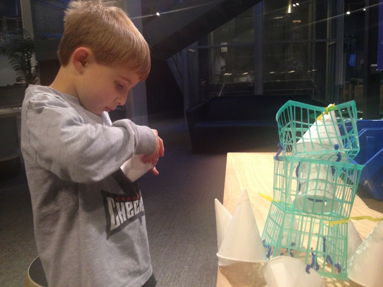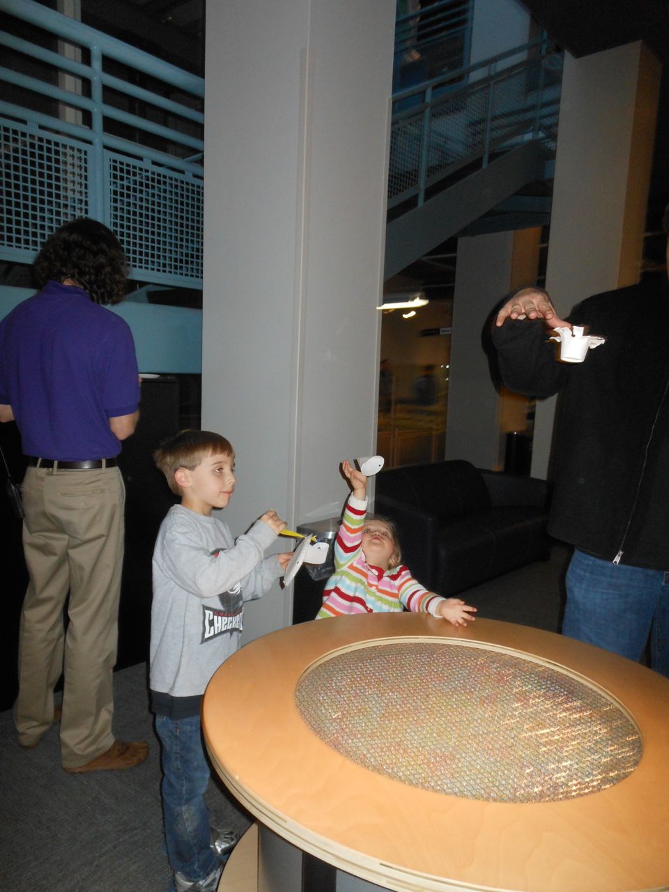 We felt like getting out today, so packed everyone up and headed to Durham’s Life+Science Museum. Kendall and Brian used the new Hello Kitty carseat blankets I made last night! The kids are pretty familiar with the museum at this point, and they had a great time showing Grandpa all of their favorite exhibits. The museum changes things up pretty regularly, so there were some new surprises in addition to some favorites. Brian still loves the boats, and Kendall still loves the mist/cloud maker and other weather-related exhibits. We visited the dinosaurs outside, even though it was chilly. The kids enjoyed building with the giant foam blocks, and Brian had a great time constructing a spaceship to test out at the wind column. We got lunch at the cafe (along with every other museum patron, it seemed!) and it was tasty, even if it took awhile. 😉 We stayed for a really long time, but eventually had to head home for Kendall’s nap. This evening, the boys went out to the hockey game, and I stayed home and played with Kendall. She had a great time cooking and shopping with the new play kitchen. She insisted on cuddling with Boba Fett at bedtime! He doesn’t look all that cuddly to me, but she just has to have him! Maybe I’ll see if there’s a softer version out there. 🙂