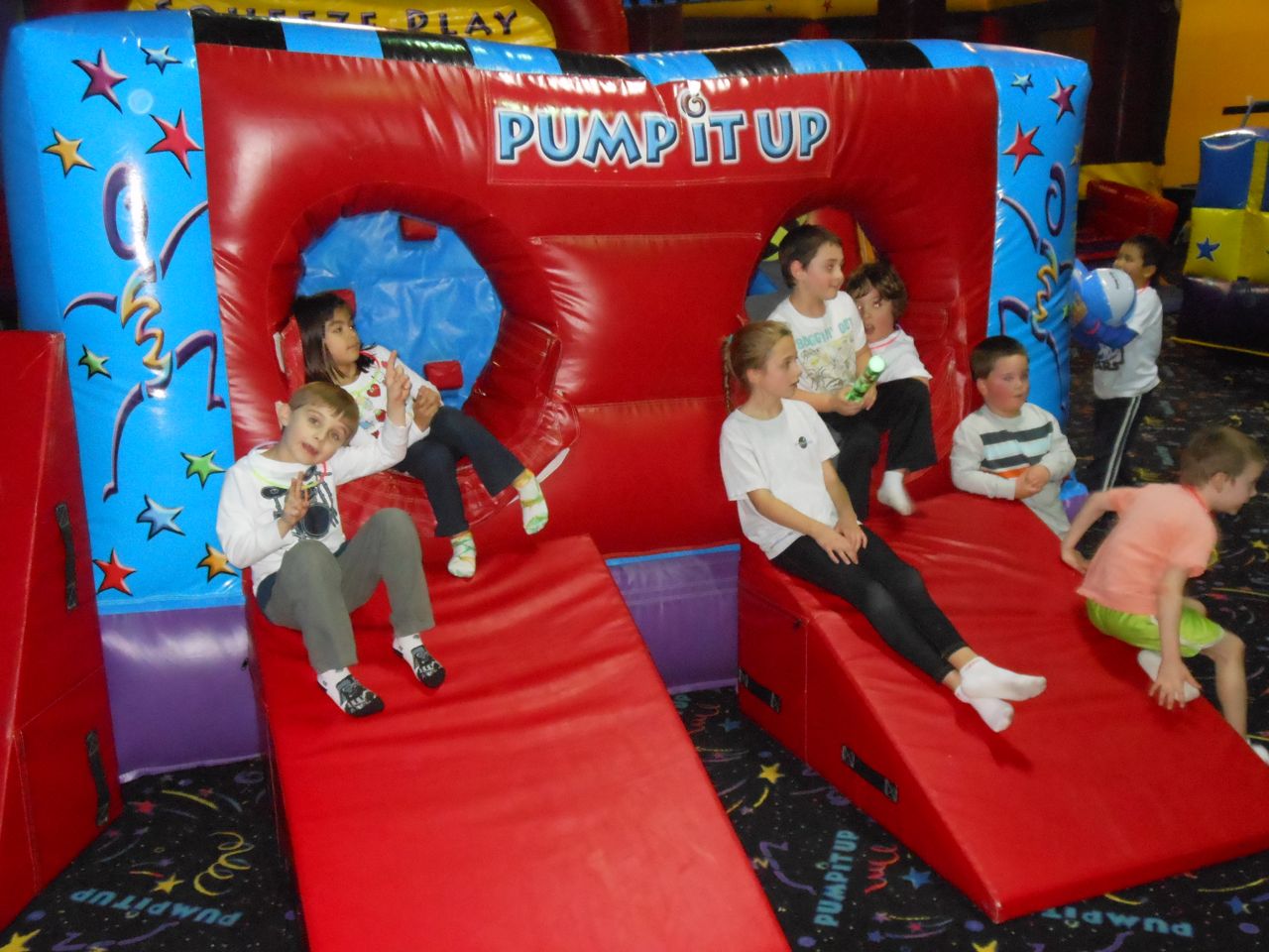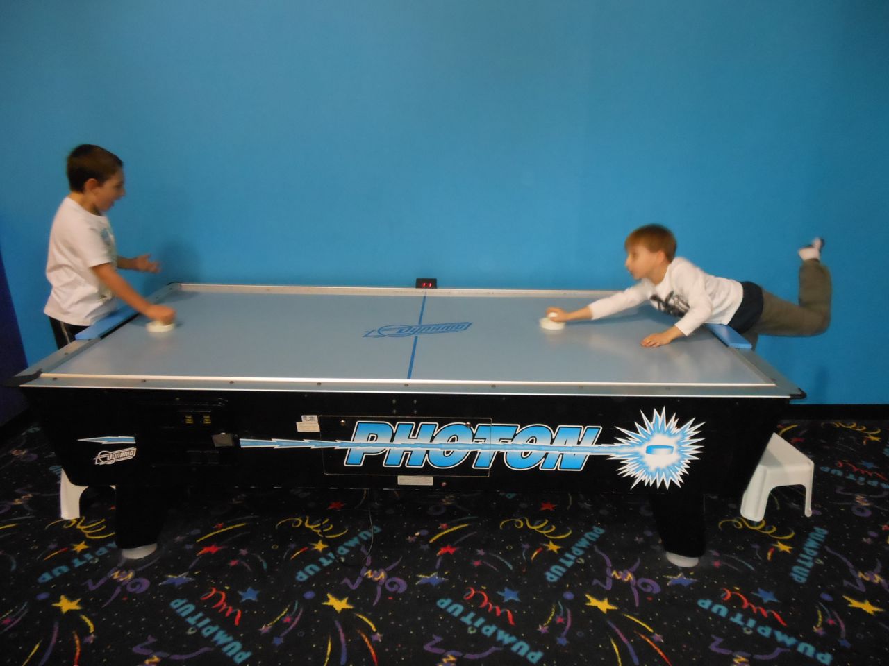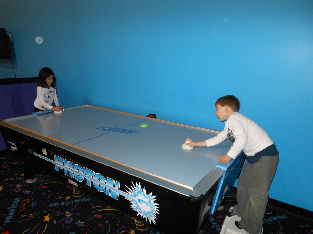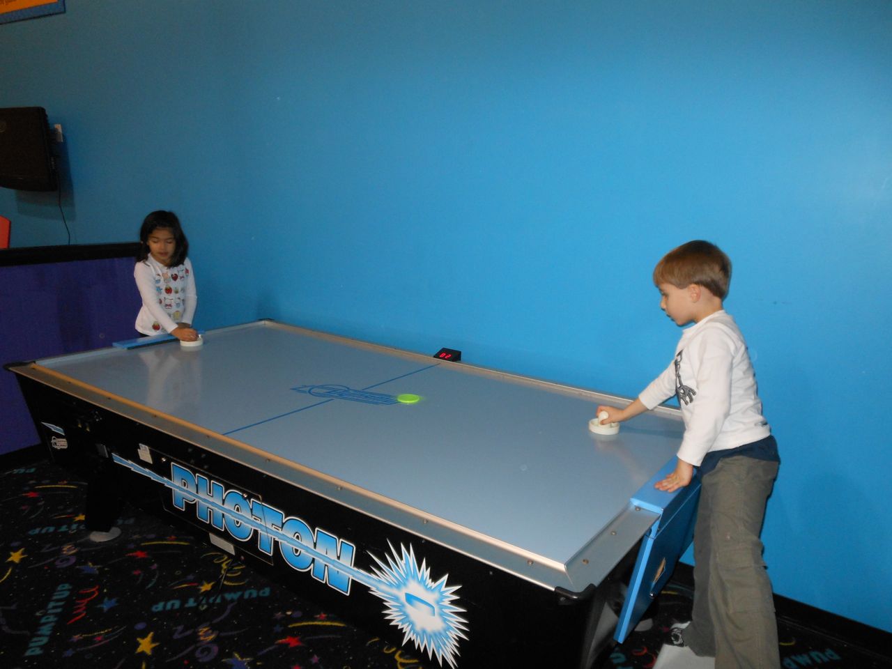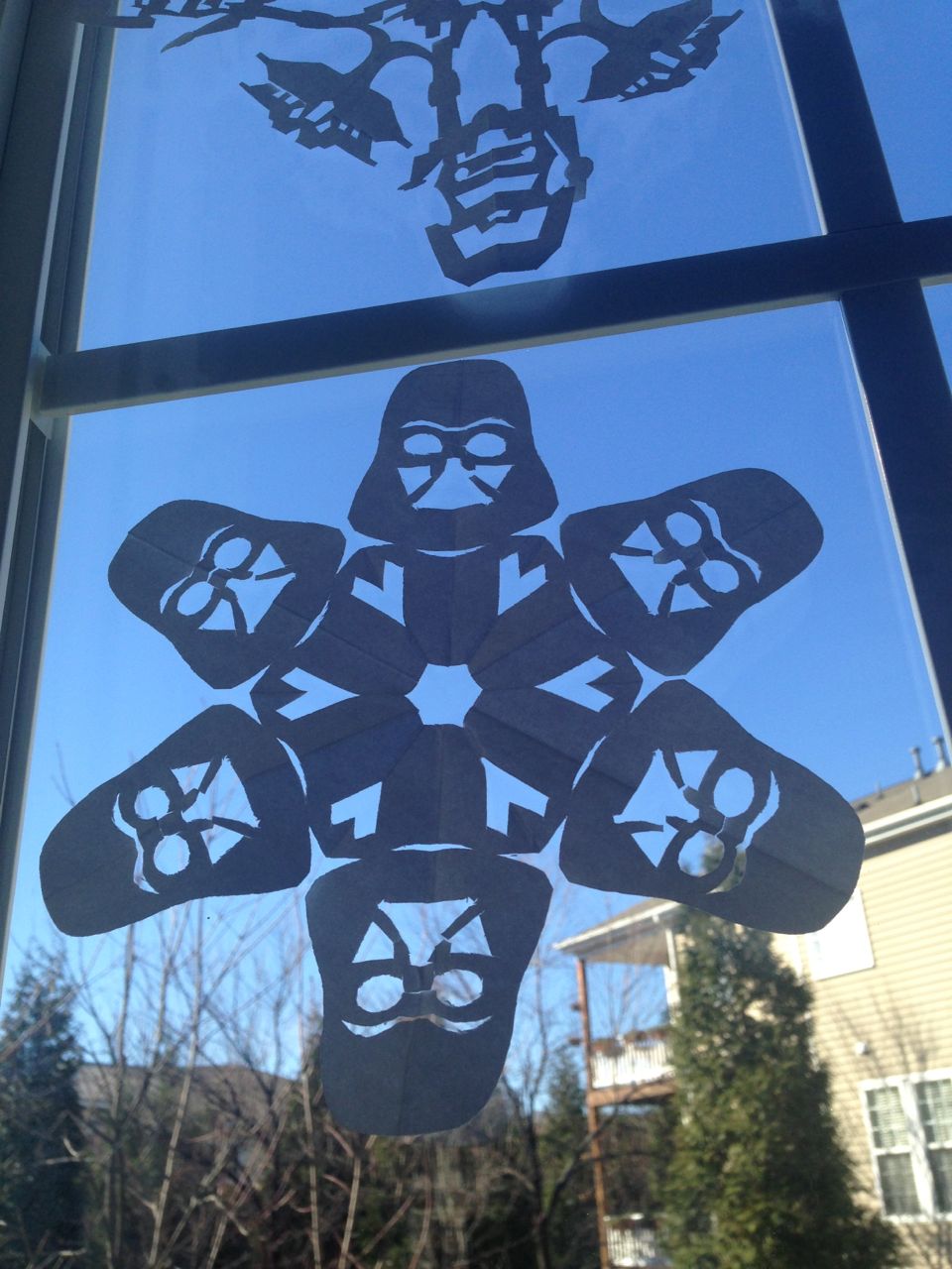 Today was Drew’s birthday party, at Pump It Up again, and Brian once again ruled the air hockey table! He enjoyed bouncing and seeing some of his Goddard school friends. I stayed home with Kendall and had fun playing with Boo, the toy food, the shopping cart, and the play kitchen. Kendall talked on the phone a lot, and was a very busy little lady, shopping, cooking, giving Boo a lot of rides in the cart. 🙂 I was busy this morning, trying my hand at making some Star Wars snowflakes. I found the templates online, and just had to try it! They turned out pretty well, I think–I just really need to get some better, sharper scissors before making any more! My hands were sore for hours afterward. Brian also did some paper art, he made this cool paper alligator–he was very proud of it. 🙂