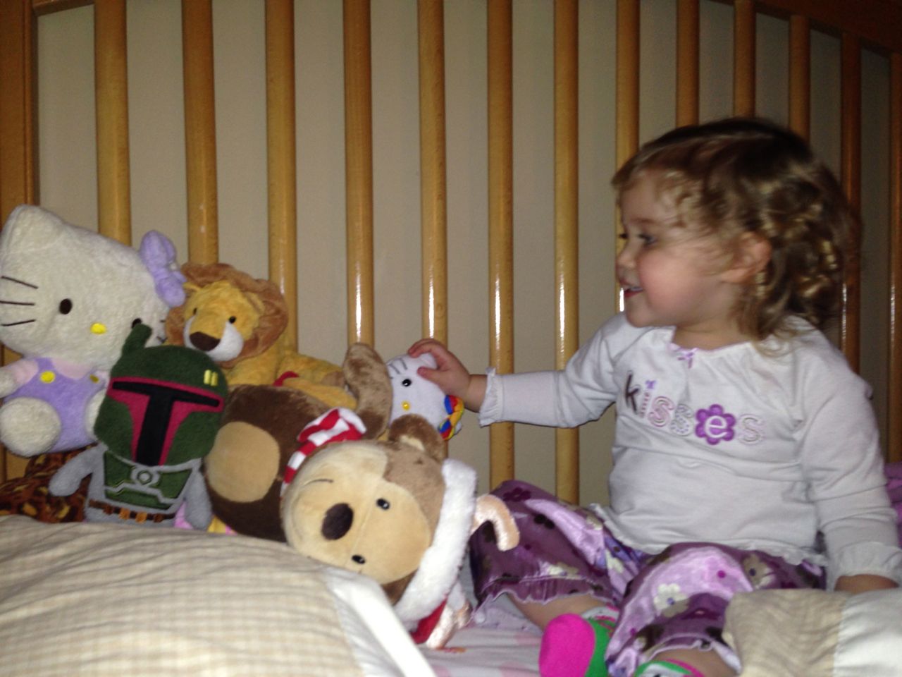 Brian surprised me this morning by creating a condensation comic in our bathroom–one panel for each year of his life, from baby, through preschool, all the way up to age 7 and first grade (looking ahead, I guess!)  I think the reasoning here was to explain to Kendall how he is much older, etc., but he seemed to really enjoy talking his way through each age and grade he’s had so far.  Tonight Kendall piled up all of her friends from the foot of the bed, to the head of the bed, and back.  She likes arranging things her own way!  She also evidently thinks she’s much too big to be wearing a bib, but c’mon Kendall, that sweater is new!  I want to keep it looking nice at least for a little while. 😉  She humored me a little, eventually.