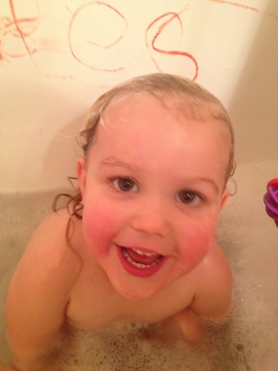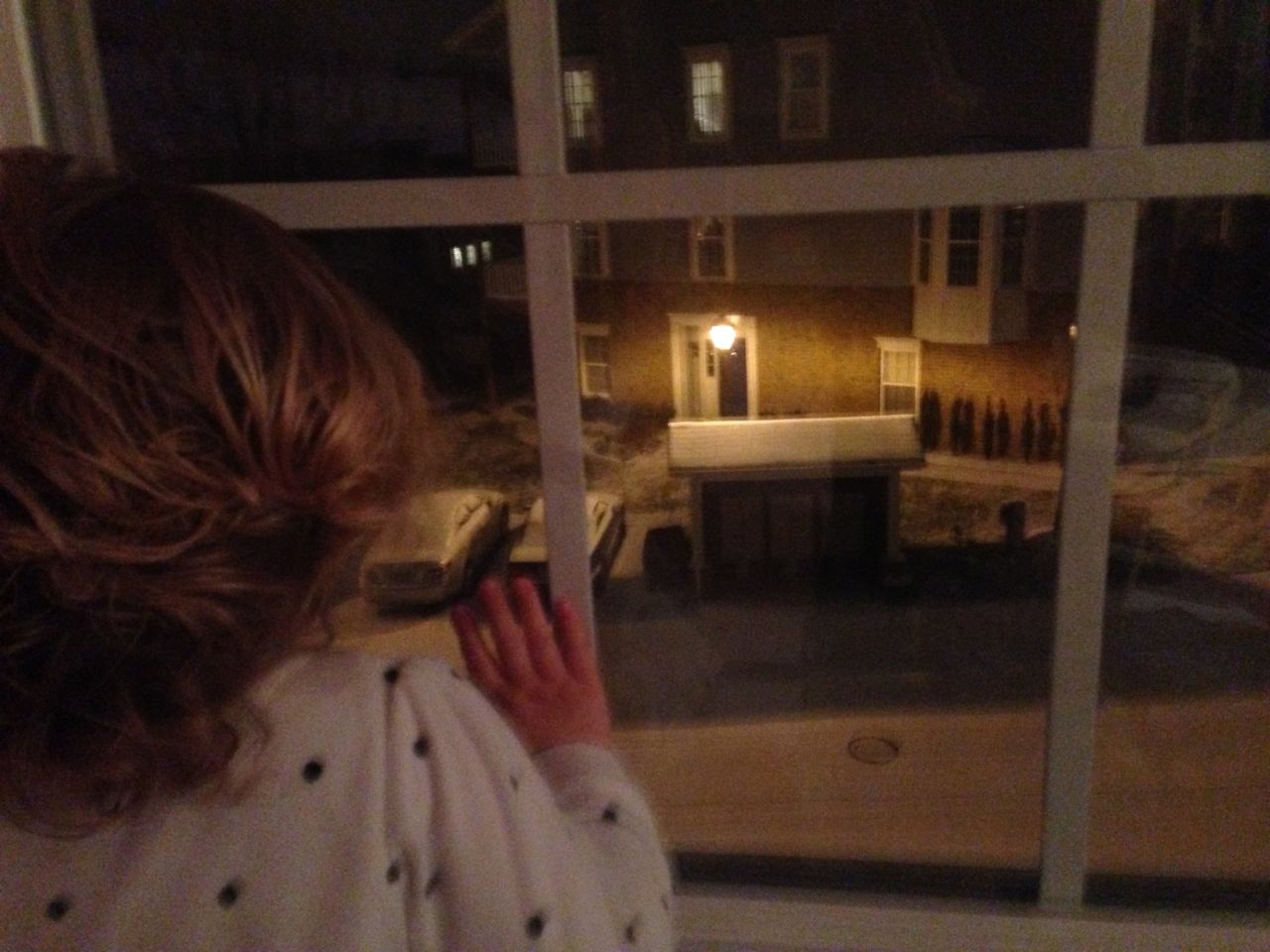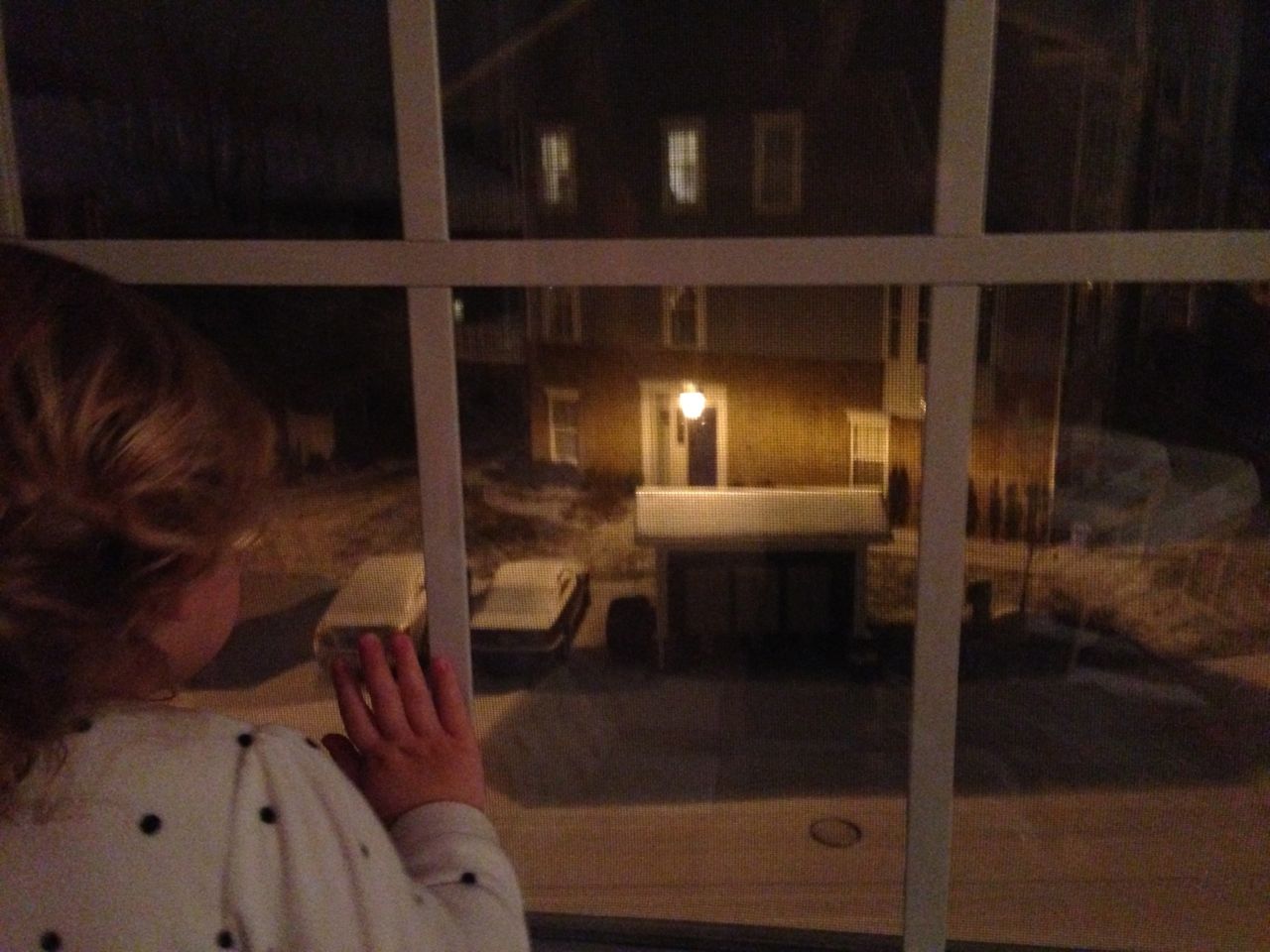 After a few false starts, the snow is finally here! We’ve had 2-hour delays and after-school activities cancelled a few times this year, but nary a flake until late this evening! School was closed today in anticipation of snowpocalypse–but that ended up being entirely unnecessary. Oh well! I was so busy trying to work, and spend time with Brian when I could look away from the computer, I hardly took any photos today at all! We did build our Lego Creator Family House set today, which is really cool–it even has a light brick that serves as the chandelier in the family room, makes the whole house glow warmly. Of course I didn’t manage to get a photo of it completed, but I did get one of Brian’s own creations that he made with the parts while we were constructing it. Kendall was surprised to see the snow after she got out of the tub! There wasn’t any when she got in. 🙂