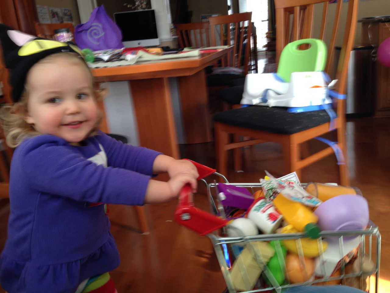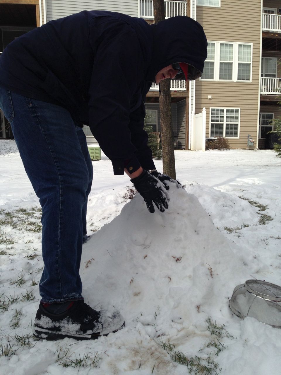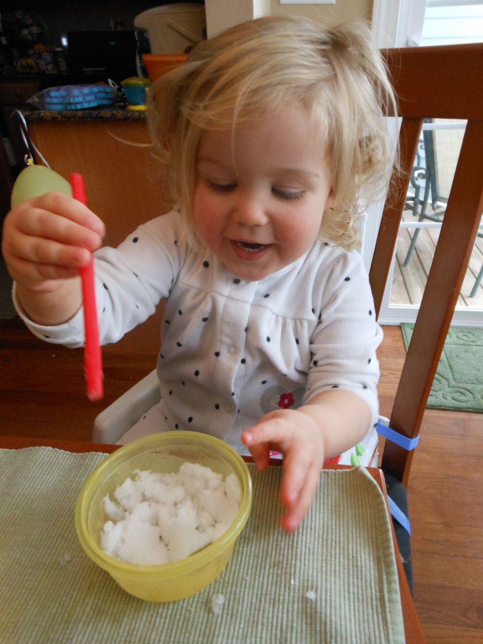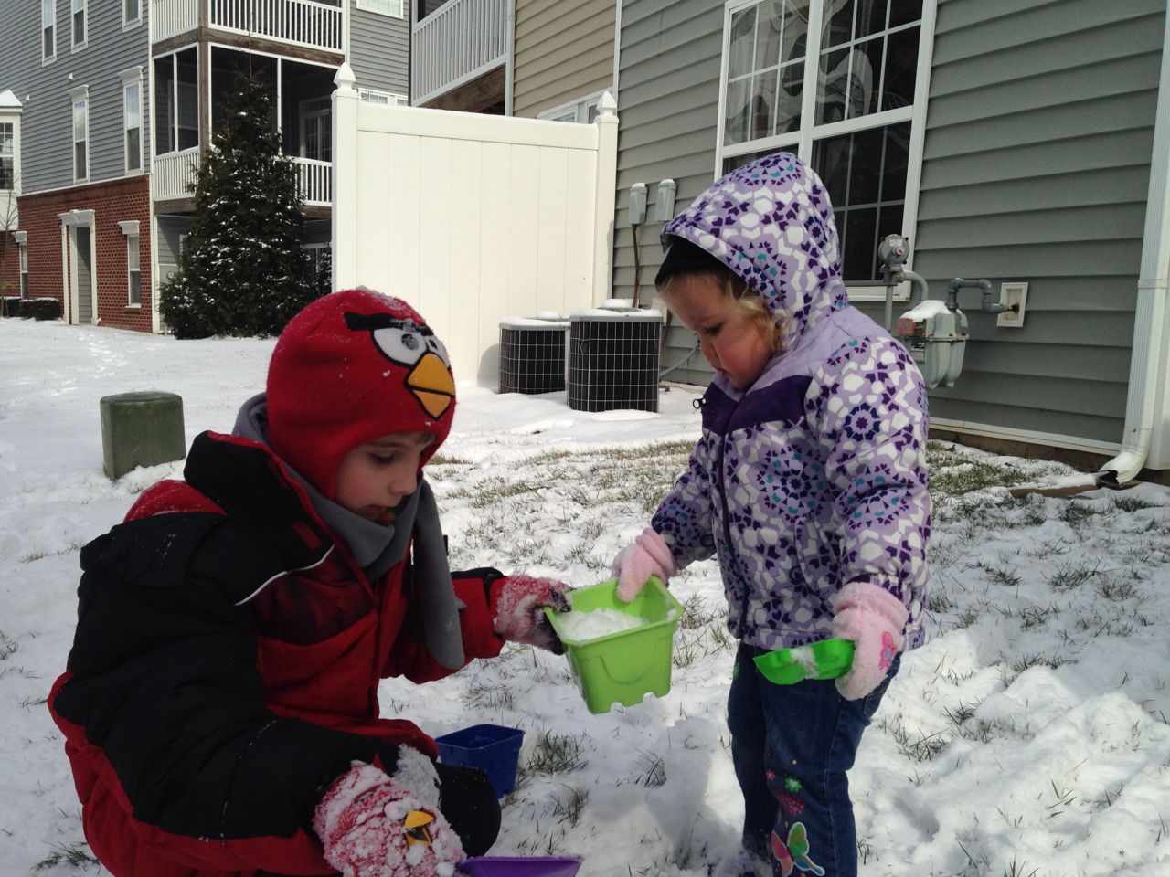 Well, we may have pooh-poohed the late-arriving snow yesterday, but it’s definitely here today! School was cancelled, so we all stayed home together. The kids were impatient to go and play in the snow, so I let them play with a bowl of it from the porch during breakfast. Once we were all bundled up, we headed outside! Brian was looking forward to making a snowman, and having a snowball fight–but this snow had other ideas! I’d never seen anything like it, practically sand-like, and would not pack one bit. So, we tried playing with it with the sand toys–not much luck there either, but it’s fun just to move it around! Instead of a snowman, we ended up with a.. snow pile? snow mound? Fun for leaning on, I guess. 😉 At least he could make snow angels! We had a lot of fun outside, but eventually we were cold and wet enough to head in. We warmed up with hot cocoa, conveniently (thanks to the k-cup variety pack we had on hand!) The kids like being able to pick their own flavor. Brian is partial to the mint hot cocoa, and Kendall is just excited to have cocoa at all. 😉 Kendall loved my old Kuronekosama (that’s Japanese for Lord BlackCat, a character in a spaghetti western sort of cartoon–impossible to explain further!) hat so much, she kept on wearing it indoors. It had turned up when we were pulling out all the hats, gloves, and scarves we could find. The kids went all out playing in the play kitchen, and Brian made up his own restaurant called Saf Mac (that’s pronounced “Chef Make”–because the chef makes your food). 🙂 He came up with a good number of menu items and recipes, and created his own menu. Very cool, Brian! We made some snowflake stamp art, and watched Daddy shovel the driveway. I was really glad we had recently stocked up on convenience foods from Trader Joe’s–it was nice being able to surprise the kids with corn dogs for lunch!
