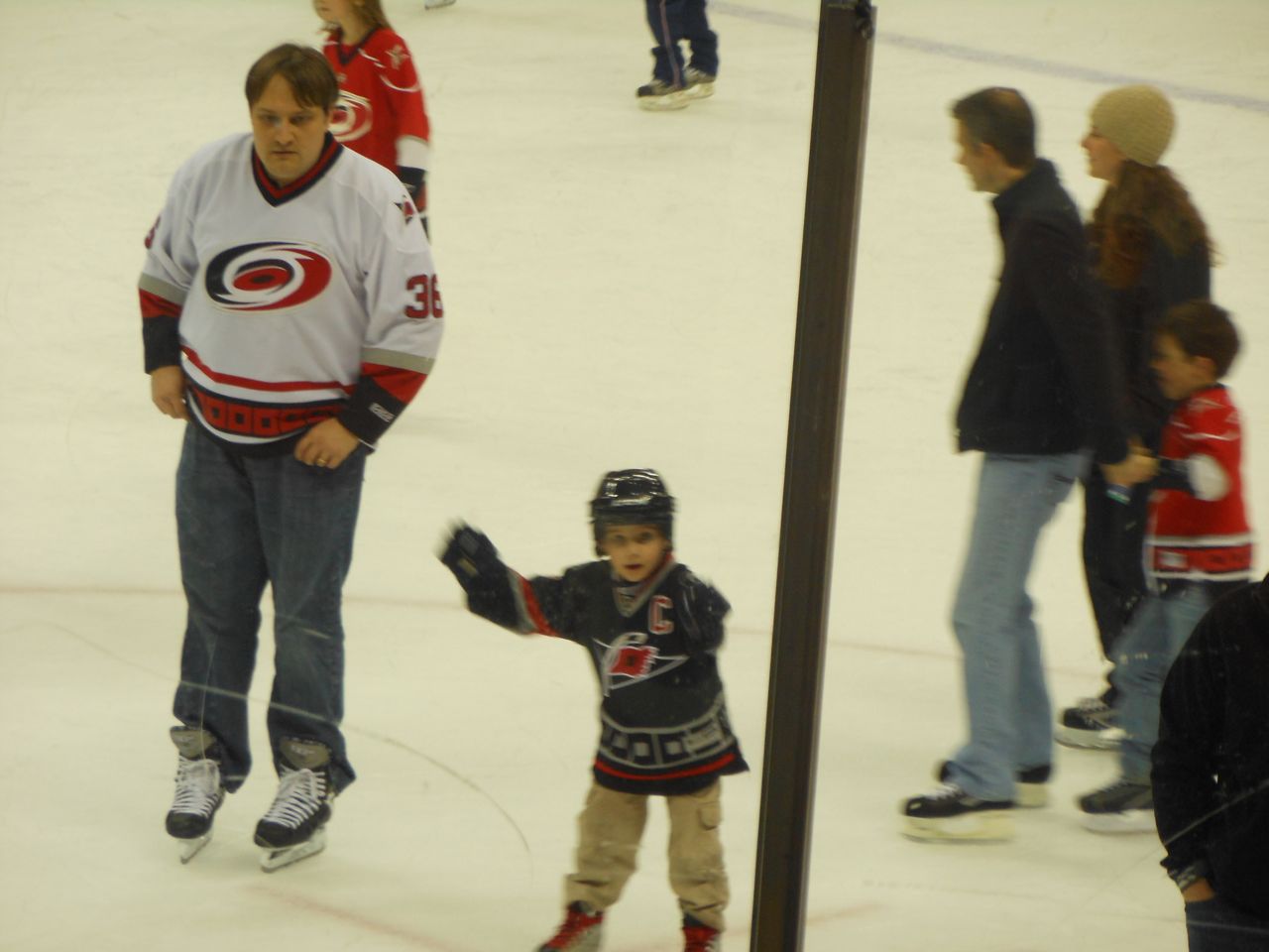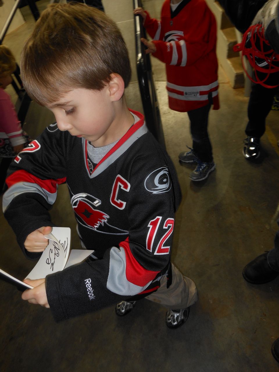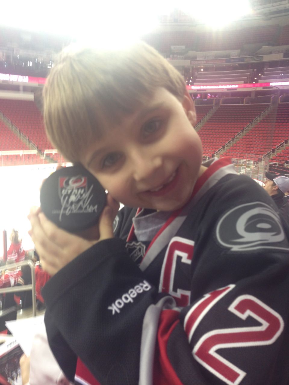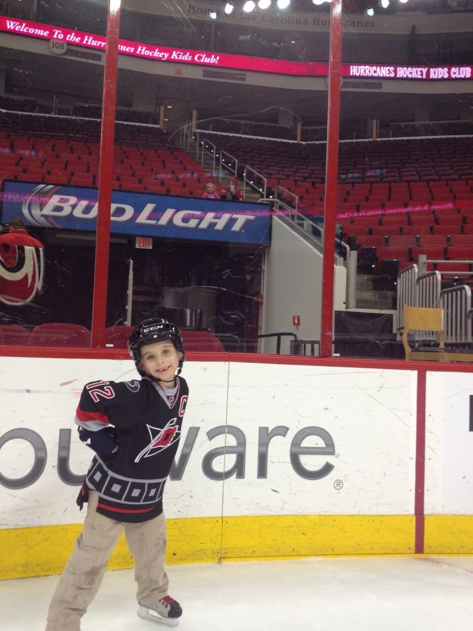 Tonight was the Hurricanes Kids’ Club party at PNC Arena! This was a pretty special event for Brian. We got to tour all around some of the behind-the-scenes areas at the stadium, including the locker room. Brian won an autographed puck in the raffle, and he collected autographs from some of his favorite players, and Stormy. But most importantly, he got to skate on the very ice where the ‘Canes play. This was a pretty big deal for him! Kendall and I watched from the stands, and we had a good time watching the boys come around and around the ice. Brian seemed to follow Stormy more than anything else! He had a blast, and I’m sure this is one of those peak experiences he’ll remember for a long time. 🙂