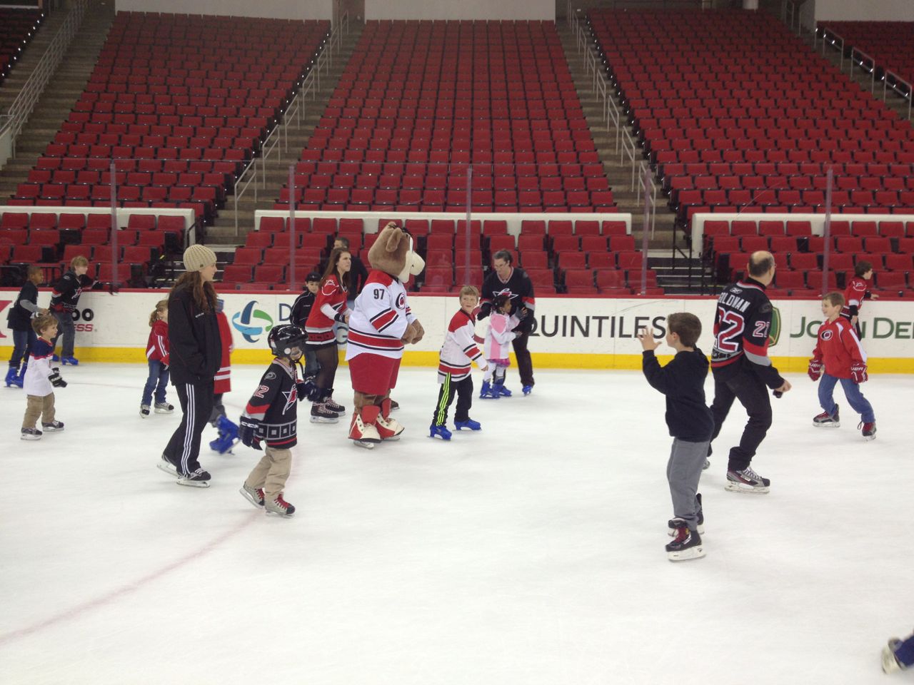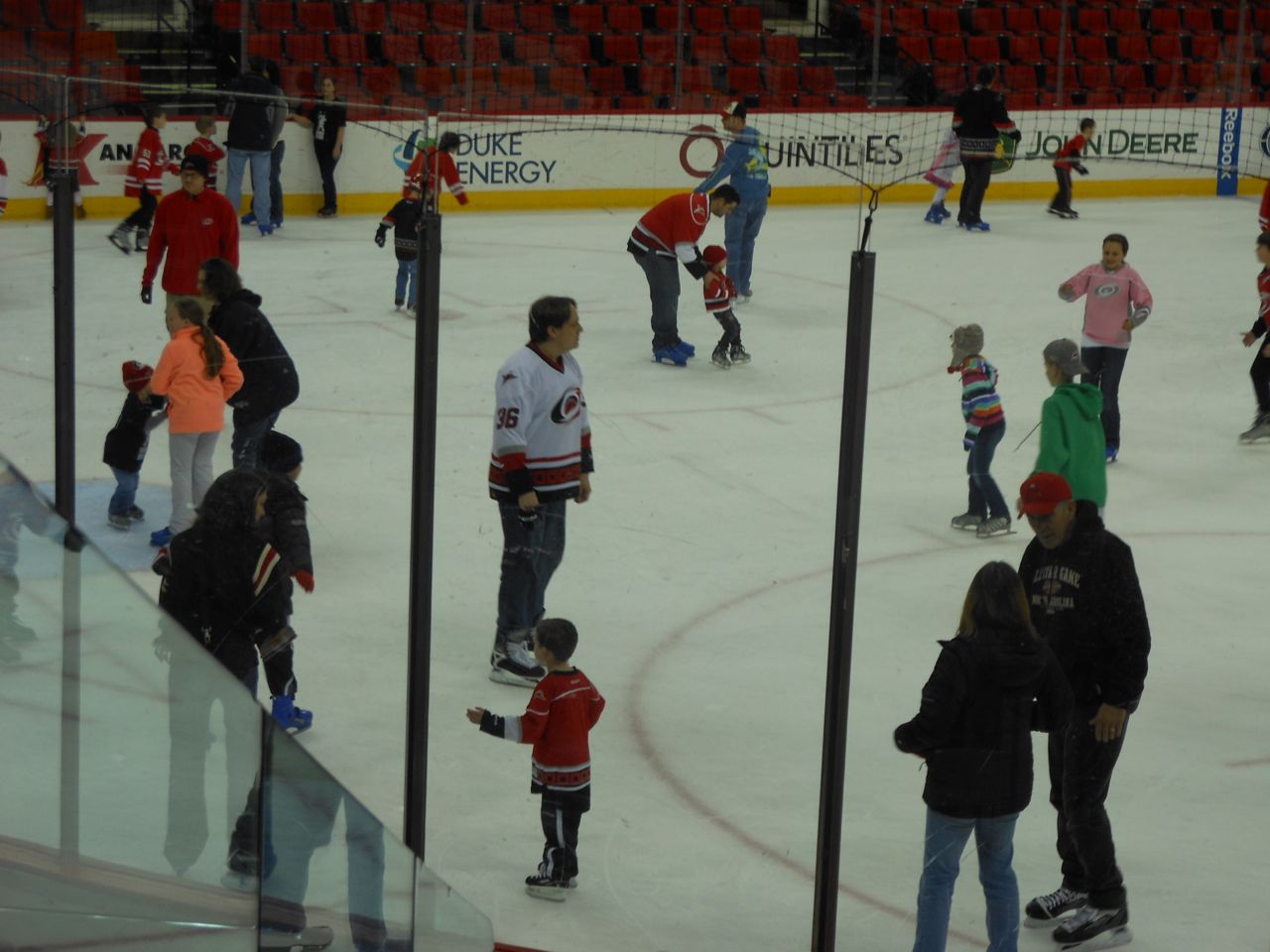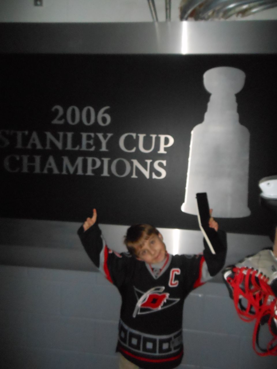 Tonight was the Hurricanes Kids’ Club party at PNC Arena! This was a pretty special event for Brian. We got to tour all around some of the behind-the-scenes areas at the stadium, including the locker room. Brian won an autographed puck in the raffle, and he collected autographs from some of his favorite players, and Stormy. But most importantly, he got to skate on the very ice where the ‘Canes play. This was a pretty big deal for him! Kendall and I watched from the stands, and we had a good time watching the boys come around and around the ice. Brian seemed to follow Stormy more than anything else! He had a blast, and I’m sure this is one of those peak experiences he’ll remember for a long time. 🙂