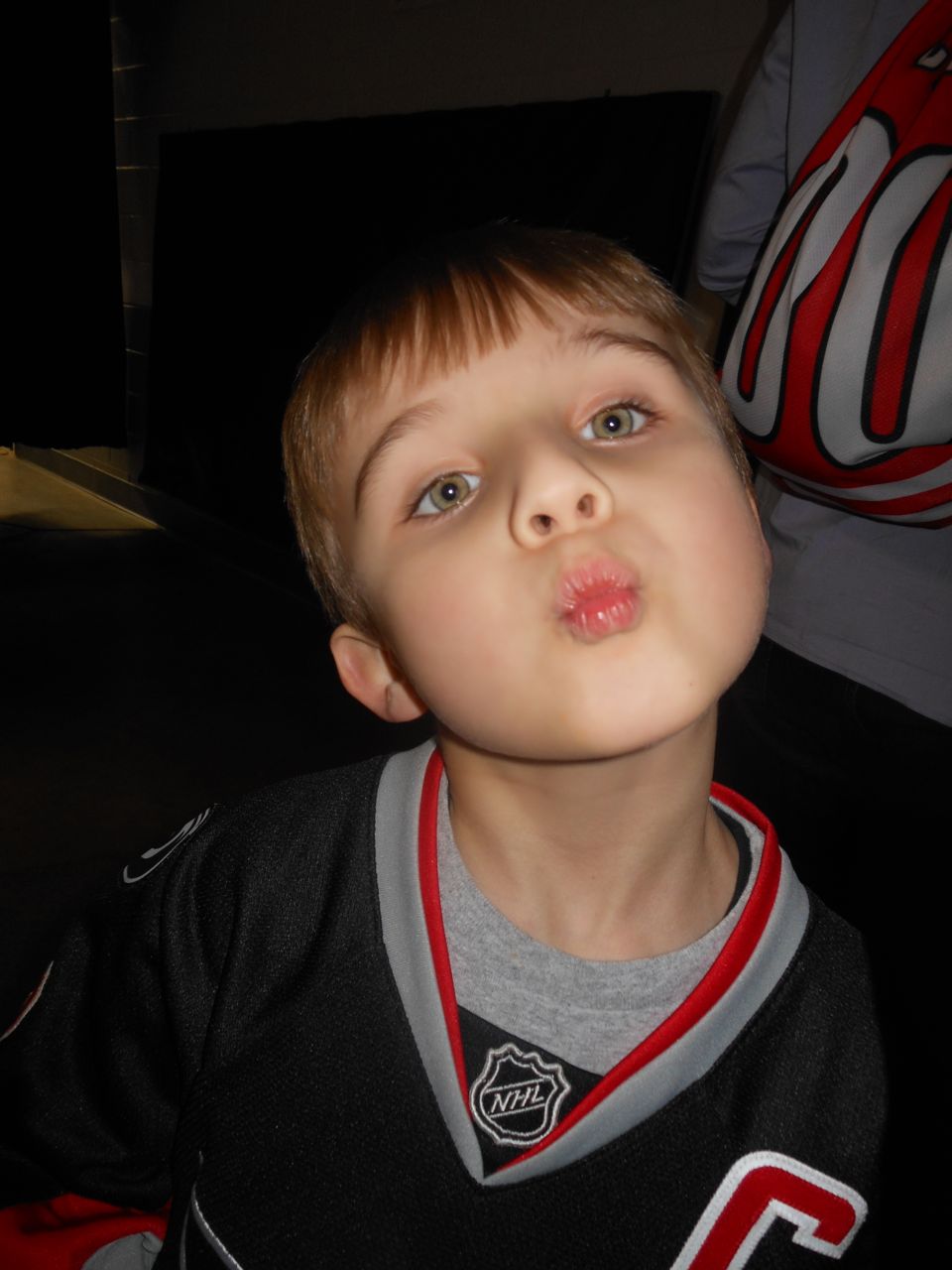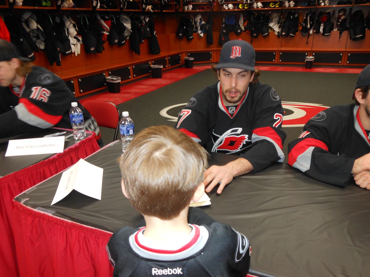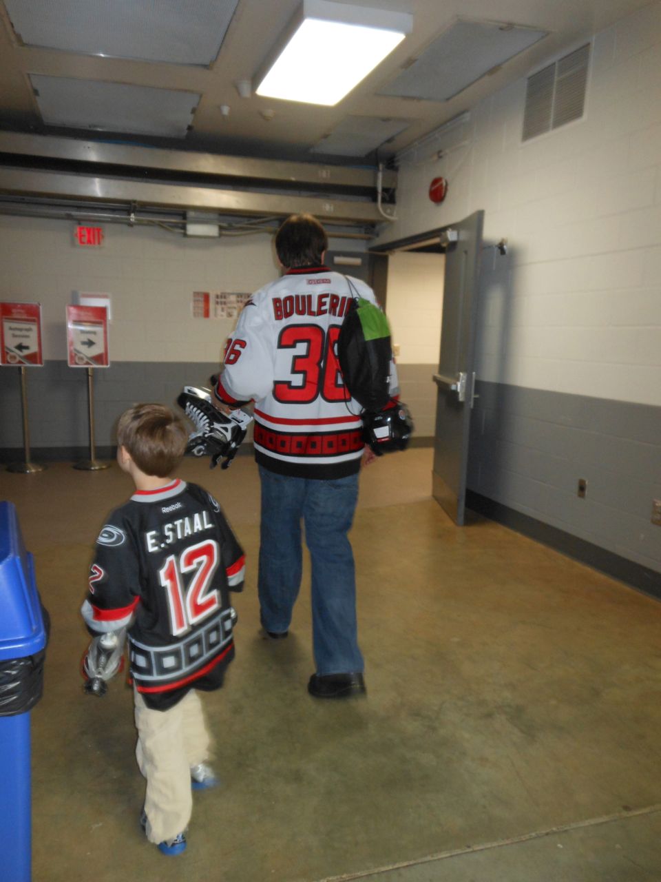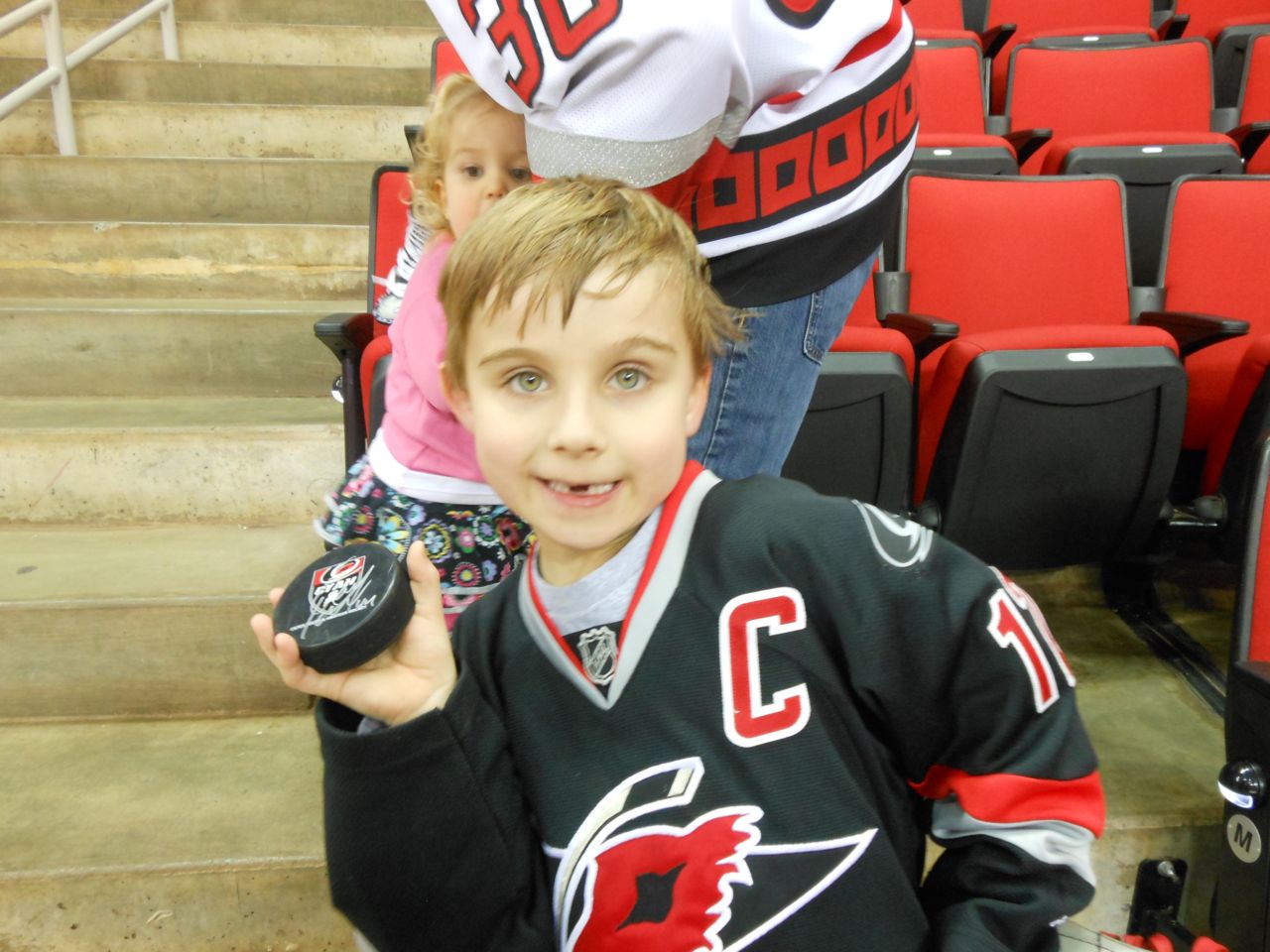 Tonight was the Hurricanes Kids’ Club party at PNC Arena! This was a pretty special event for Brian. We got to tour all around some of the behind-the-scenes areas at the stadium, including the locker room. Brian won an autographed puck in the raffle, and he collected autographs from some of his favorite players, and Stormy. But most importantly, he got to skate on the very ice where the ‘Canes play. This was a pretty big deal for him! Kendall and I watched from the stands, and we had a good time watching the boys come around and around the ice. Brian seemed to follow Stormy more than anything else! He had a blast, and I’m sure this is one of those peak experiences he’ll remember for a long time. 🙂