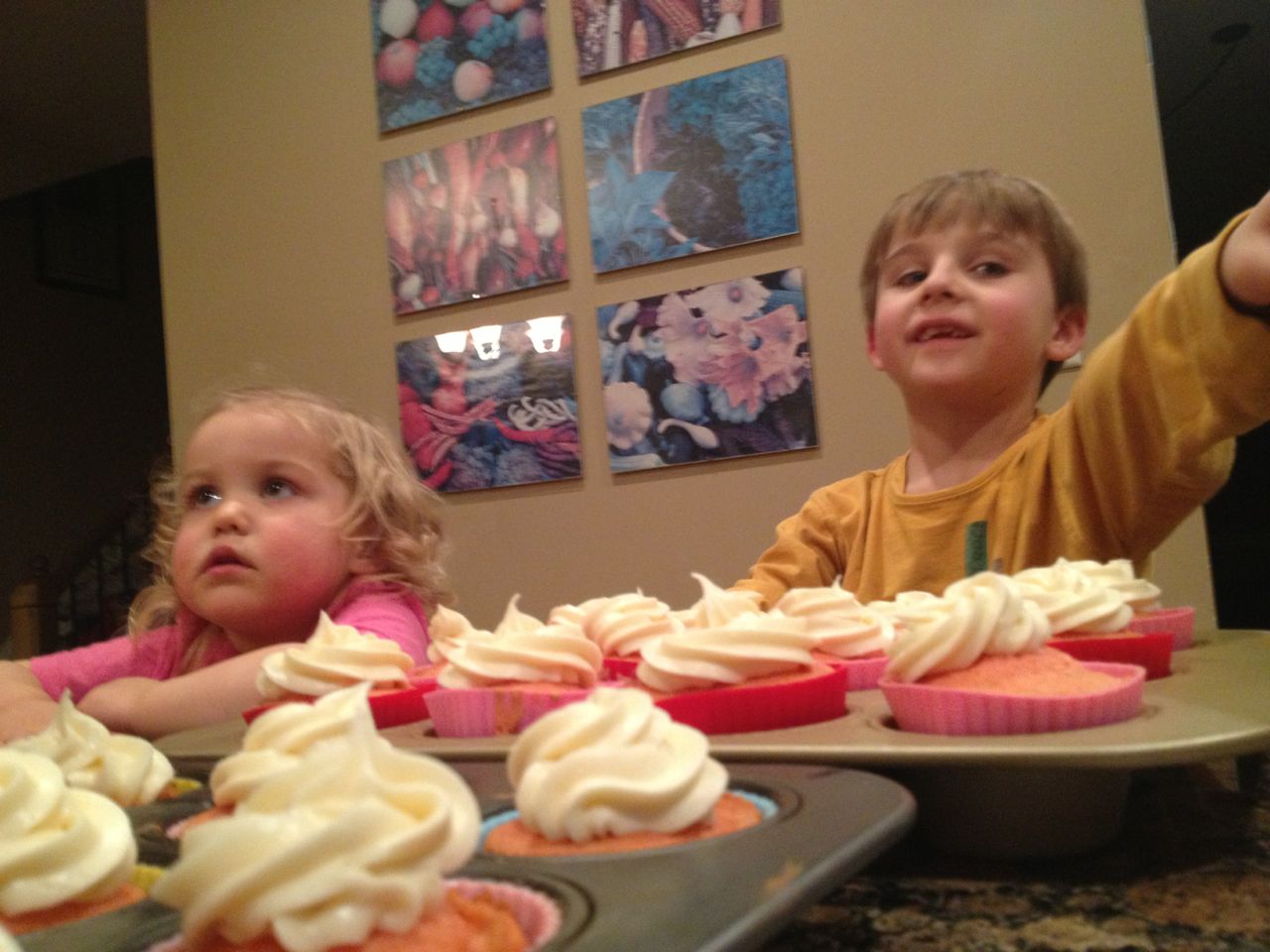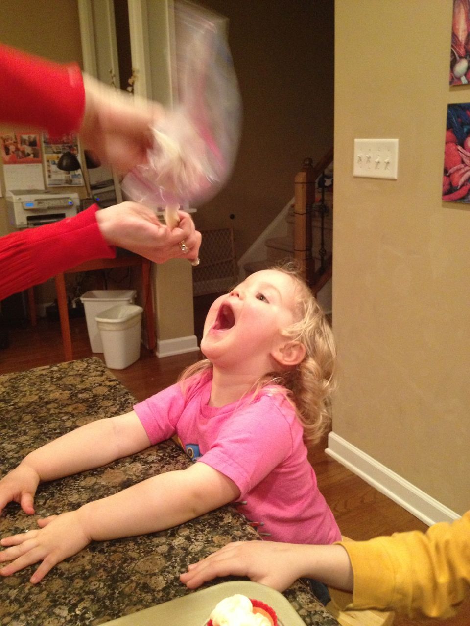 Today was Valentine’s Day, and YET ANOTHER SNOW DAY. I gotta say, I’m pretty much over snow days–after a little while trying to work and making it through a couple video conferences, I just called it a day and played with the kids. Luckily, I had purchased everyone’s Valentine’s presents well in advance, so being housebound due to the snow this week didn’t cause me any problems. They got some fun sweets-themed games, like a cookie-match game, and Kendall got a shape/color matching game that looks like a heart shaped box of chocolates! Brian got the complete series 2 set of Star Wars Angry Birds (yay eBay!) and they got a couple more baskets of play food, since those are such perennial favorites. Kendall wore her cute Valentine outfit today, even though she stayed home–the tunic is made to be oversized, so maybe she can wear it again next year. The kids were a little concerned that their classroom’s Valentine activities couldn’t happen today, but I reassured them that of course they will get rescheduled. The kids enjoyed playing with Play-Doh today (Kendall is partial to the waffle maker) and the Star Wars toys. Somehow they managed to bring their Anywhere Chairs downstairs–and used them as a base for playing Star Wars. The kids appreciated their cards–Brian really loved his talking robot card! We let the kids play with their plasma cars in the garage some just to get out some of the extra wiggles. I tried out using Vine to make some six-second mini movies of the kids’ antics. This evening we made cupcakes–I had some strawberry cake mix and some cream cheese to make frosting with, plus a can of Valentine sprinkles and my heart-shaped liners, so we got it done without a trip to the store. 😉 The kids enjoyed decorating, and Brian begged and begged for me to pipe some icing into his mouth until I gave in–of course I then had to do the same for Kendall. I called these my “Valentine Surprise” cupcakes–when nobody was looking, I hid some semi-sweet chocolate chips in the bottom of the cupcake cups (a pretty tricky feat with the kids right there!) Brandon managed to sneak out to visit the pharmacy today–pretty sure that’s how he managed to get some extra contraband into the house. He gave the kids their presents from him while the cupcakes baked–both Reese’s related candy+plush toy combinations. Hmm, hoping to snag some for yourself, I see how it is! 😉 The kids loved their candy, especially Kendall, who got pretty crafty about opening up her own Reese’s on the side–I think she got a lot more than we planned on giving her..! Well, after all that extra sugar, nobody was going to bed on time, so we let them do Kendall’s Hello Kitty puzzle. Finally, trying to go to bed, Brian was struck with artistic inspiration, and created this Valentine Shrine in his room, with his Curious George Valentine book, any red things he could find, and the kids’ new Mameshiba friend who joined us today, the red Chili Bean. By the time we got the kids to bed, we were exhausted. We had a chuckle over Brandon’s present to me, half-price markdown drugstore chocolate, bought on the day of. Weak and sad, any other year–but right now, I’m just so glad and relieved he’s gotten his diagnosis of ADHD and a prescription–I’m really hopeful this will help things.