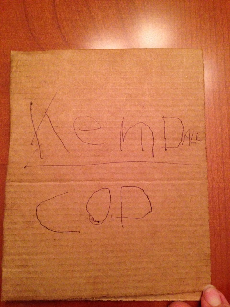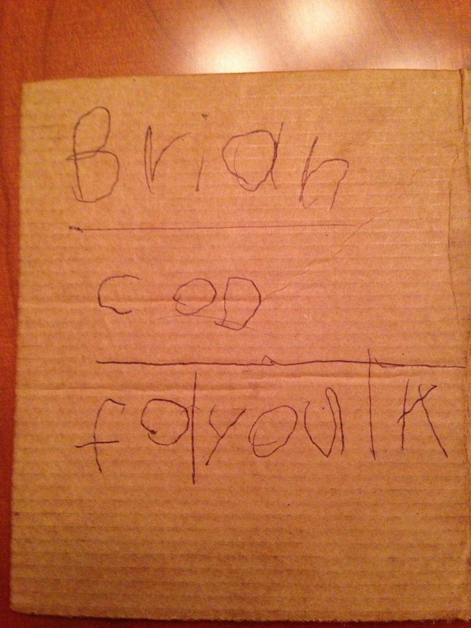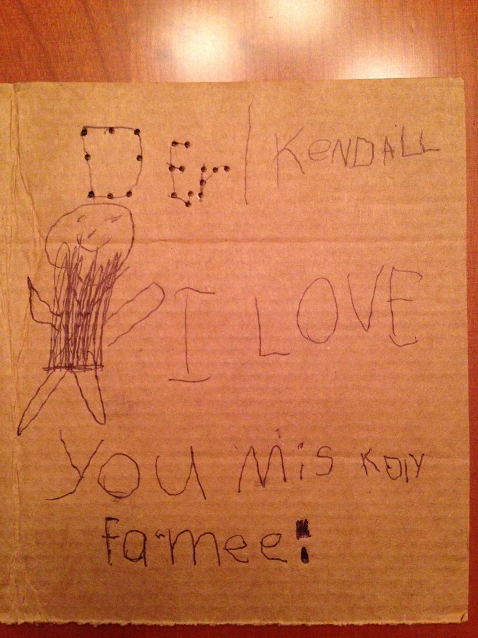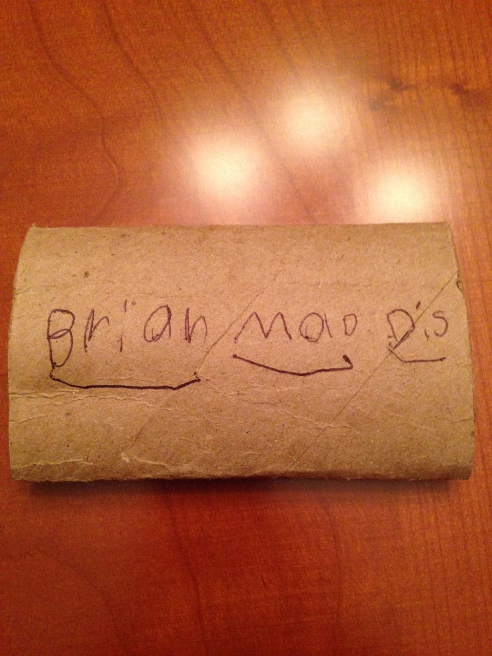We went to see the Lego Movie again! This time we brought Kendall along as well for a matinee showing. It was just as good the second time, and Kendall seemed to really get into it! Also included, silly Brian with fried-egg eyes, some of Brian’s valentine cards that he made us, Kendall actually eating some spinach (!) at Noodle & Company, a paper-and-glue plane that Brian and I made, and the kids riding plasma cars in the garage. Brian’s sounded-out spellings can be tricky to decipher for us grownups at times, but once you know “cod” = “card” and “valtips” = “Valentines” you’ll be on your way. I love the “Brian Mad Dis” (Brian Made This) with our initials on the TP roll, that’s just priceless. 😀 Brandon said he worked very hard punching the dots into the cardboard, being careful to make them on the lines and evenly spaced.