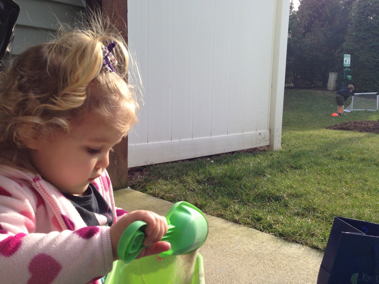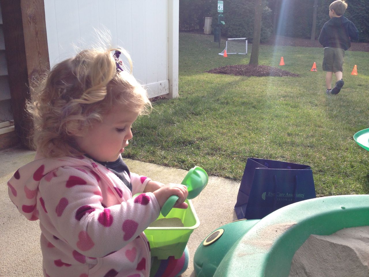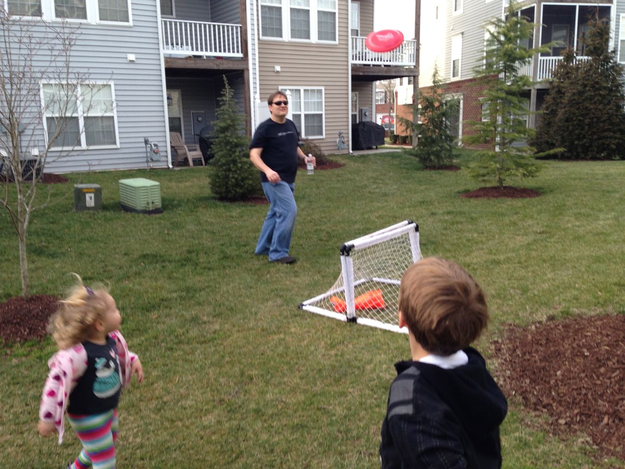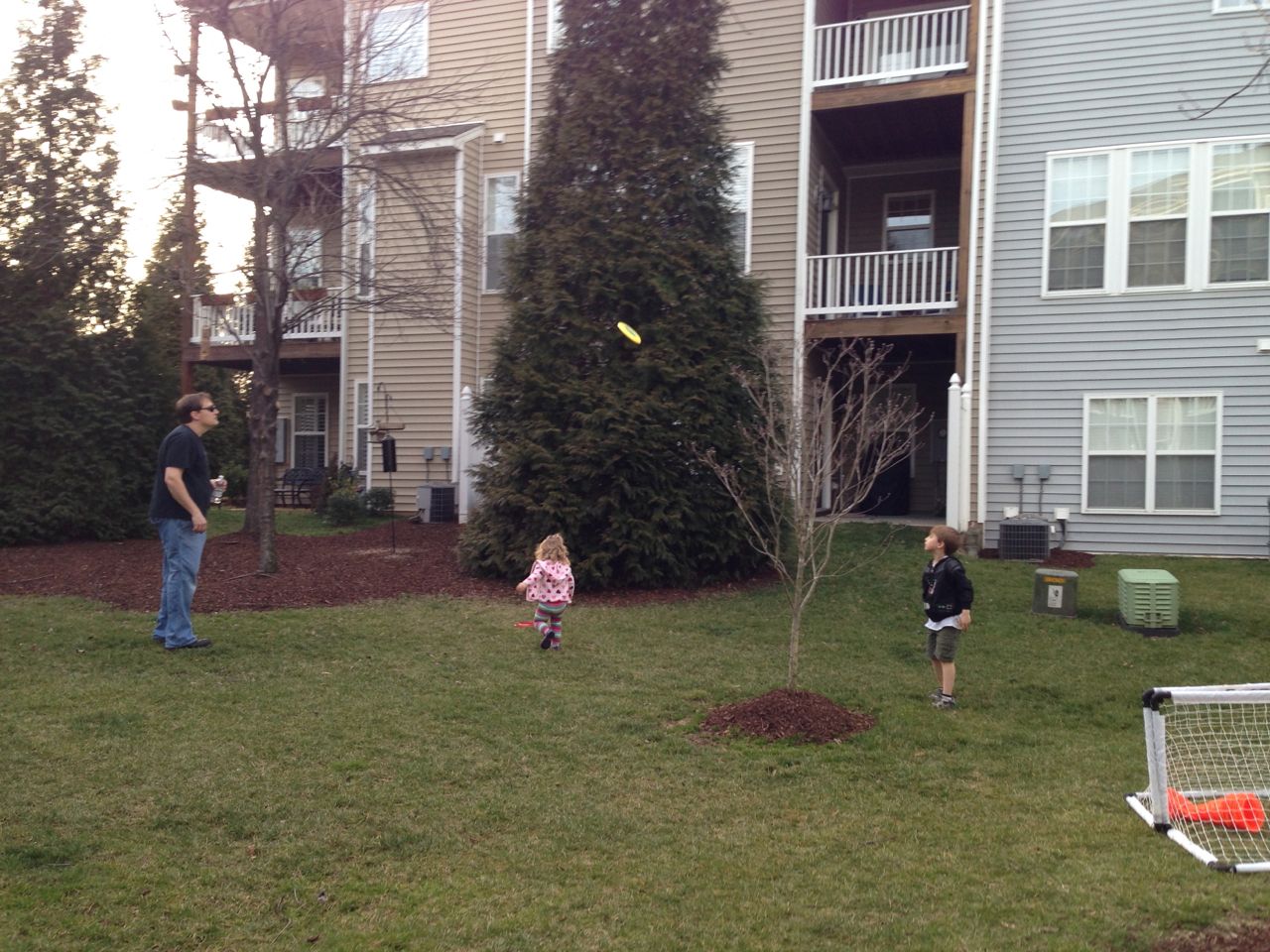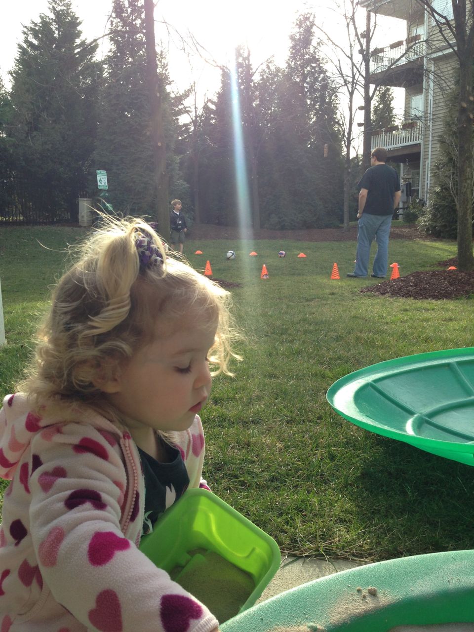 We’re all so grateful for some decent weather, we decided to play outside this afternoon! Brandon and Brian played soccer while Kendall and I played in the sandbox. We added some smooth river rocks to the sandbox, and Kendall had a good time cooking with those.. She was pretending all the pinkish rocks were strawberries. I asked her if the white ones were coconut, and she very seriously told me “nooooo!” Later, Kendall wanted to get into the soccer game, and she had fun, although she might have frustrated Brian a bit at first! Eventually, like the rest of us, he can’t help but laugh at her antics. We switched over to Frisbee which is always entertaining–we never know where the kids are going to aim! Sometimes even directly at your humble photographer. 😉