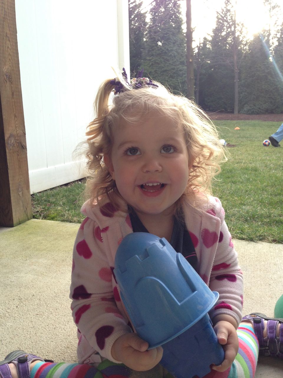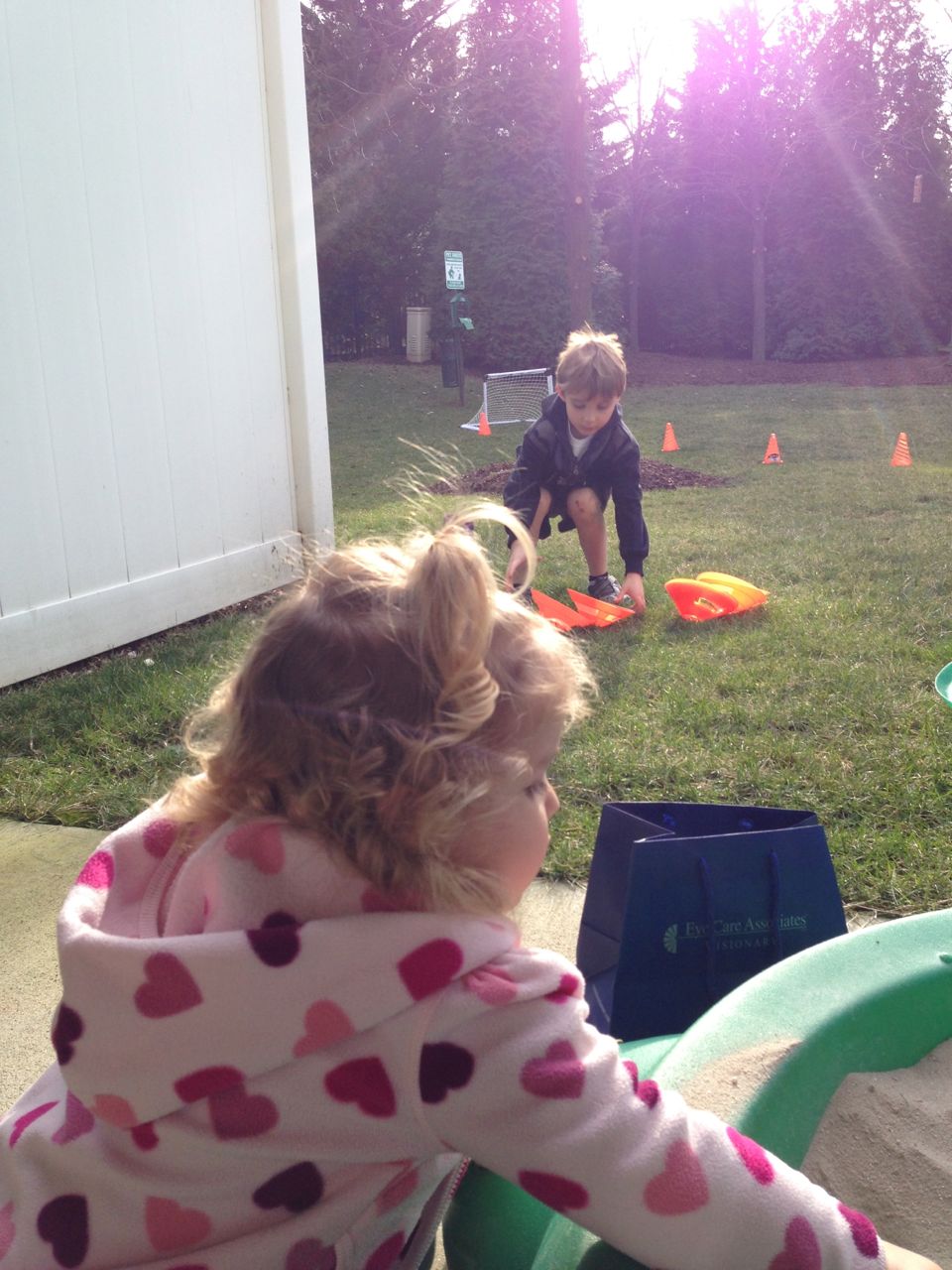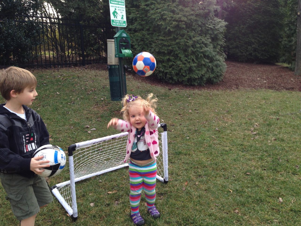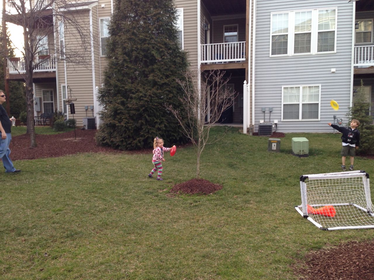 We’re all so grateful for some decent weather, we decided to play outside this afternoon! Brandon and Brian played soccer while Kendall and I played in the sandbox. We added some smooth river rocks to the sandbox, and Kendall had a good time cooking with those.. She was pretending all the pinkish rocks were strawberries. I asked her if the white ones were coconut, and she very seriously told me “nooooo!” Later, Kendall wanted to get into the soccer game, and she had fun, although she might have frustrated Brian a bit at first! Eventually, like the rest of us, he can’t help but laugh at her antics. We switched over to Frisbee which is always entertaining–we never know where the kids are going to aim! Sometimes even directly at your humble photographer. 😉