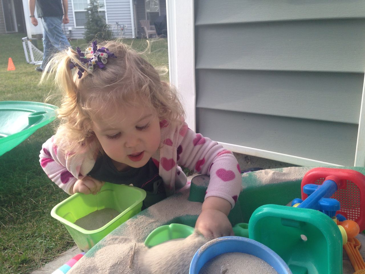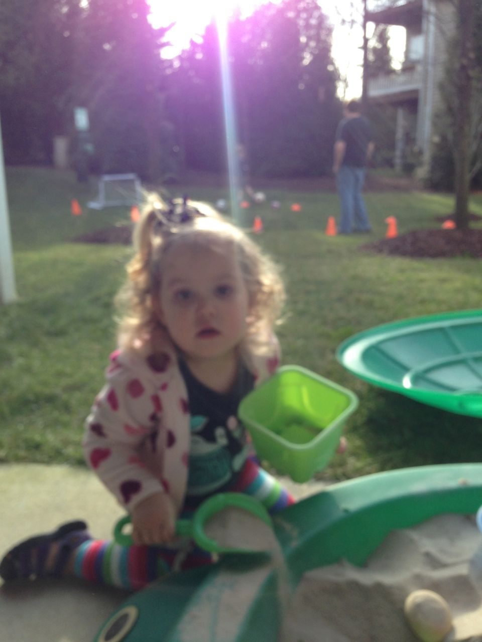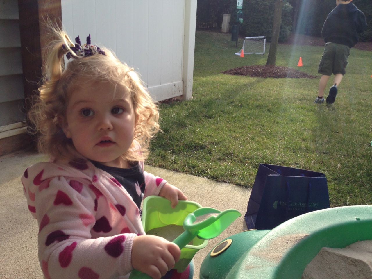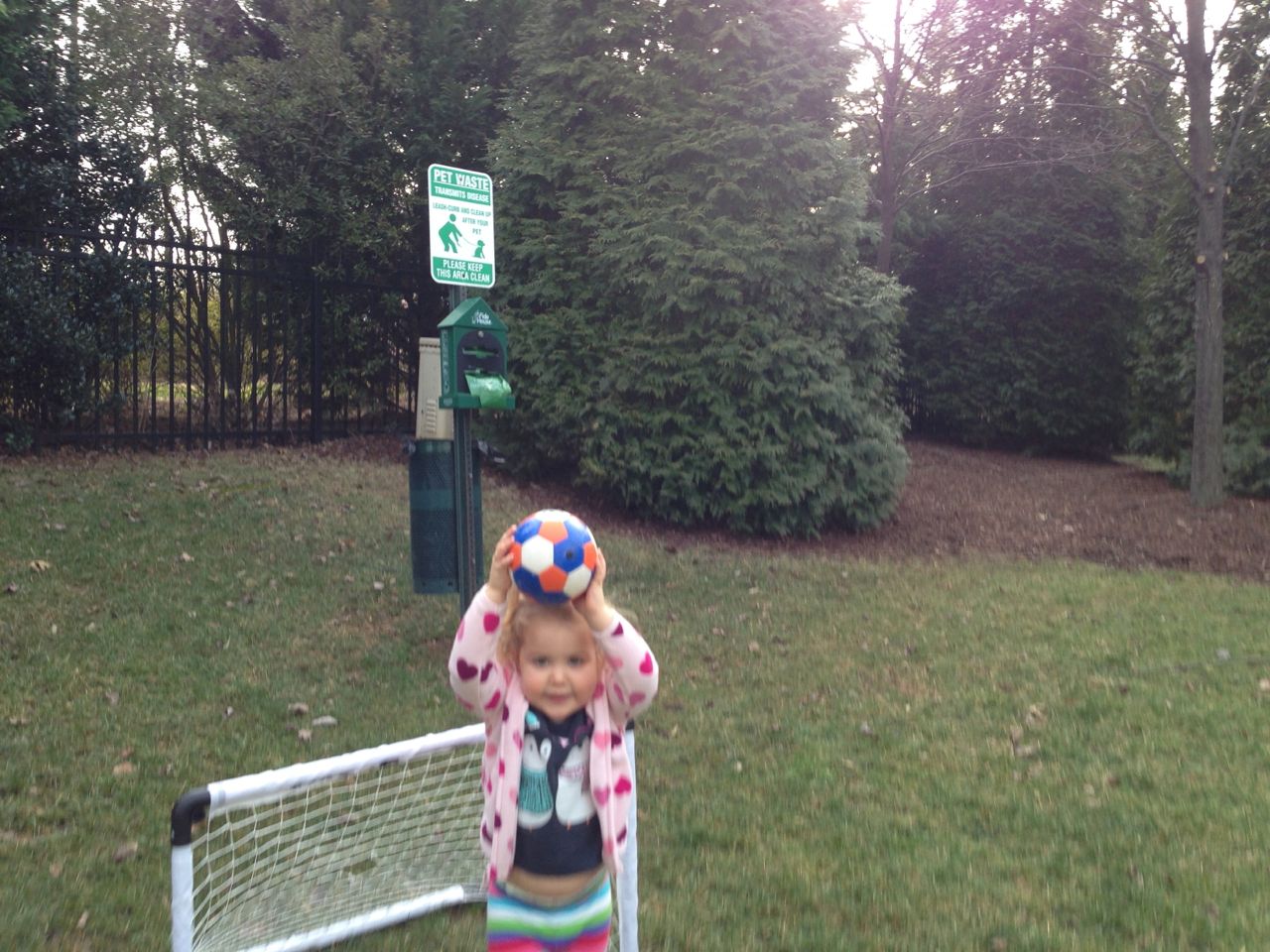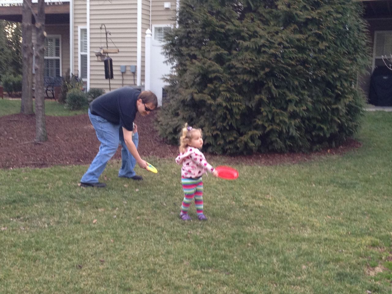 We’re all so grateful for some decent weather, we decided to play outside this afternoon! Brandon and Brian played soccer while Kendall and I played in the sandbox. We added some smooth river rocks to the sandbox, and Kendall had a good time cooking with those.. She was pretending all the pinkish rocks were strawberries. I asked her if the white ones were coconut, and she very seriously told me “nooooo!” Later, Kendall wanted to get into the soccer game, and she had fun, although she might have frustrated Brian a bit at first! Eventually, like the rest of us, he can’t help but laugh at her antics. We switched over to Frisbee which is always entertaining–we never know where the kids are going to aim! Sometimes even directly at your humble photographer. 😉